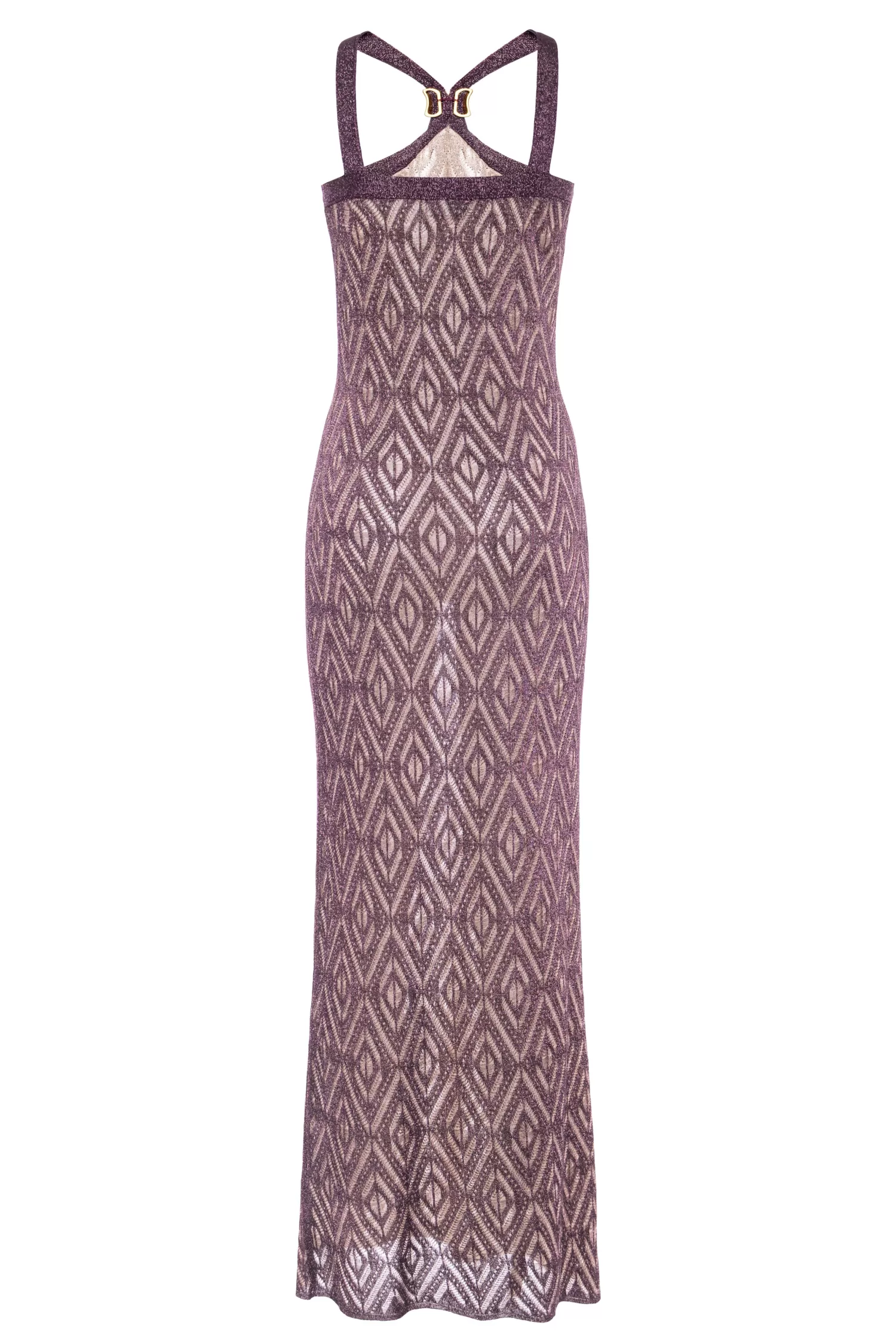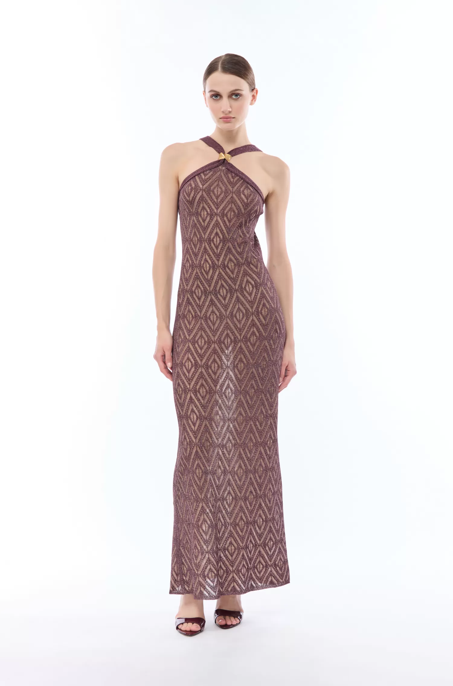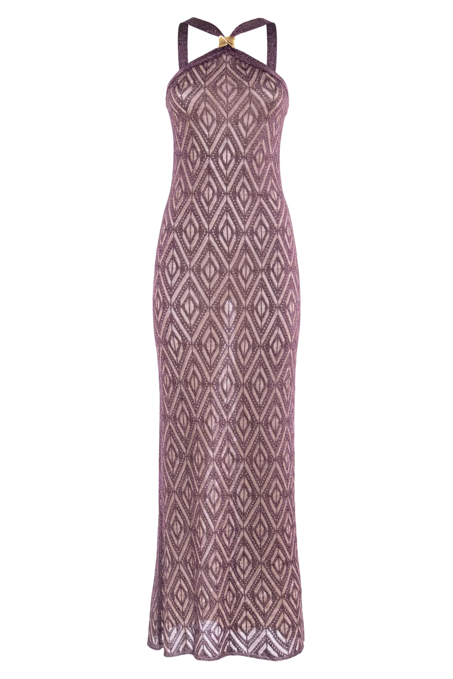 Abito lungo in misto viscosa, maglia con filato lurex, motivo decorativo geometrico, elemento metallico satinato sul collo.