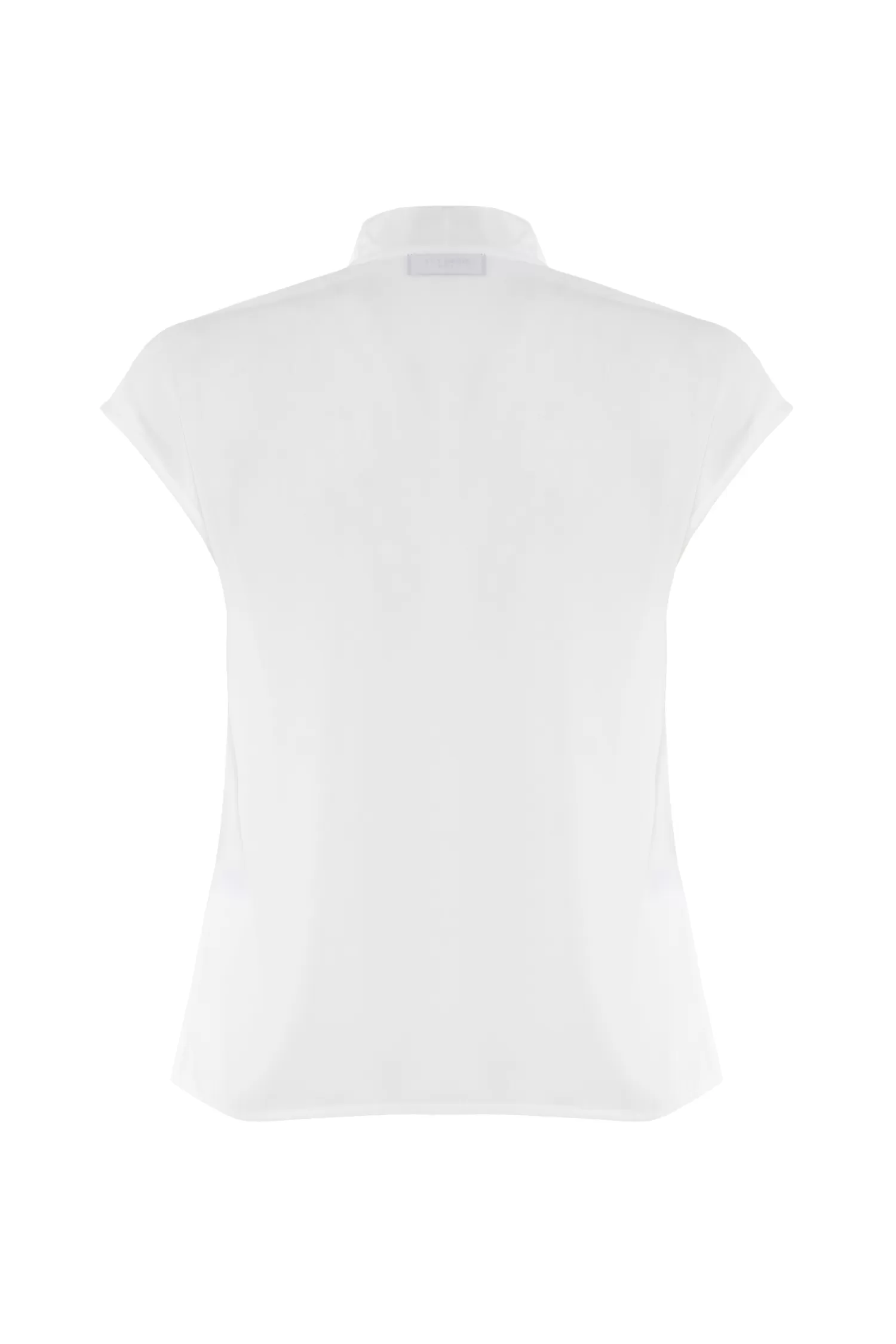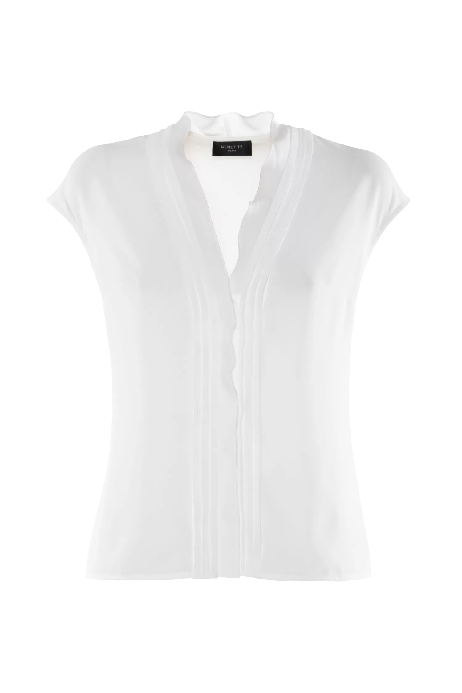 Blusa caratterizzata da profondo scollo a V con bordatura in delicata rouche e pieghe verticali lungo il busto.