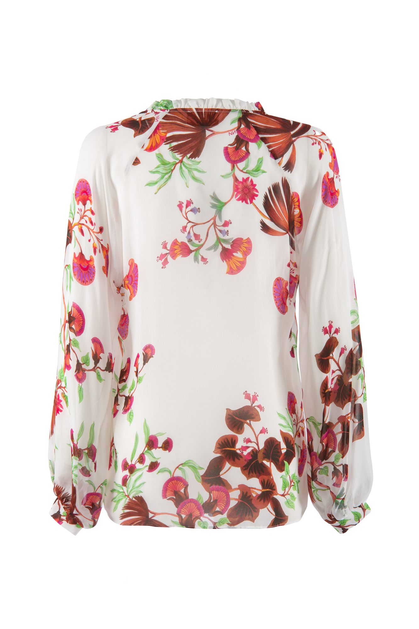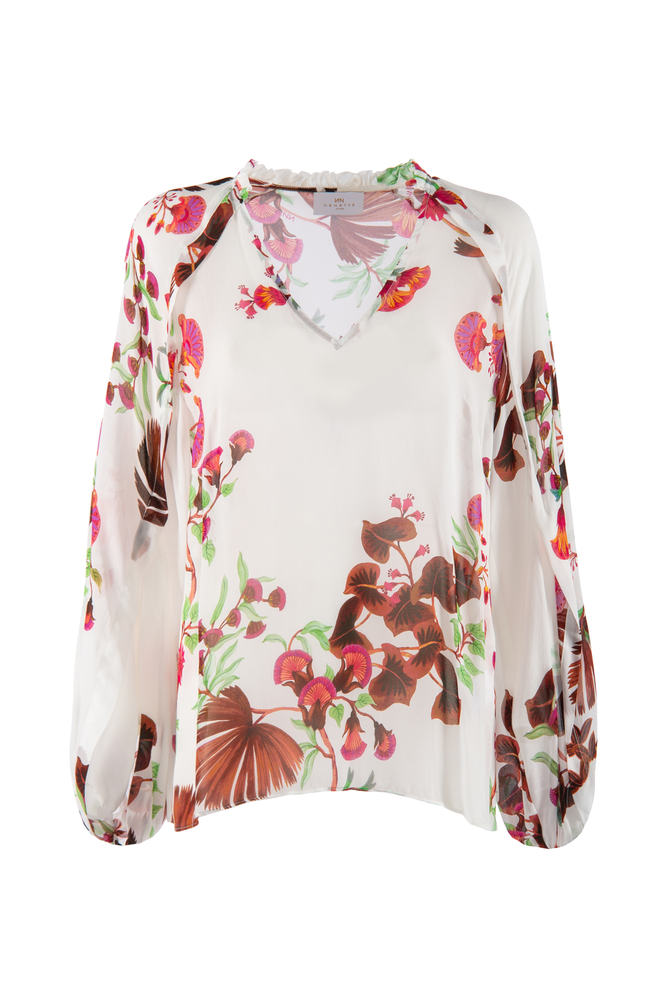 blusa in georgette di viscosa manica lunga leggermente ampia sul fondo, stampa botanica