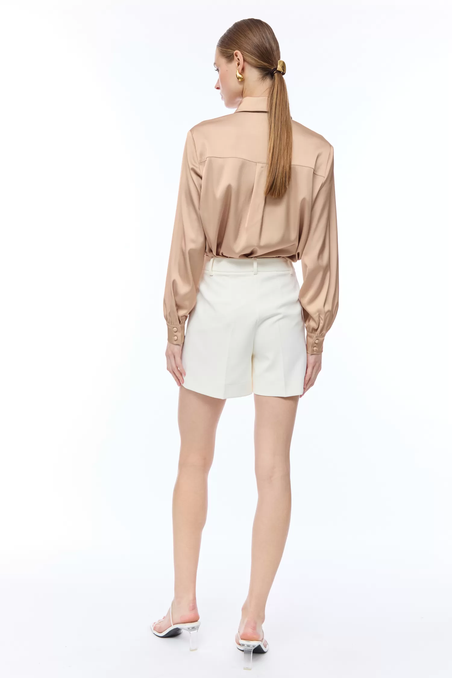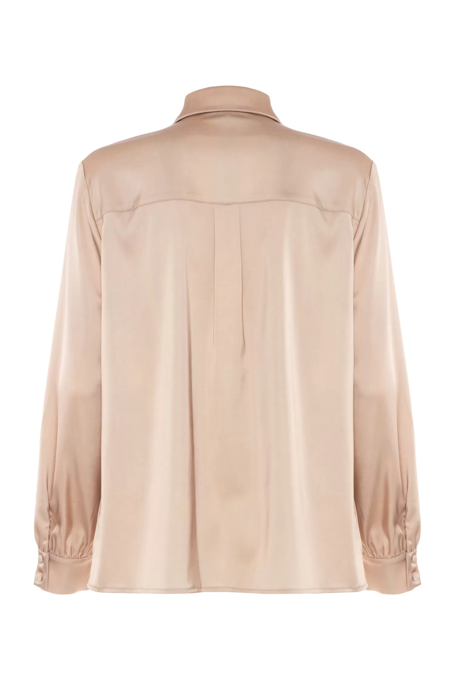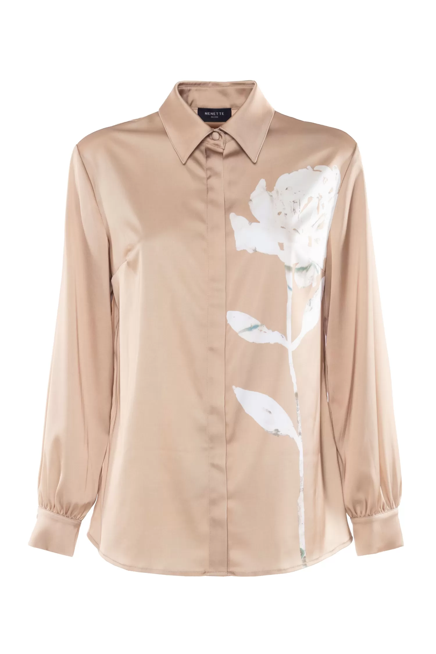 Camicia in raso con stampa macrofiore, vestibilità morbida, abbottonatura frontale nascosta, colletto a punta classico.