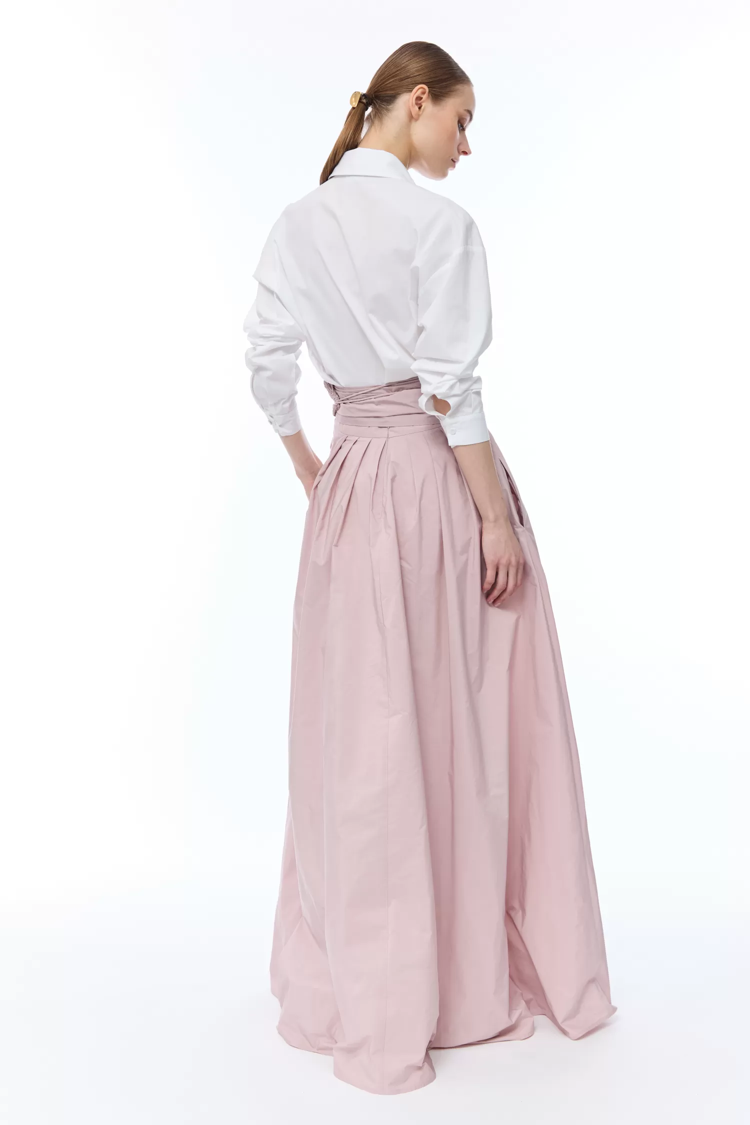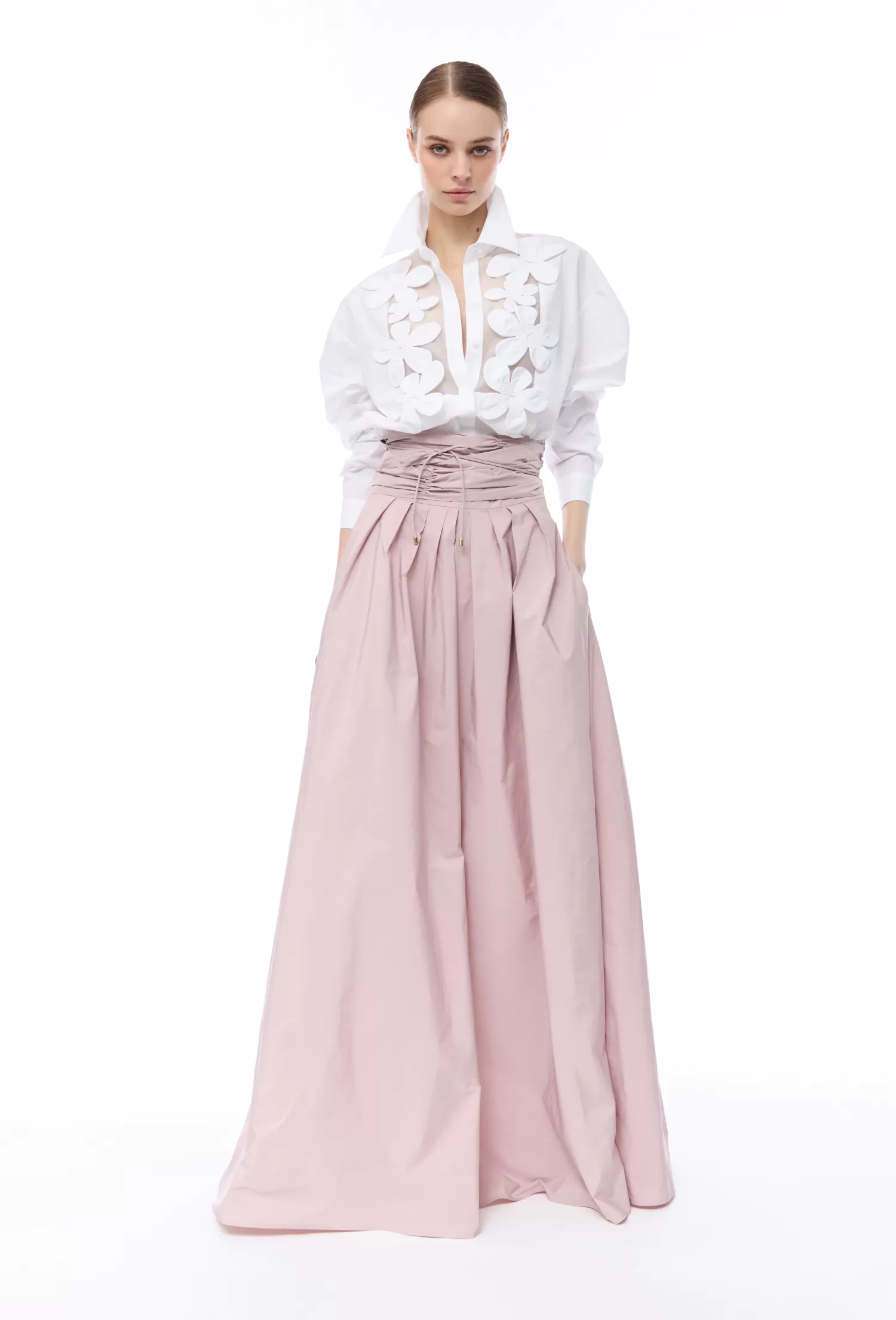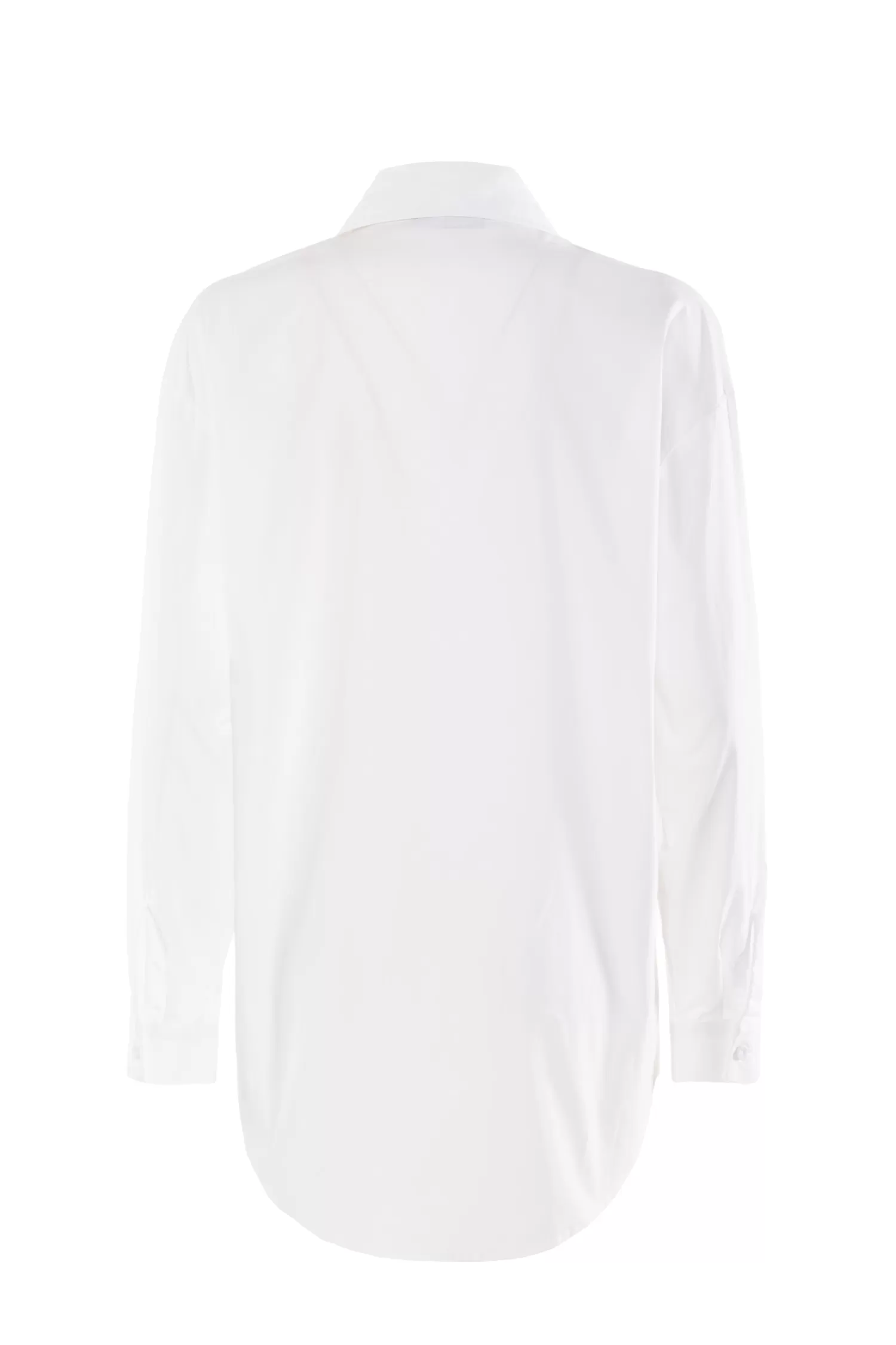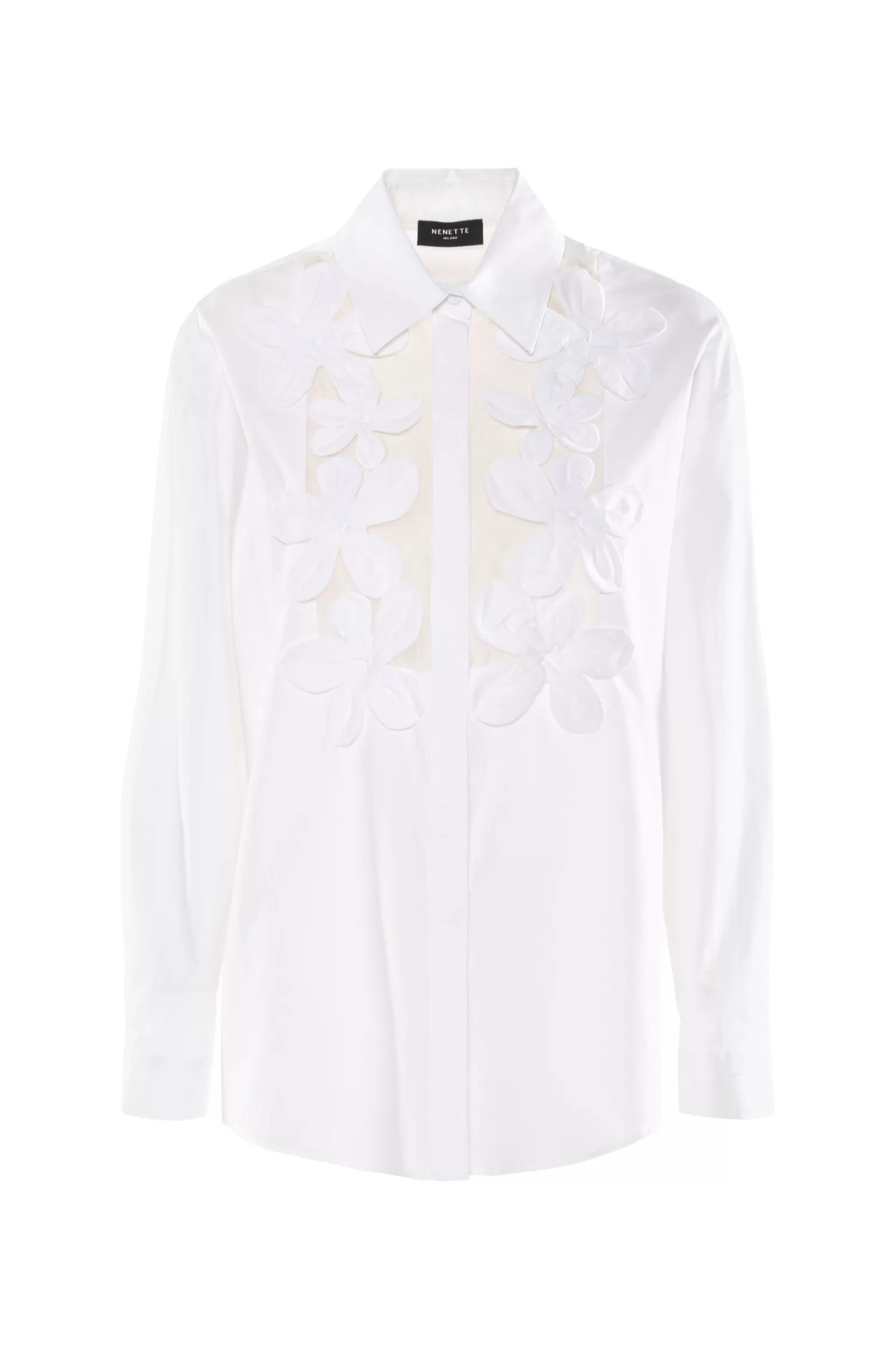 Camicia in cotone con gioco di trasparenze ed applicazioni di fiori, taglio dritto, colletto a punta, maniche voluminose.