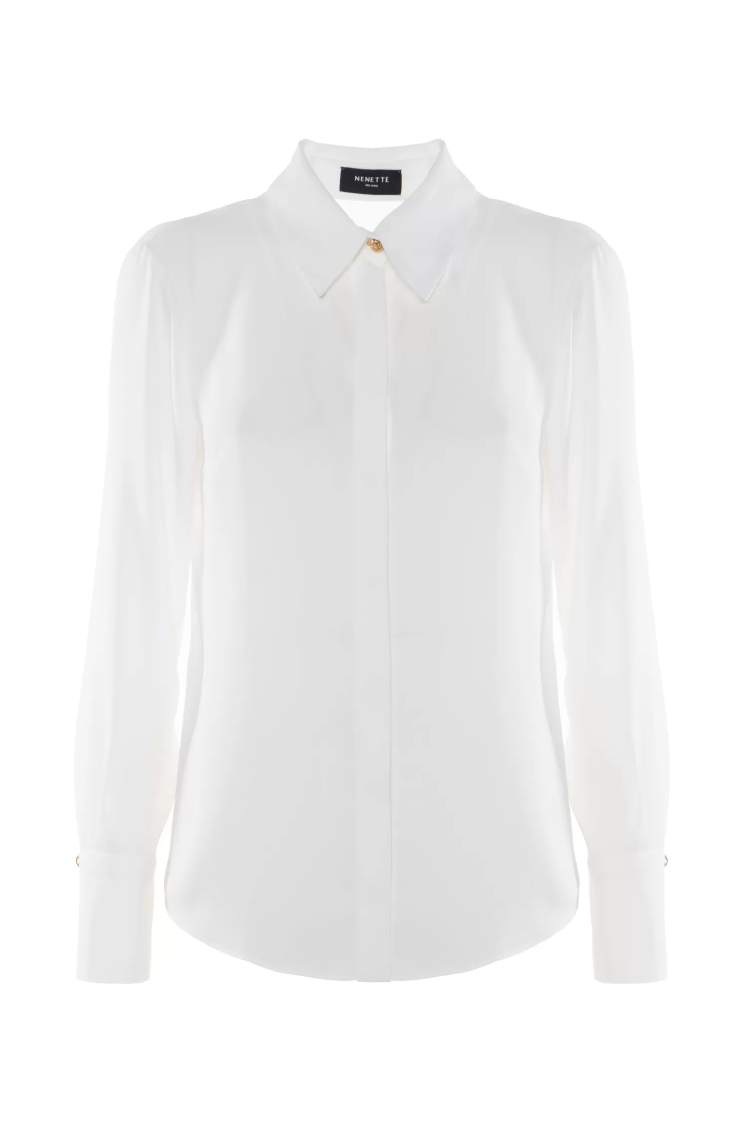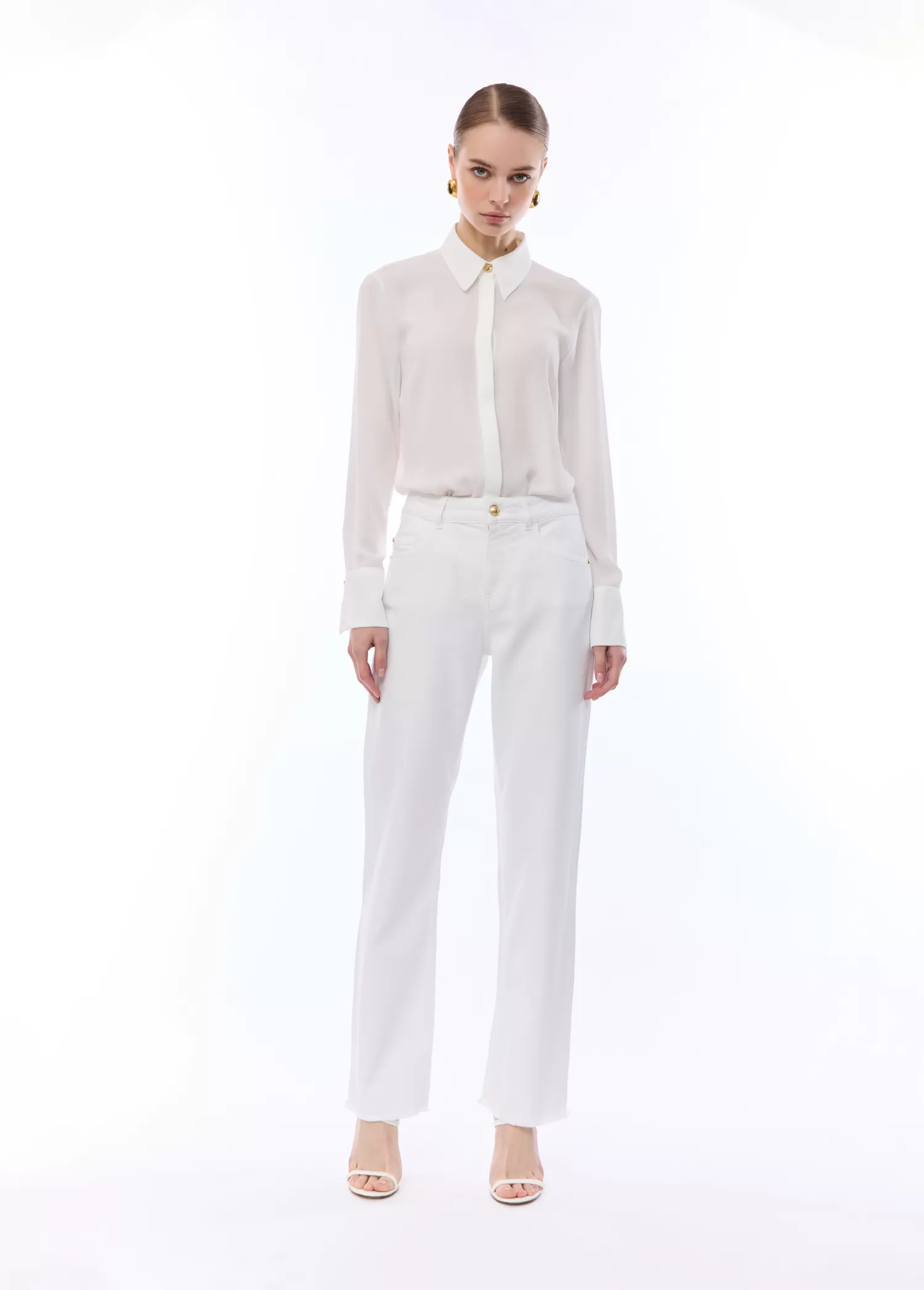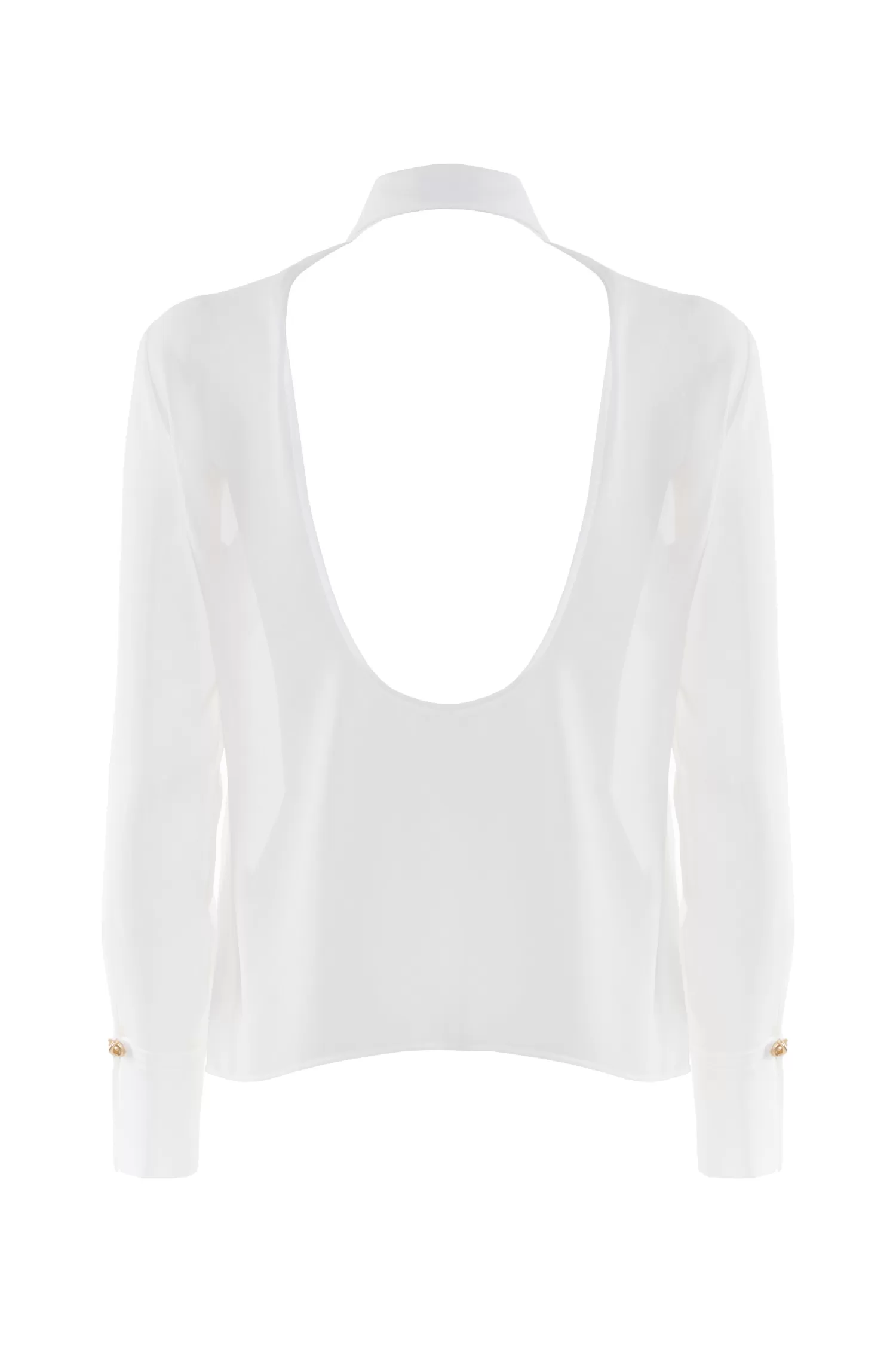 Camicia in tessuto fluido con apertura sulla schiena, colletto e polsini impreziositi da bottone gioiello oro satinato, abbottonatura frontale nascosta.