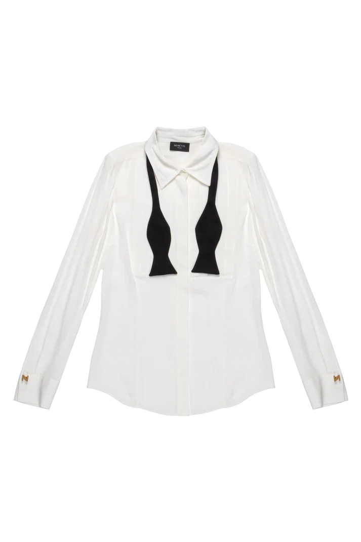 Camicia in viscosa con plastron sul davanti e papillon staccabili, gemelli ai polsi in metallo bronzato satinato.