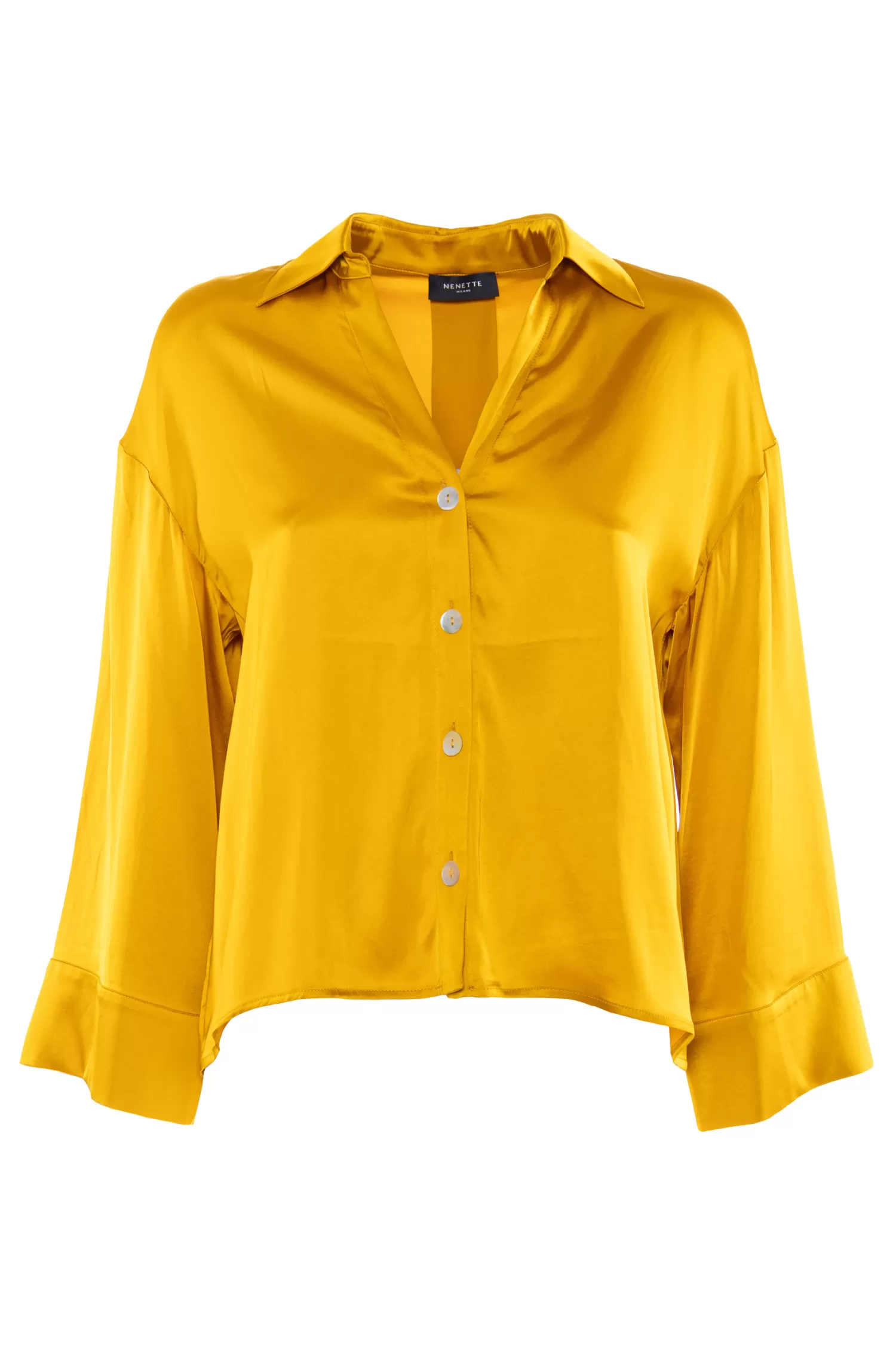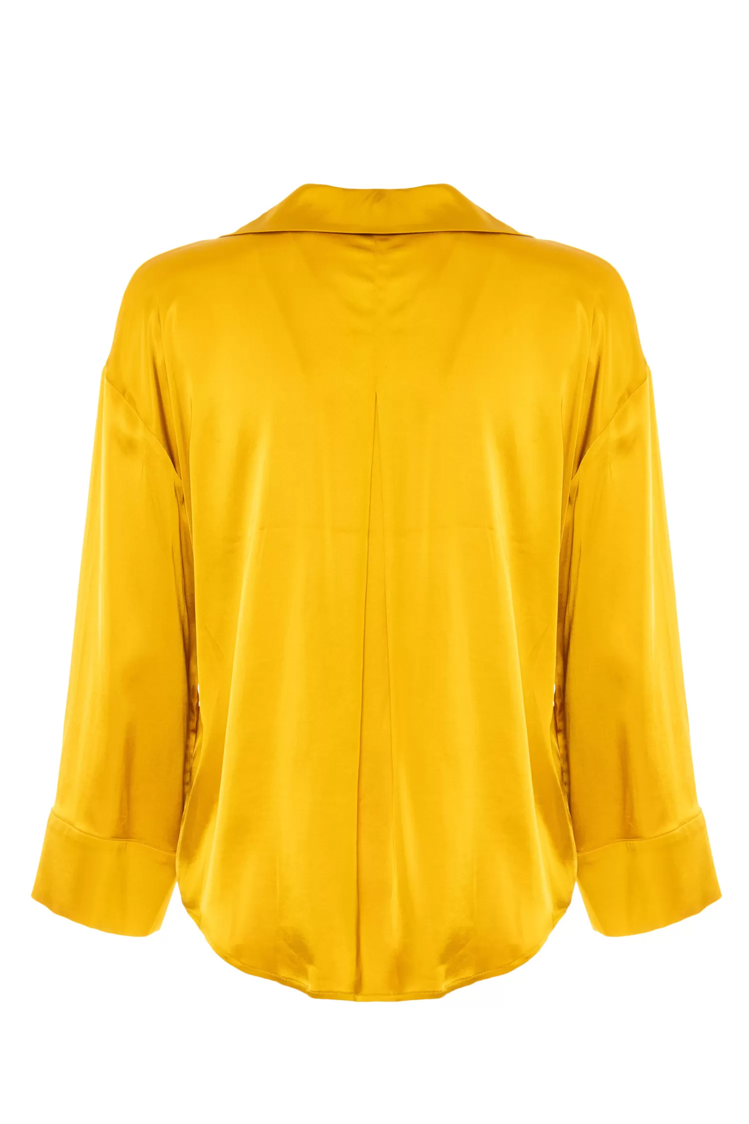 Camicia in raso di viscosa color oro dal design scivolato, piegone sul retro, asimmetria tra il davanti e il dietro, bottoni in madreperla, maniche ampie.