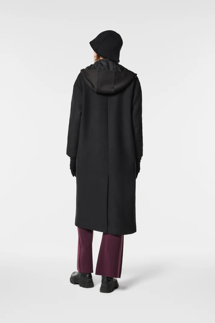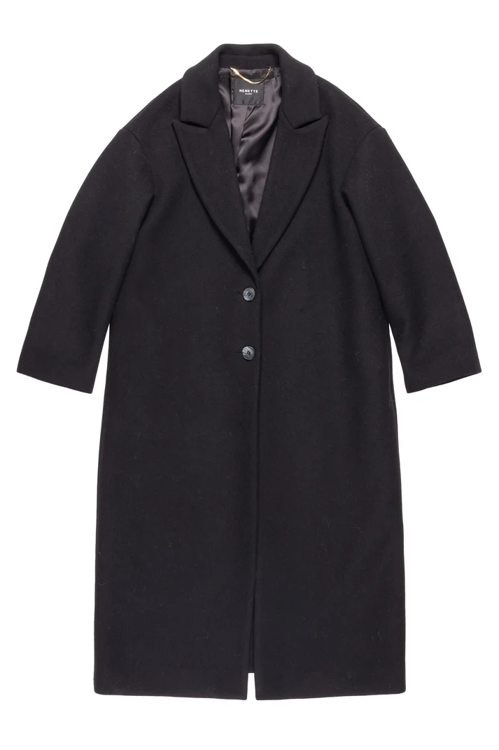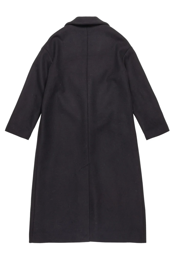Cappotto lungo monopetto in panno di lana, spalla caduta, tasche laterali, colore blu navy.