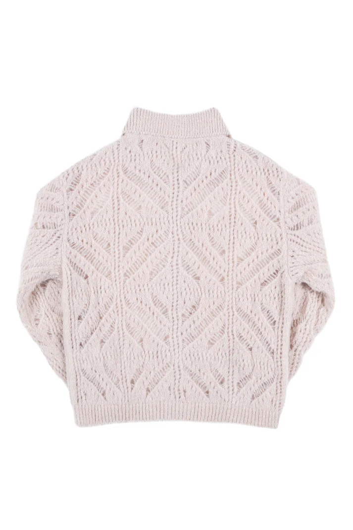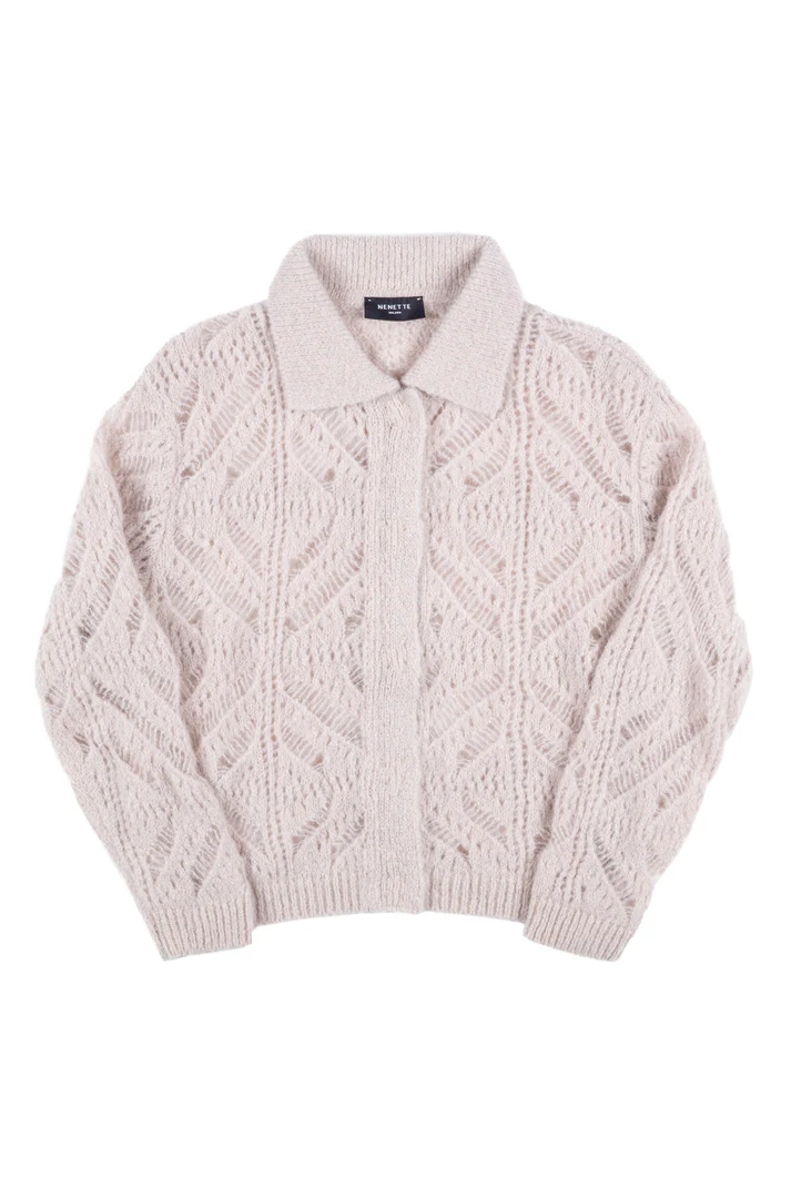 Cardigan polo in misto alpaca e mohair, trama in punto pizzo.