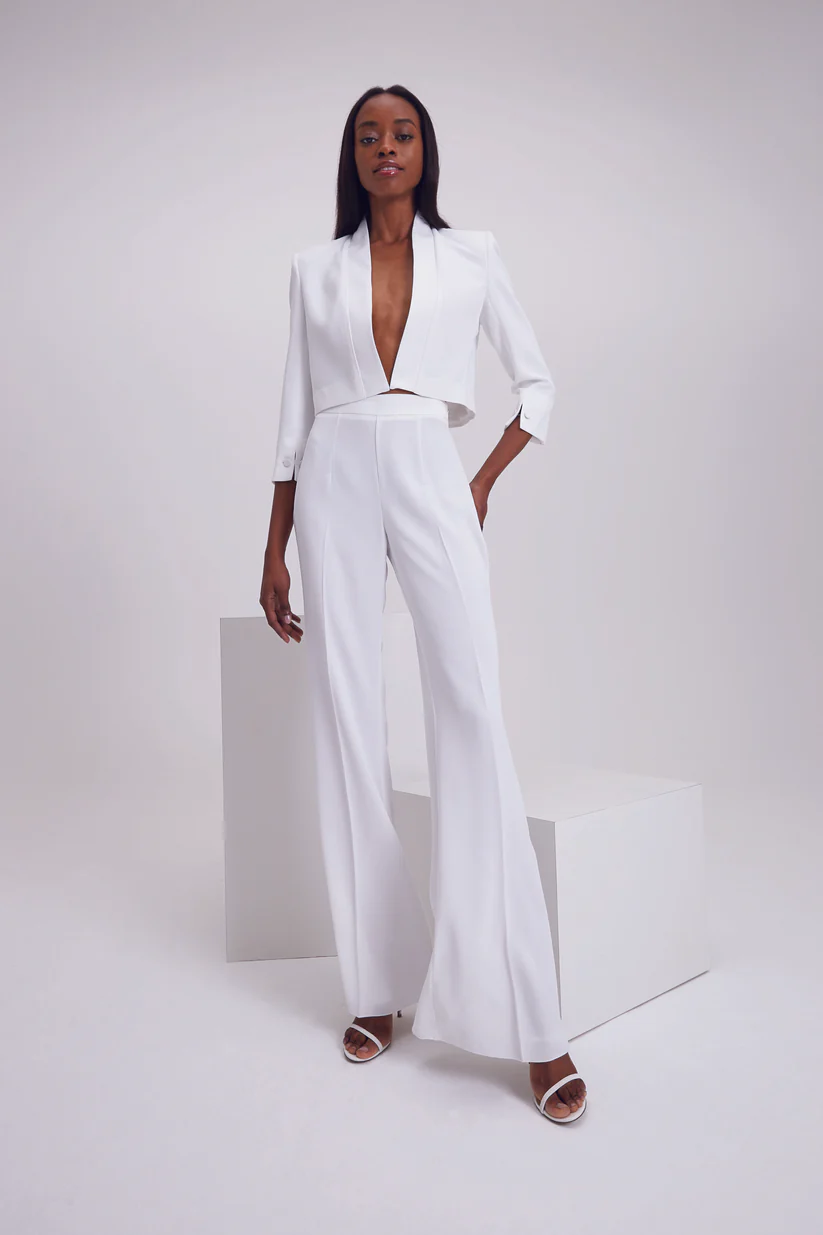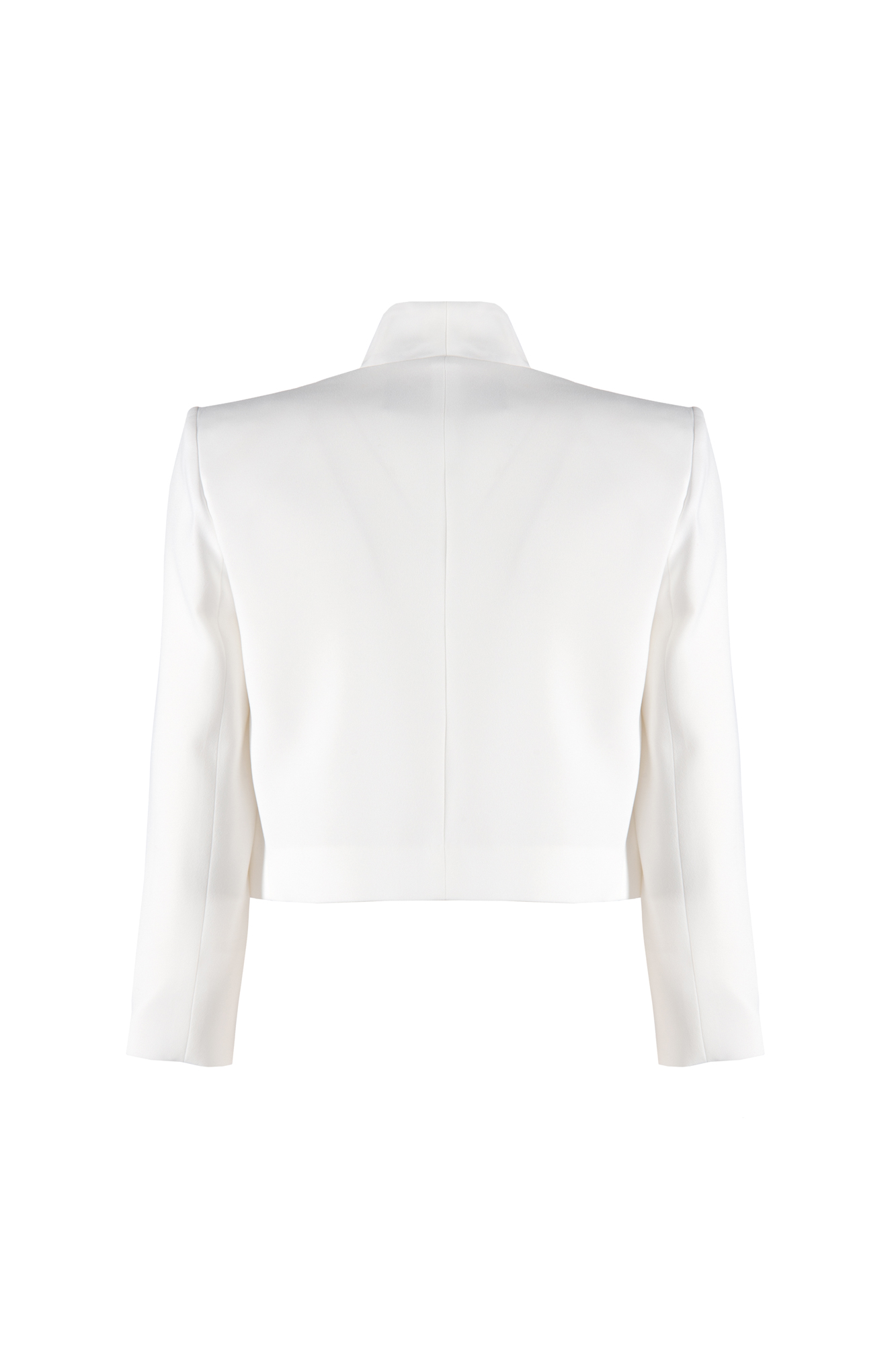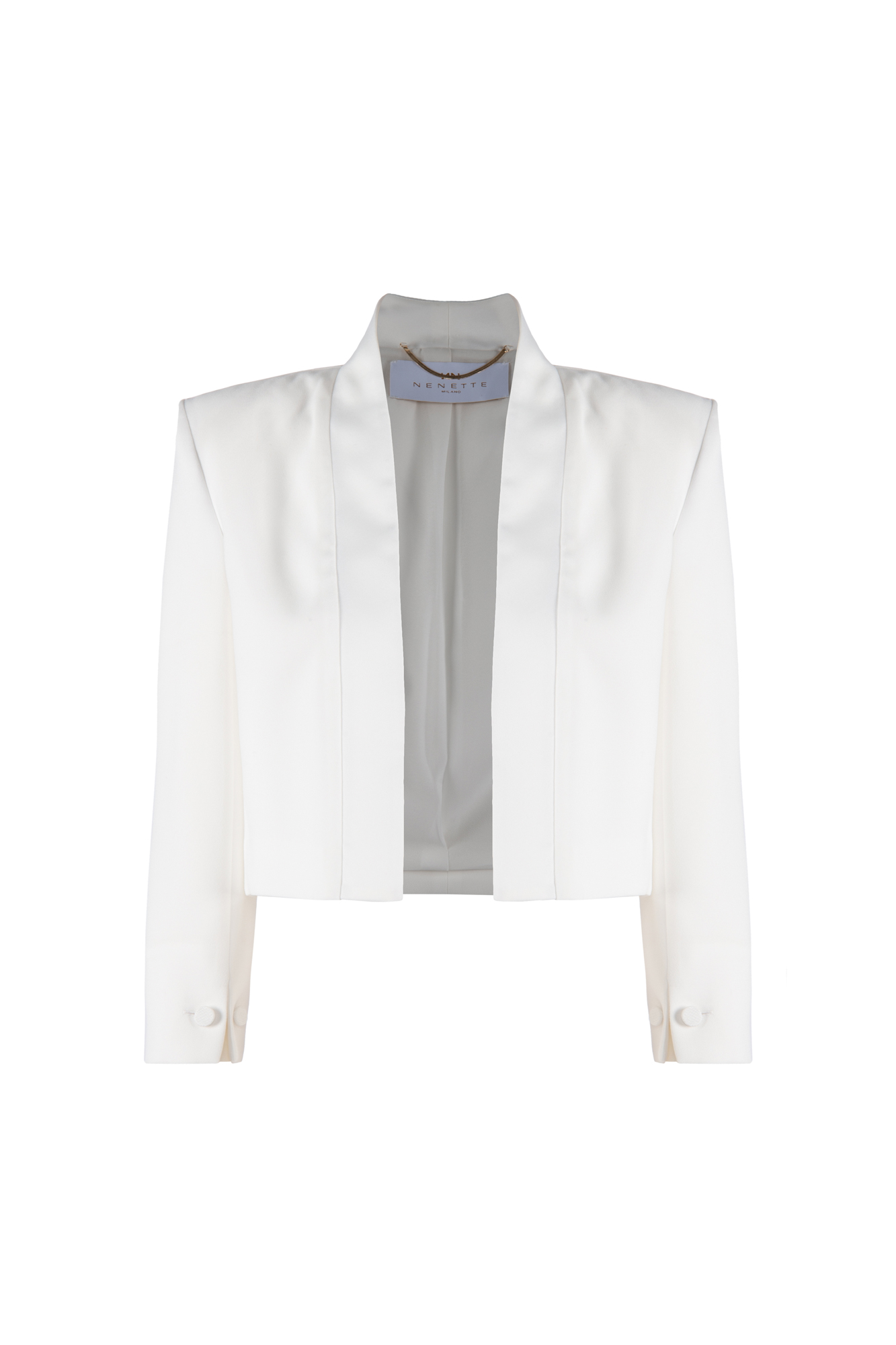 Giacca corta in cady di poli enver satin, senza bottoni, con dettaglio in raso sui profili