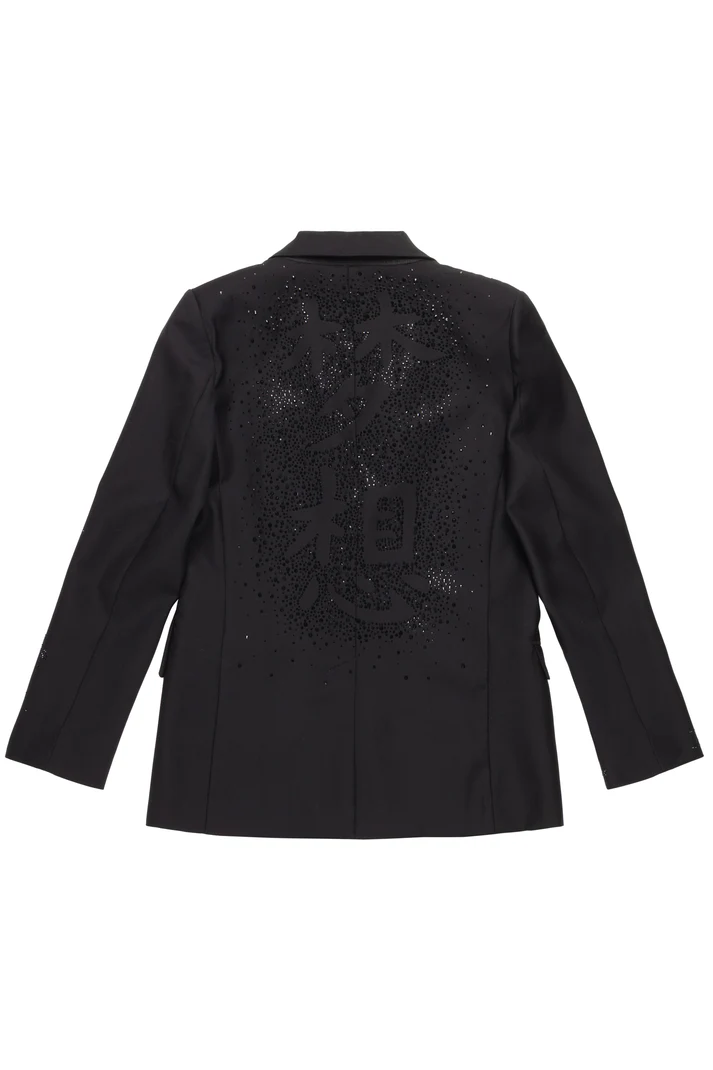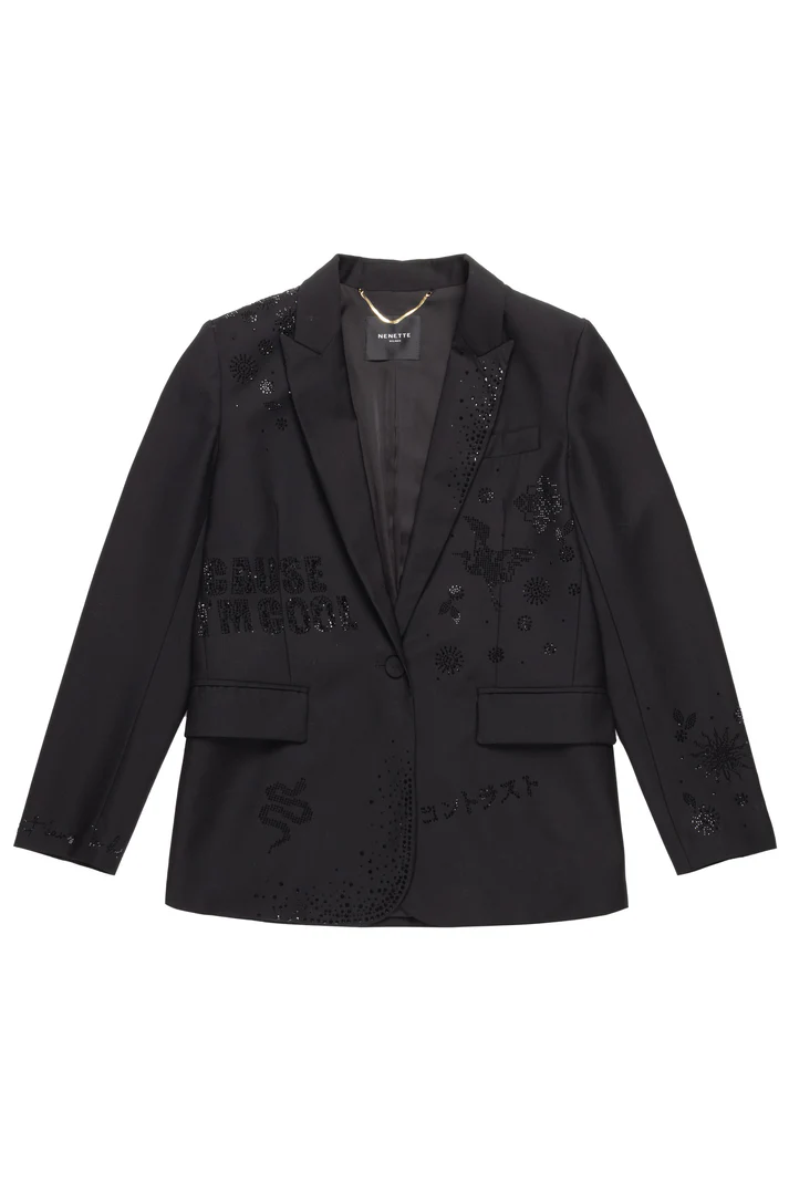 Giacca monopetto in fresco lana, impreziosita da strass tono su tono.