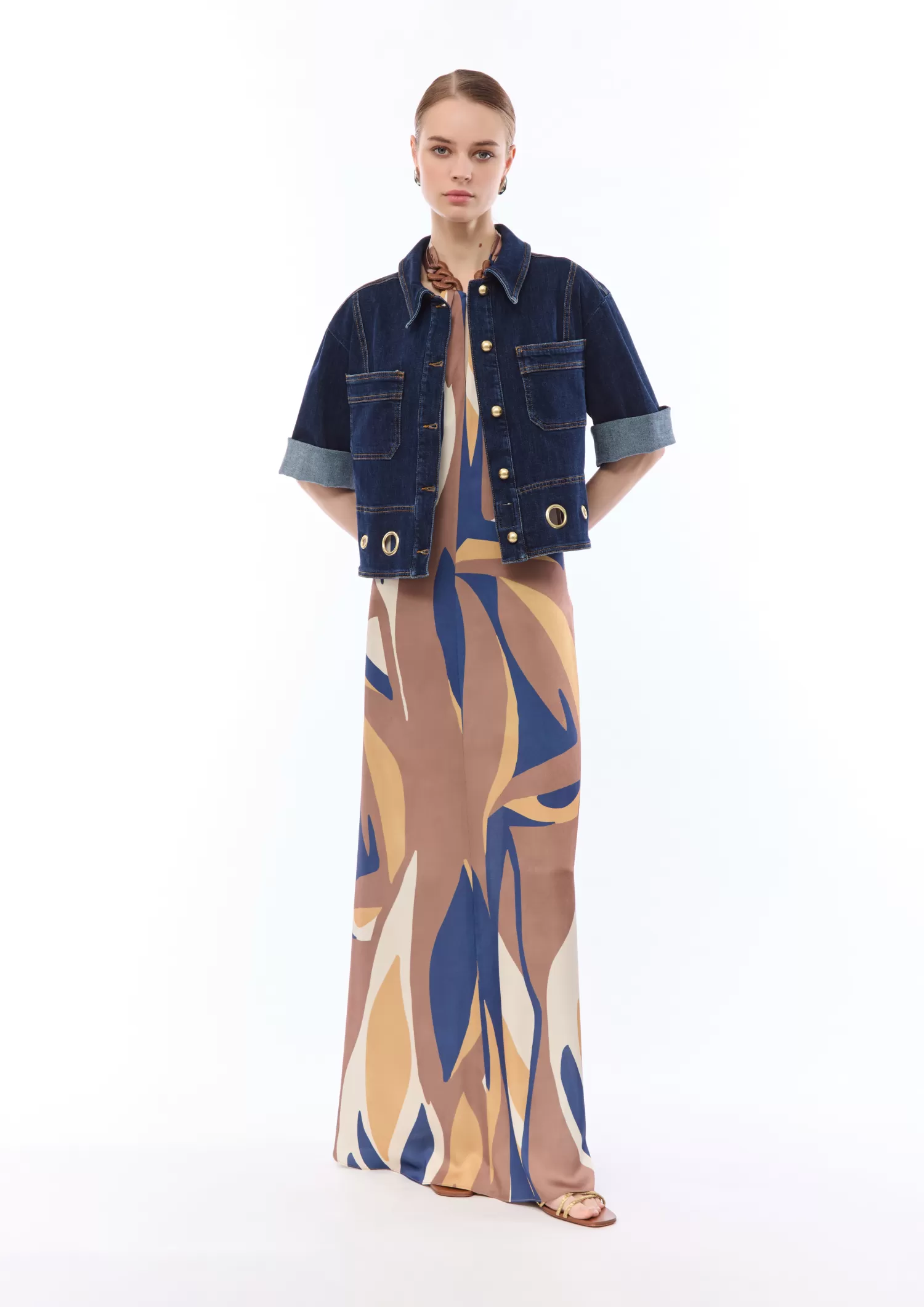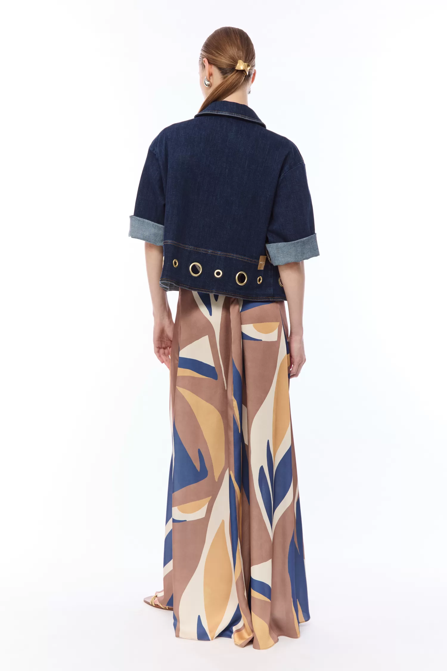 Giacca in denim comfort con applicazioni di vele metalliche sul fondo.