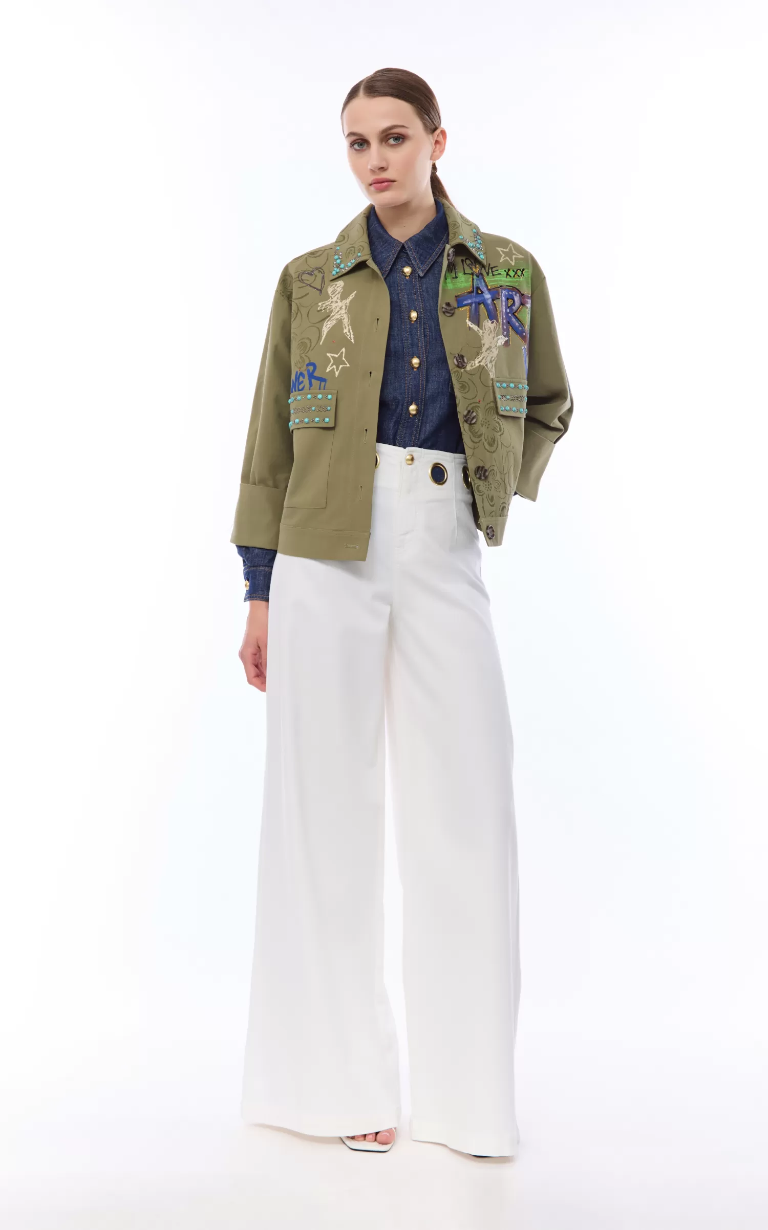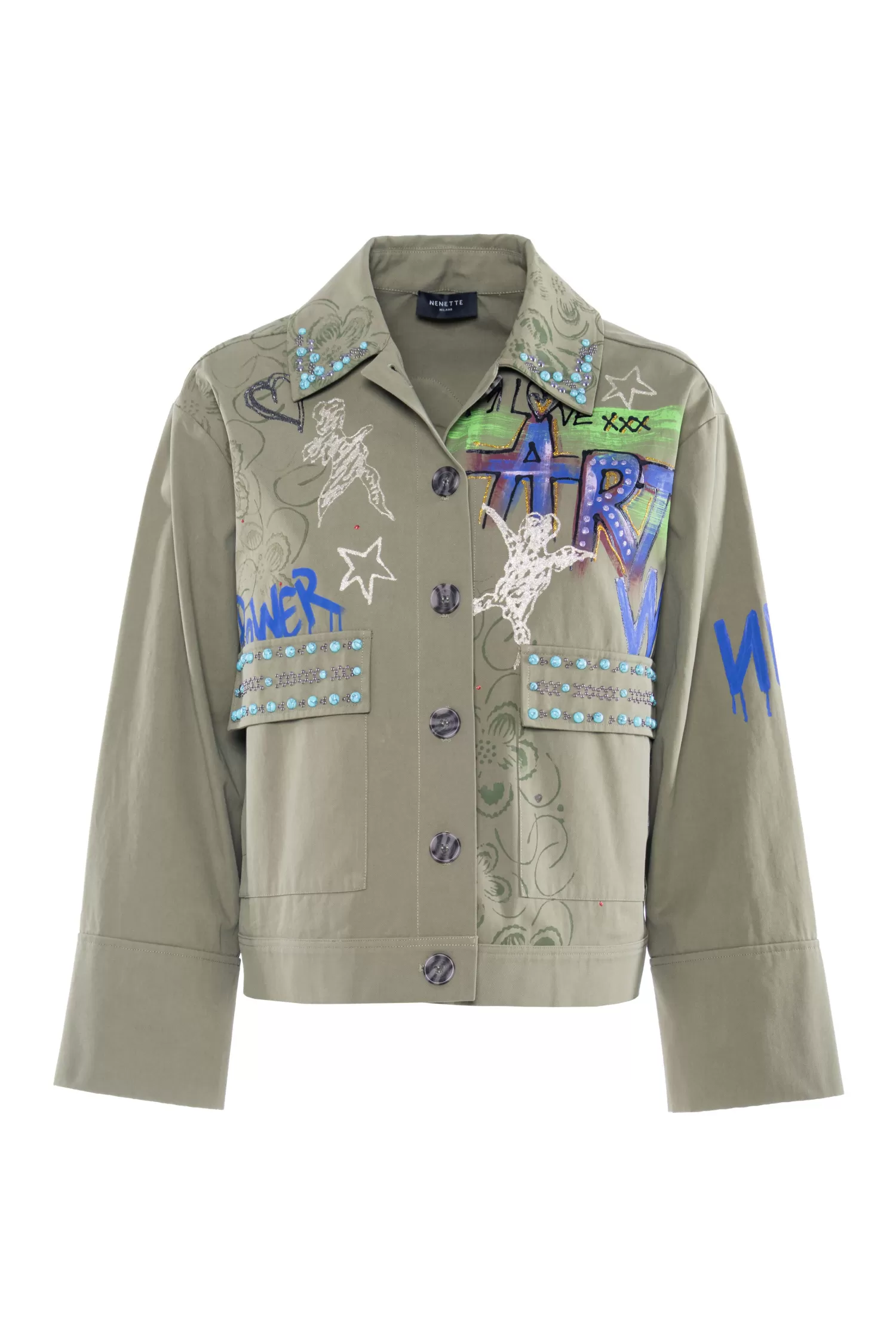 Giacca field in gabardina di cotone dipinta a mano, taglio dritto, applicazioni sulle tasche e sul colletto.