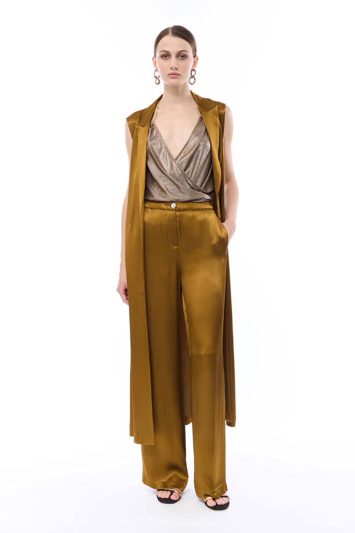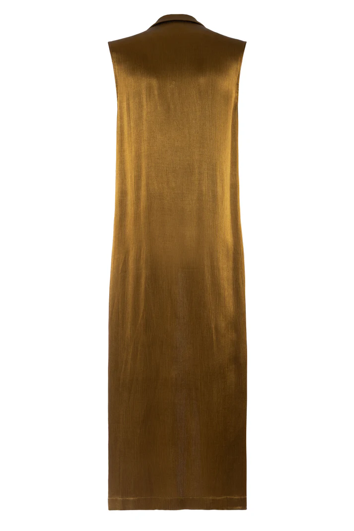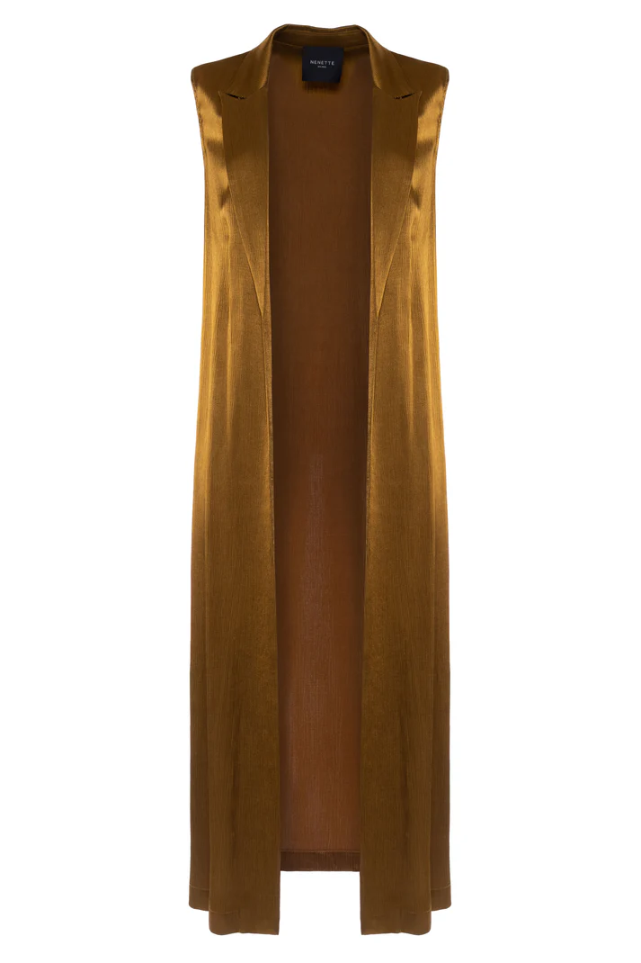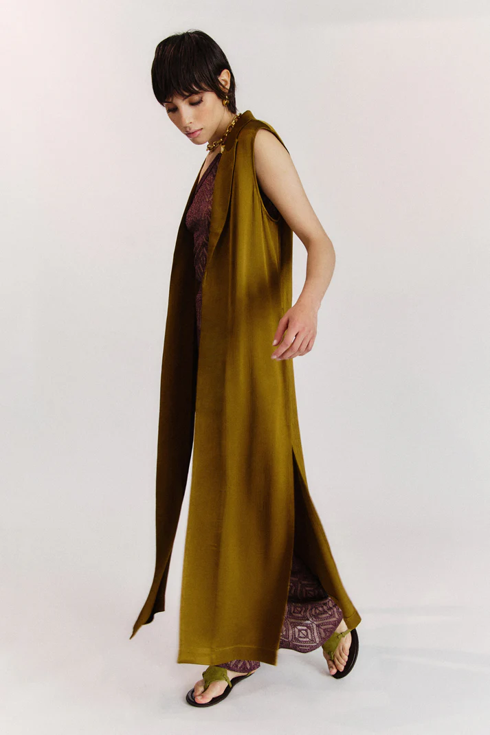 Gilet lungo color olio dalla silhouette fluida, classici revers a lancia e design senza maniche, spacchi laterali.