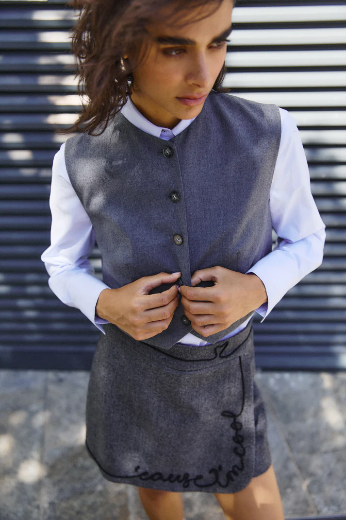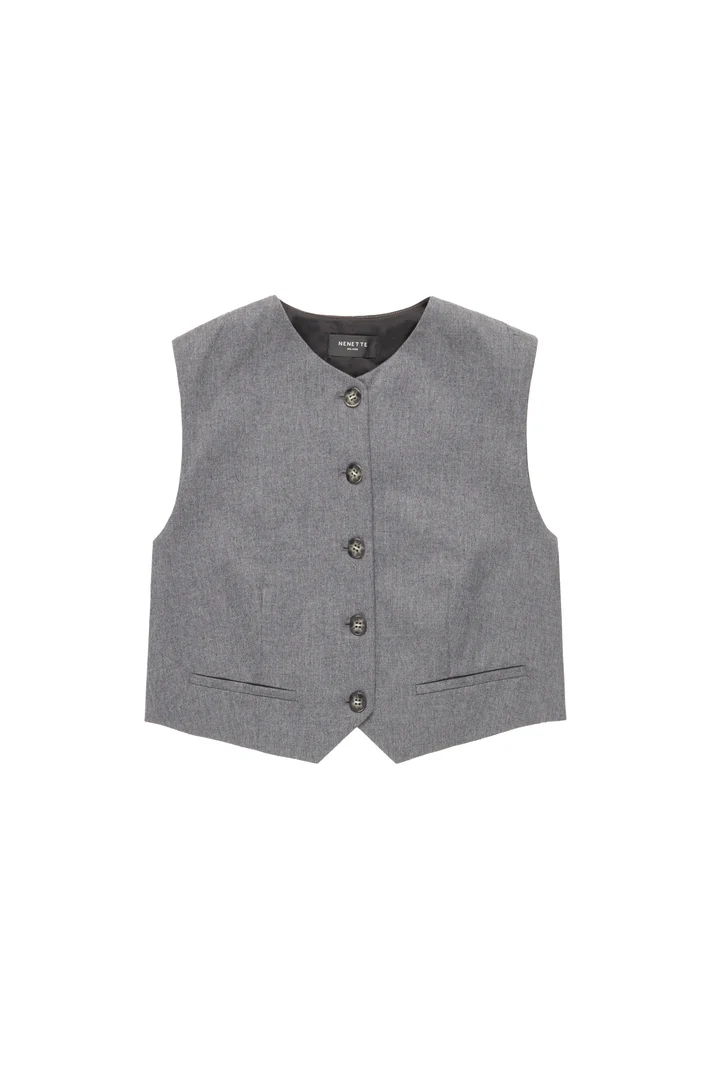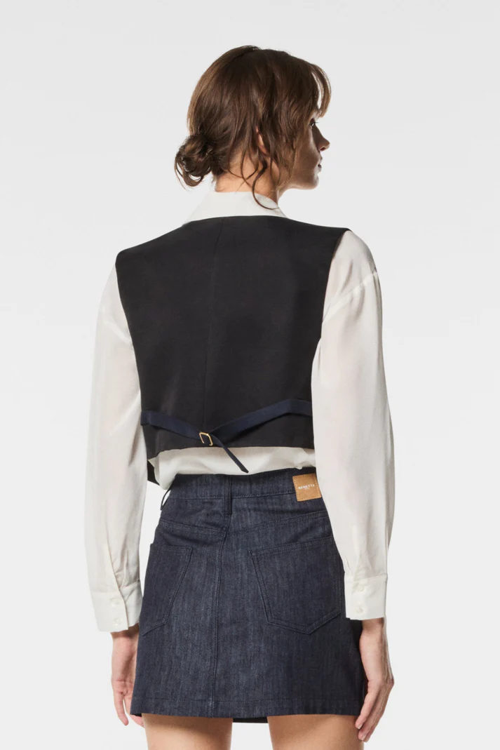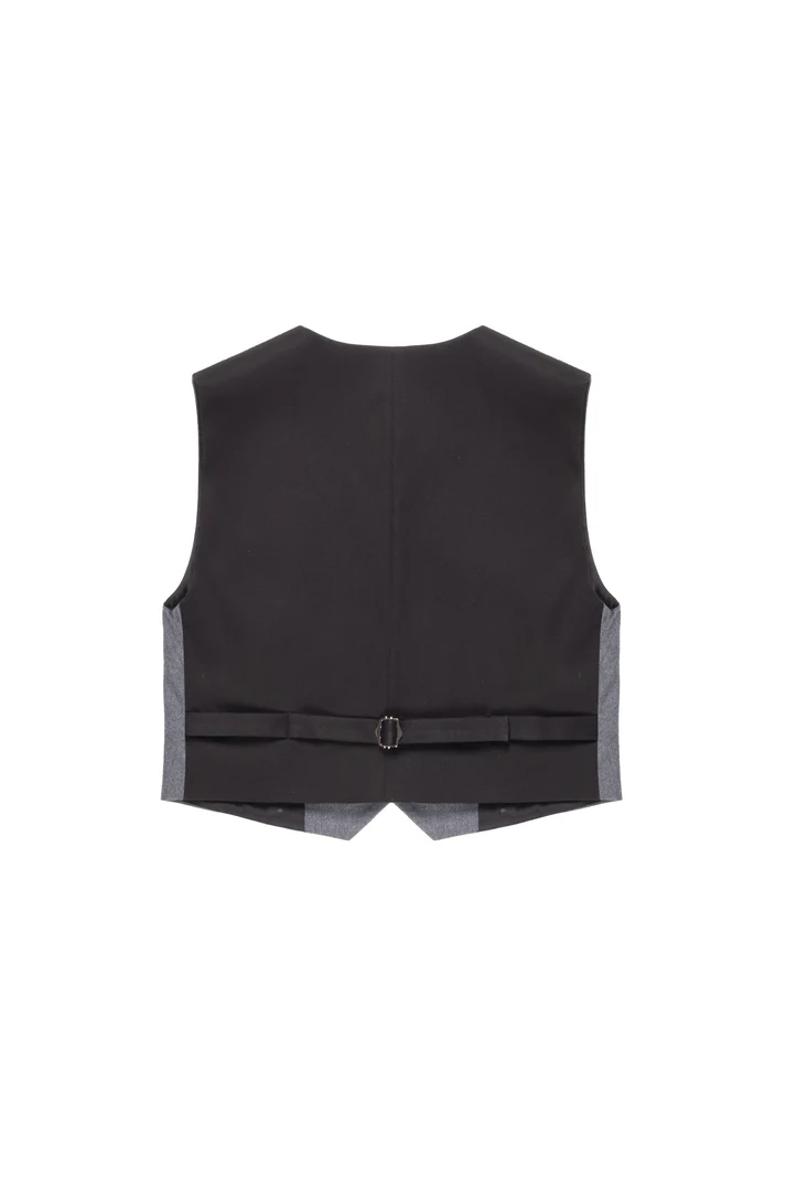 Gilet monopetto in fresco lana stretch, pannello posteriore a contrasto, cinturino regolabile.