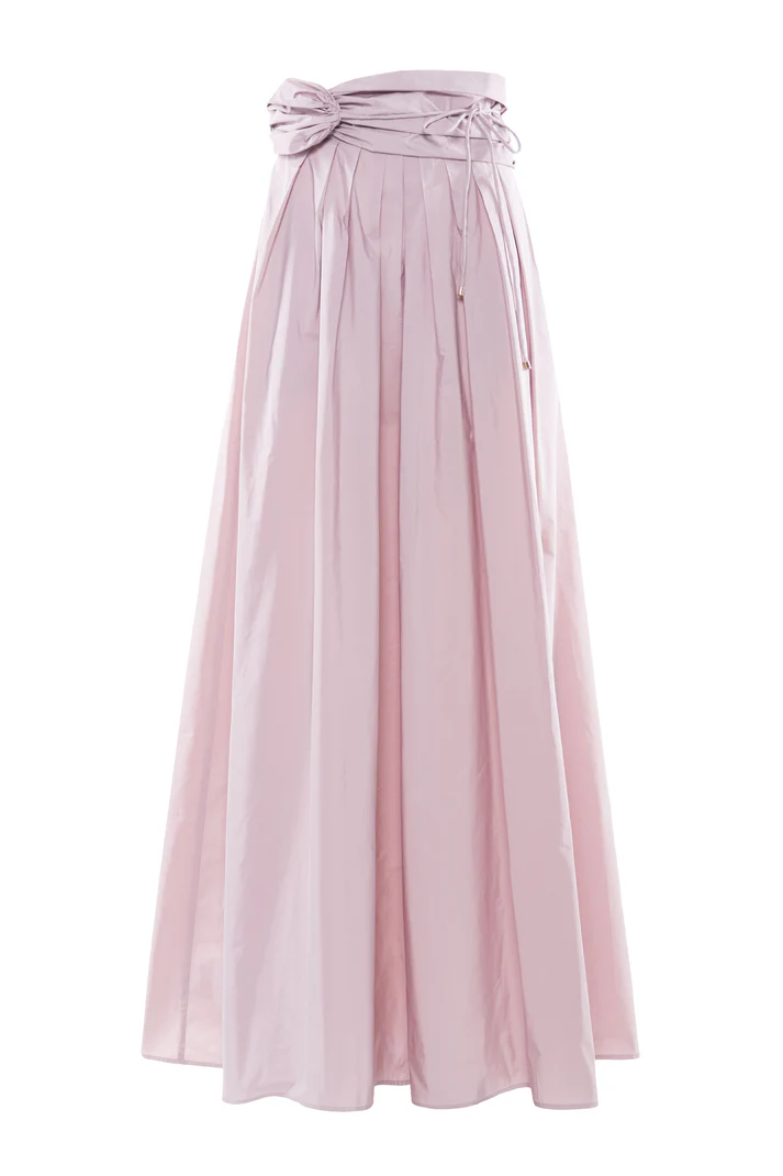 Gonna lunga in taffetà color cipria, linea ampia, cinturone in vita con laccetti regolabili, zip nascosta sul retro.