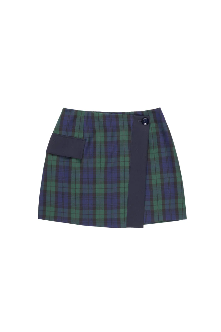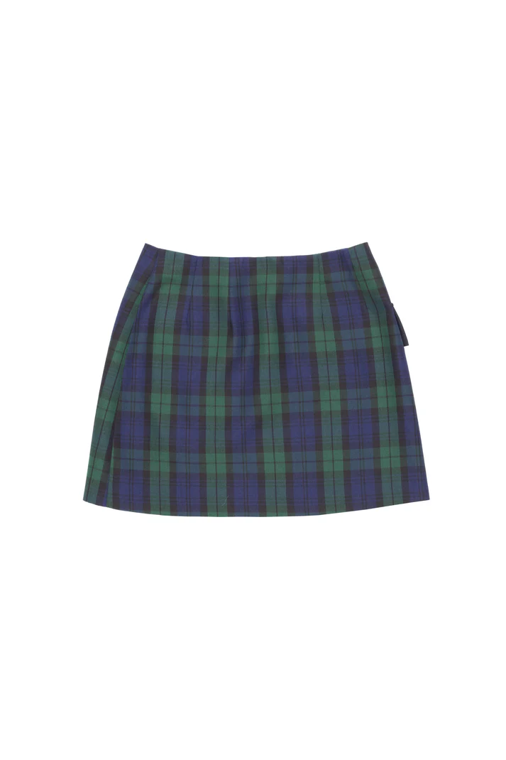 Gonna corta in fresco lana a fantasia tartan verde e blu.
