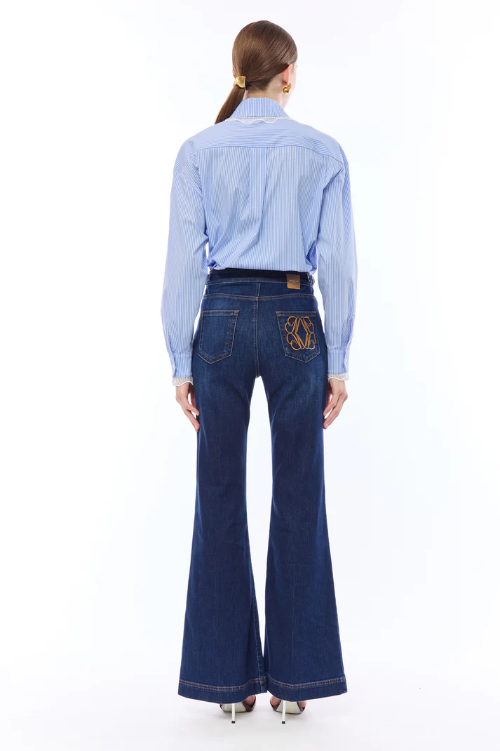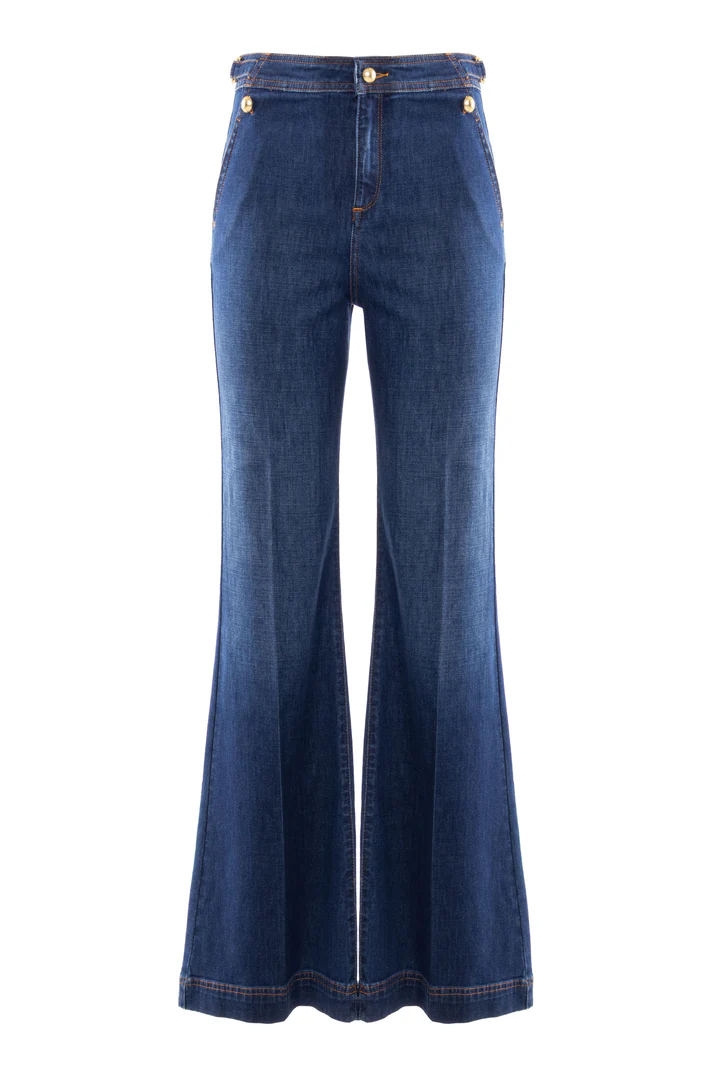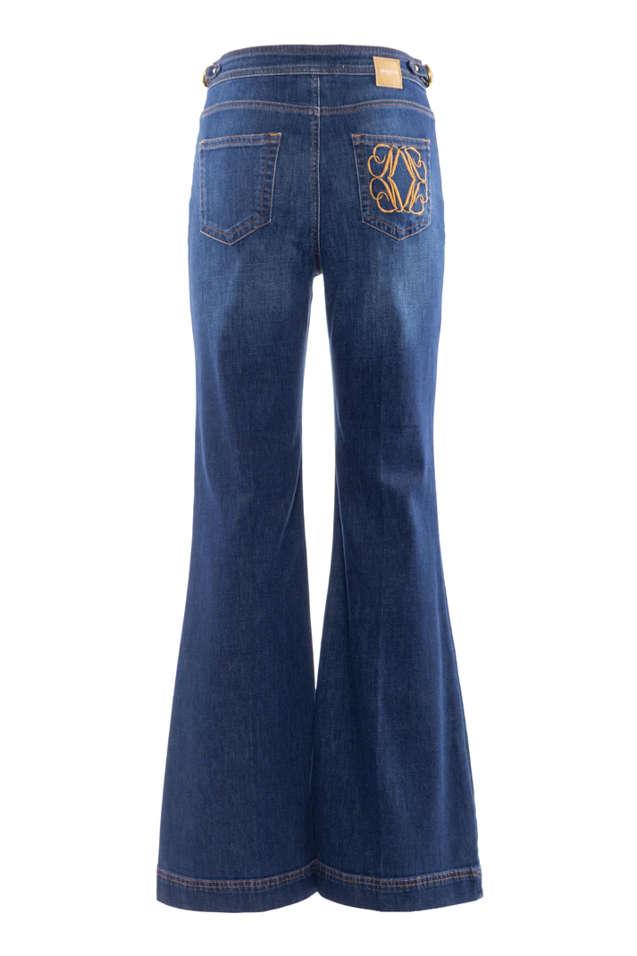 Jeans a vita alta in denim comfort stretch, linea della gamba a zampa, dettagli metallici color oro, ricamo sulla tasca posteriore.