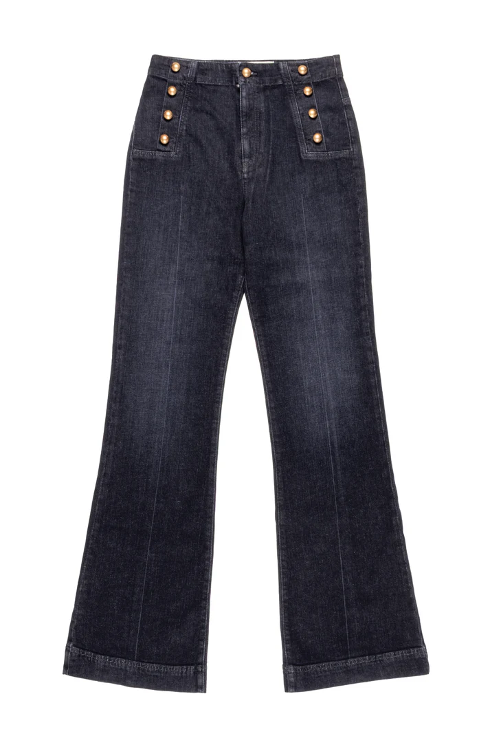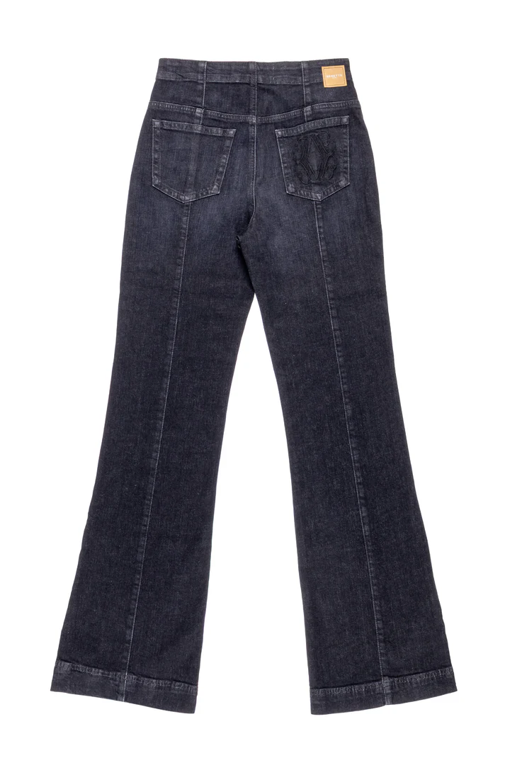 Jeans in denim black tela comfort, gamba a zampa, bottoni color oro satinato sul davanti, cuciture frontali e posteriori.