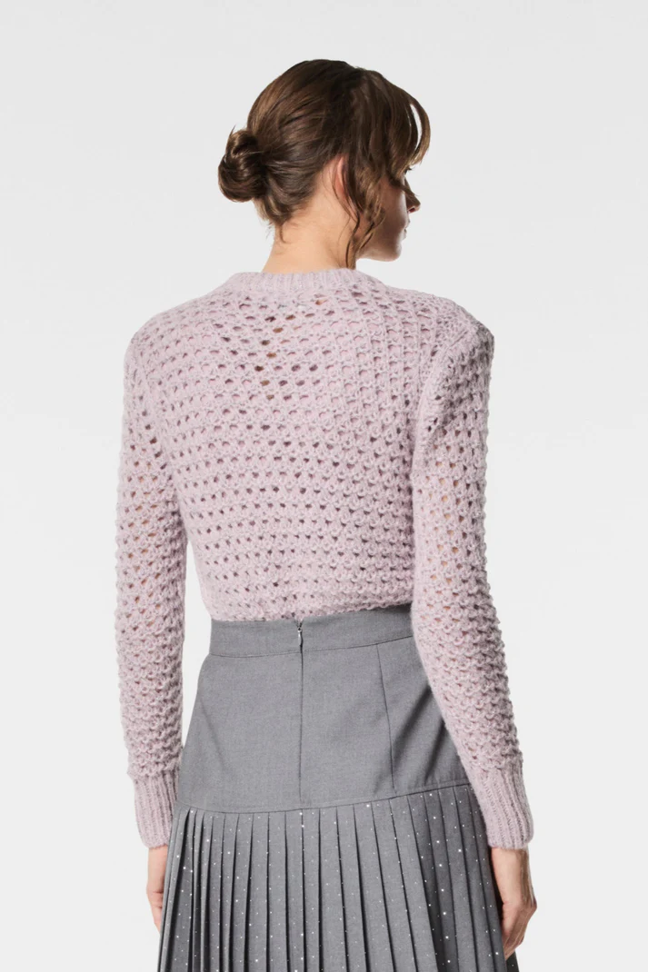 Maglia in misto lana ed alpaca a manica lunga, girocollo, trama a punto rete con filo lurex.