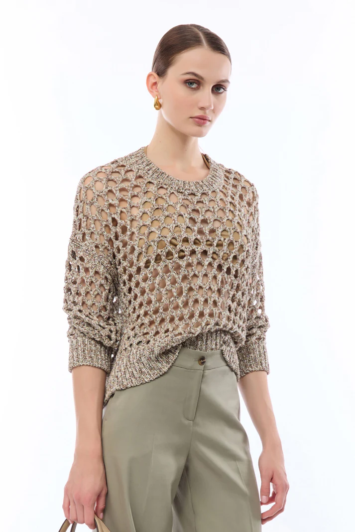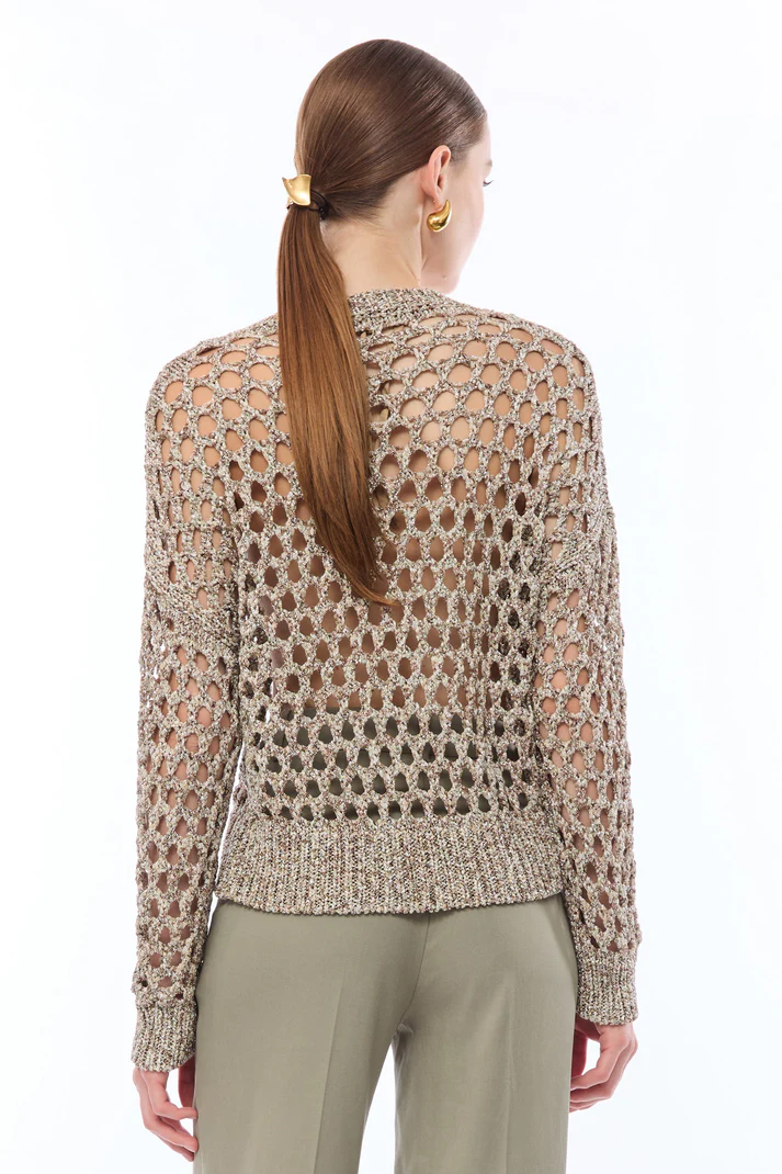 Maglia a maniche lunghe in punto rete con filato lurex in misto viscosa, scollo tondo.