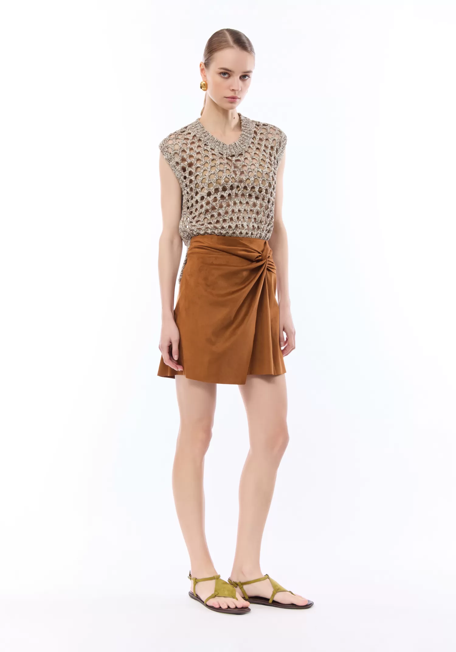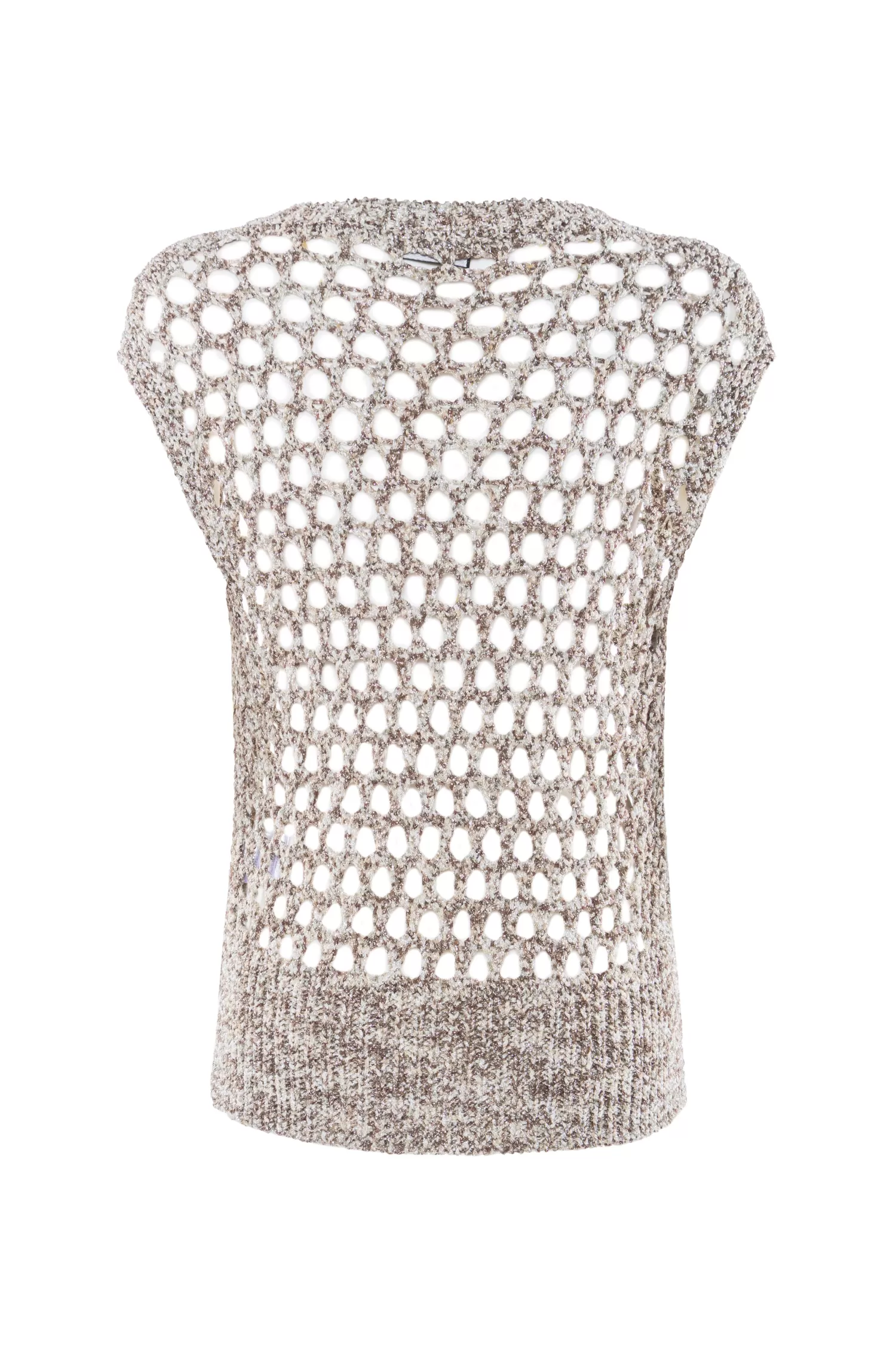 Maglia senza maniche in punto rete, filato in viscosa misto lurex.