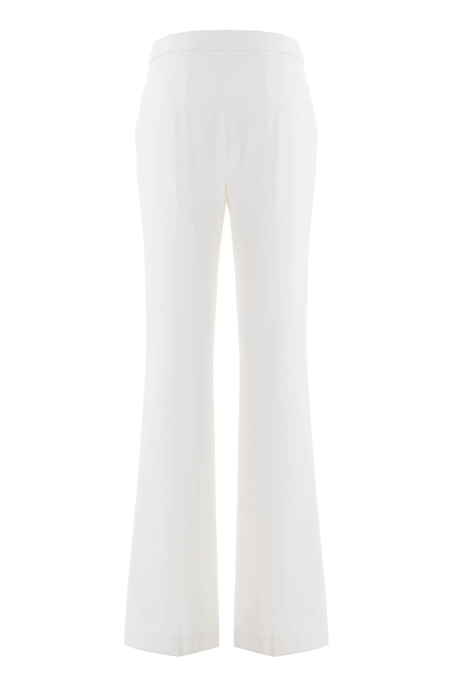 Pantalone leggermente svasato sul fondo, vita alta, bottone gioiello, tesuuto in cady di poly.