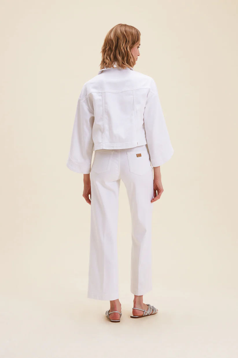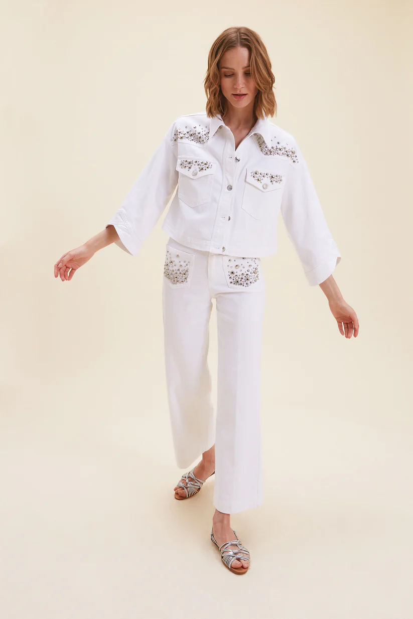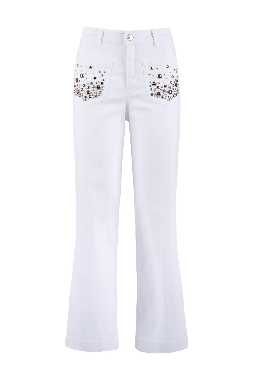 Pantalone in tinto capo, con borchie sulle tasche, fondo svasato a trombetta