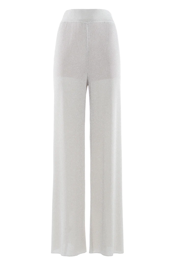 Pantalone in viscosa color platino, lavorazione in maglina lurex, linea a palazzo, texture fluida, elastico in vita.