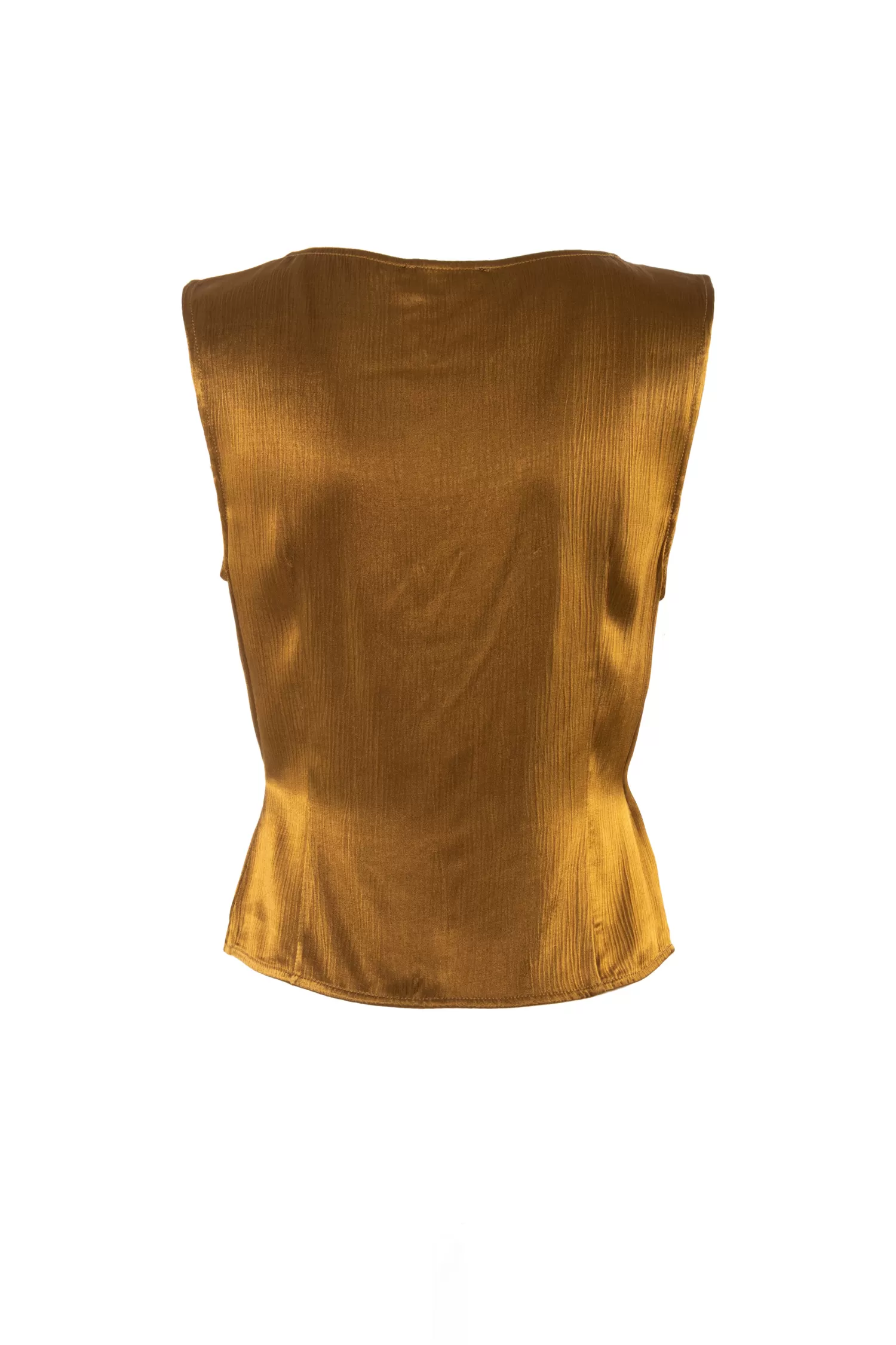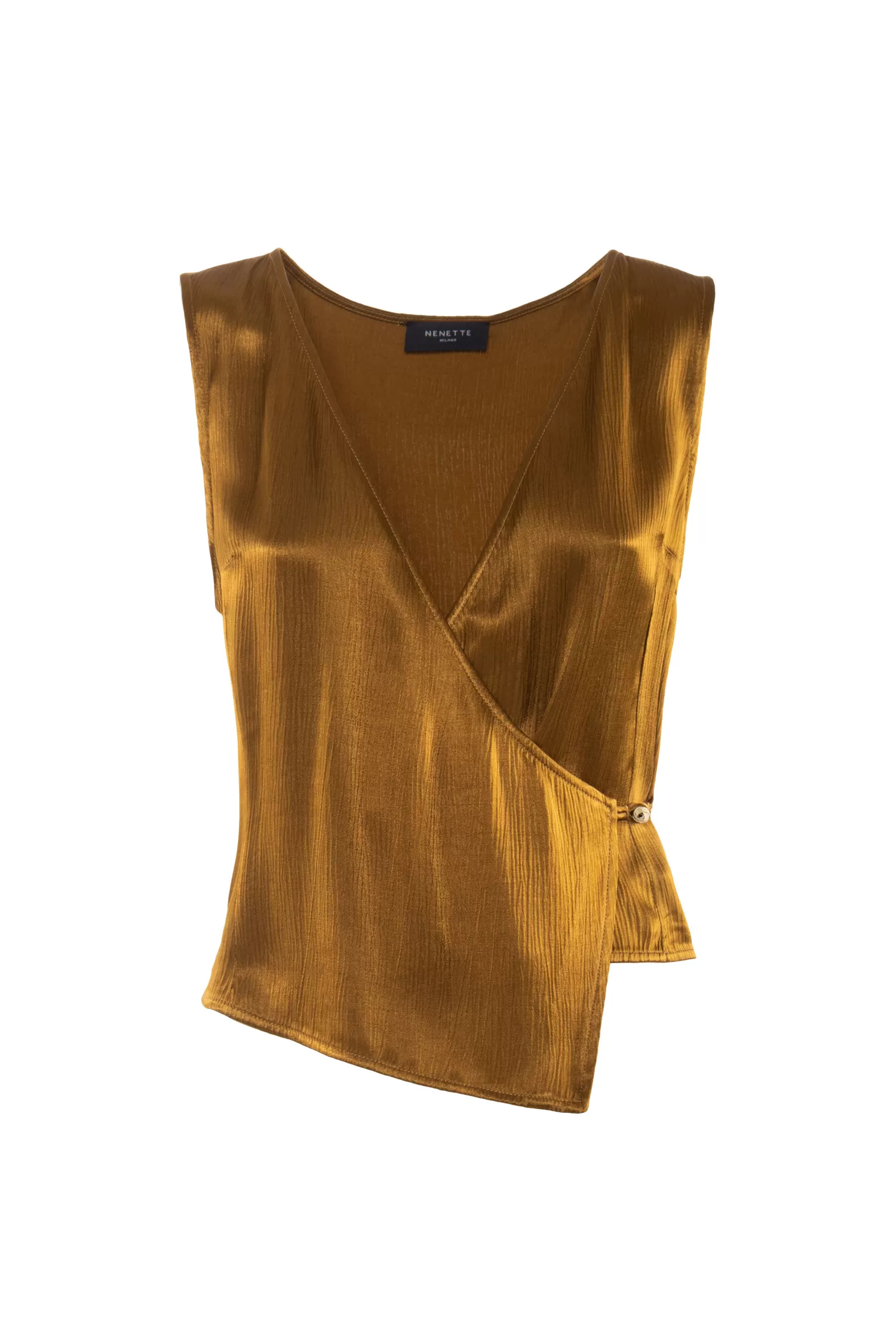 Top in viscosa color olio, scollo a v, chiusura a portafoglio con bottone gioiello sul lato.