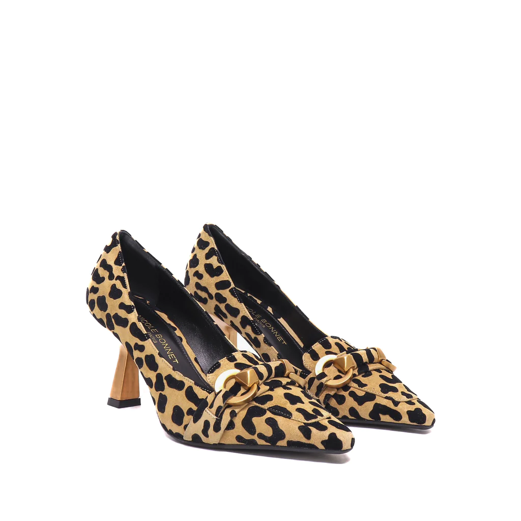 Decollete in suede animaliere, fodera in pelle, dettaglio morsetto e tacco oro ramato satinato, suola in cuoio e gomma. Calzata regolare. Altezza tacco 7 cm