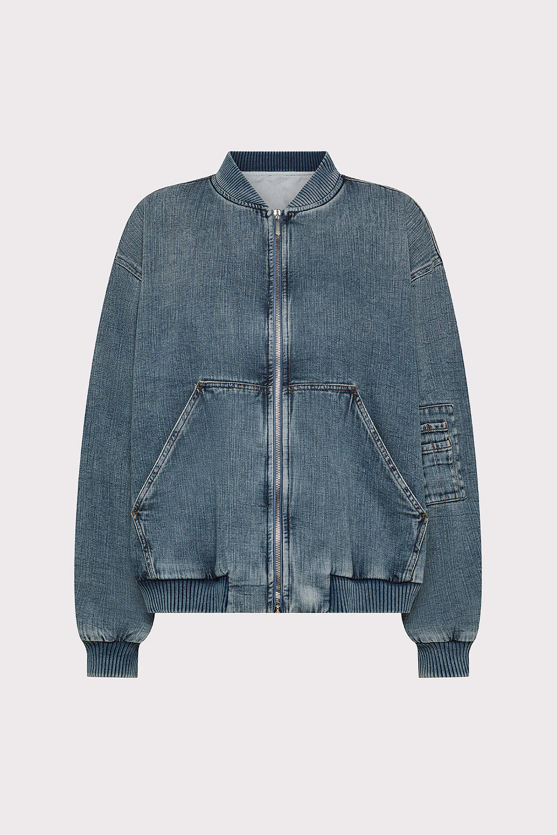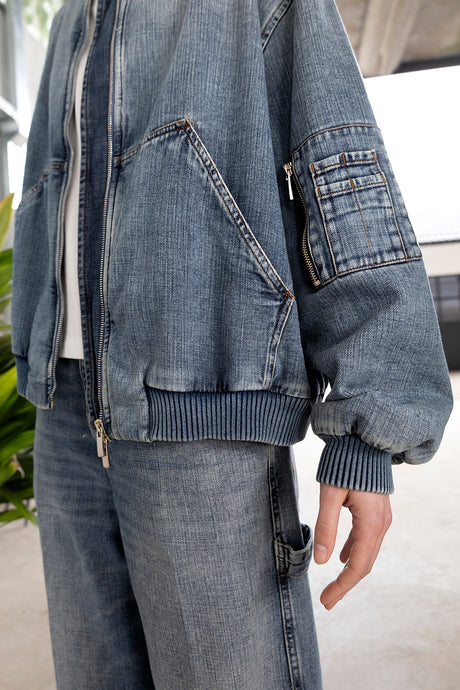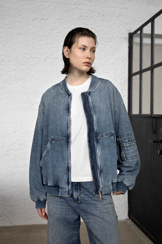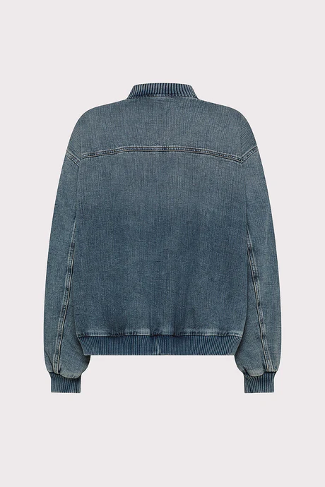 Bomber over in denim, tasche laterali, chiusura con zip metallica argentata, dettaglio con zip sulla manica.