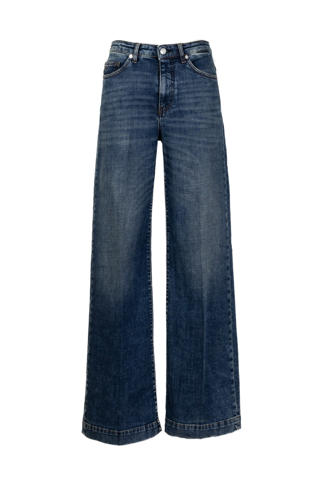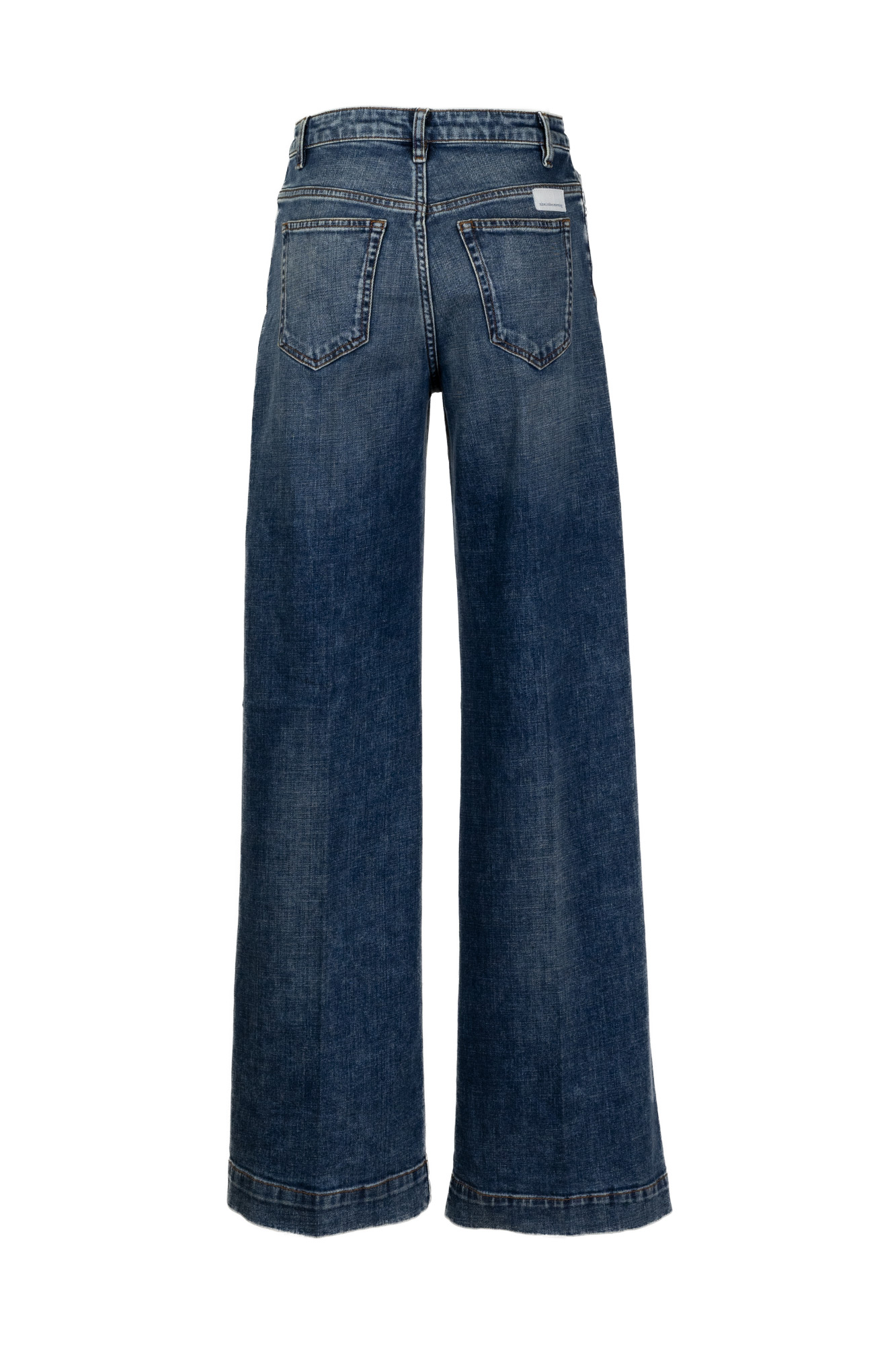 Jeans in tela ferma, gamba dritta, lavaggio leggermente slavato, vita alta, logo a contrasto sul retro.
