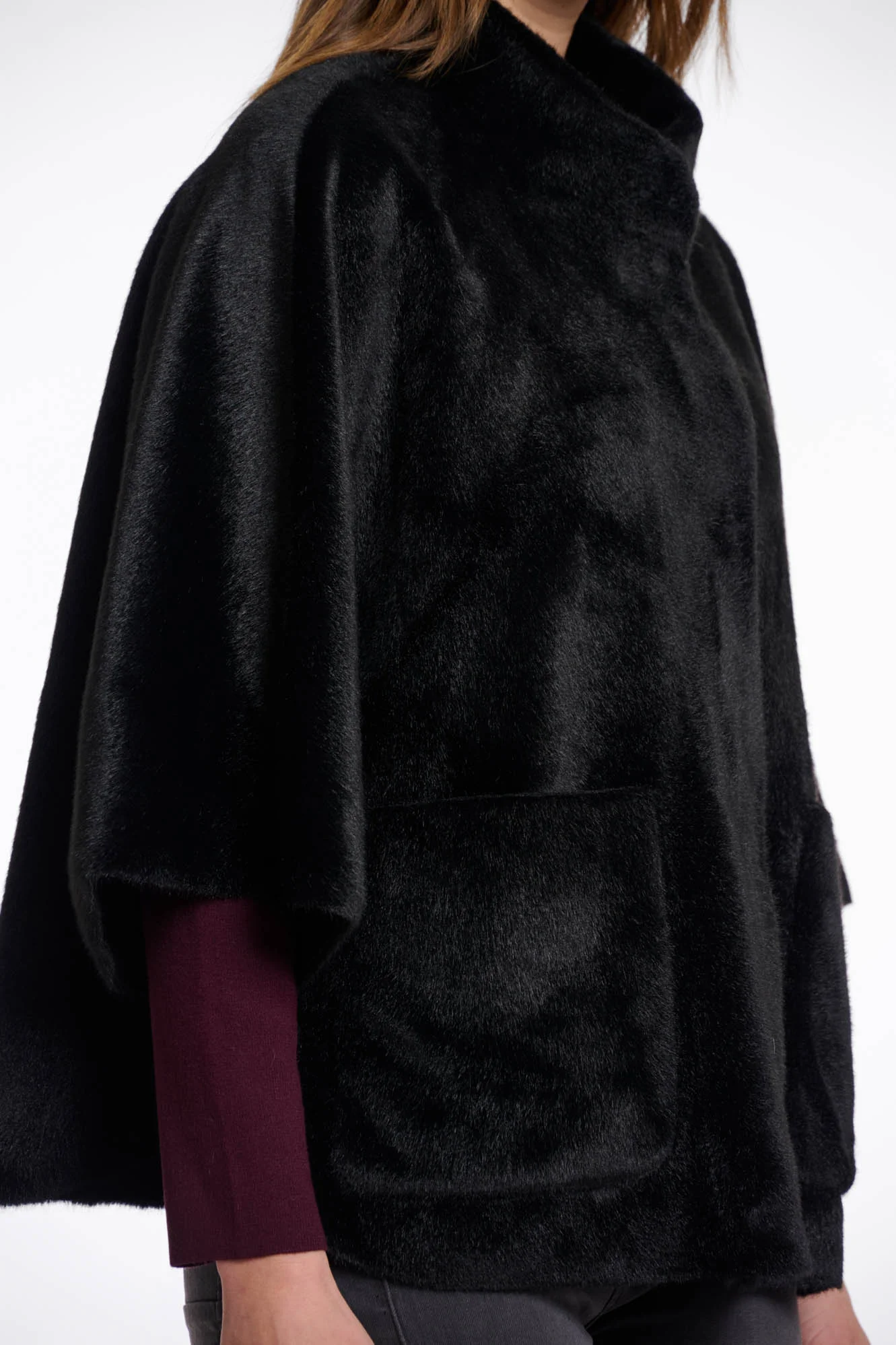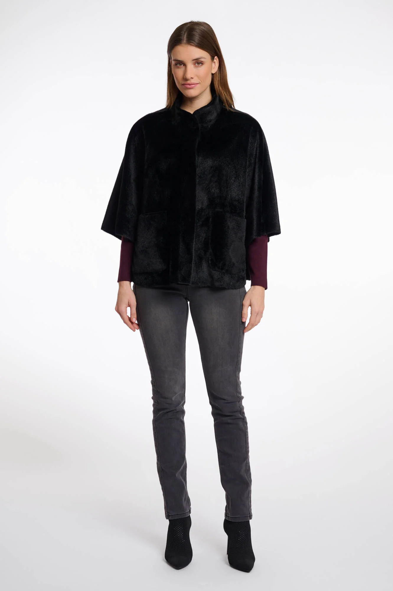 Cappa/poncho in ecopelliccia, tasche laterali, chiusura con bottoni a pressione.