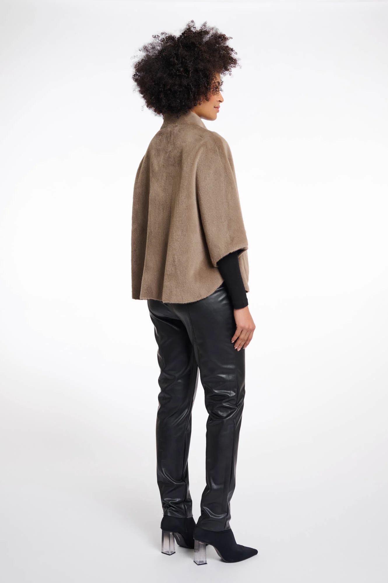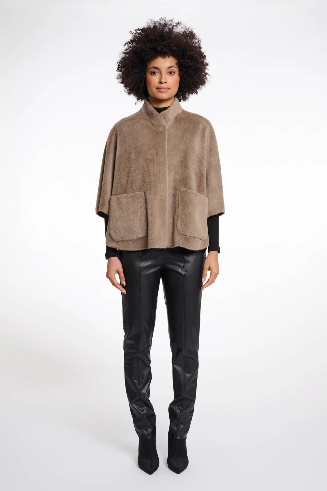 Cappa/poncho in ecopelliccia, tasche laterali, chiusura con bottoni a pressione.