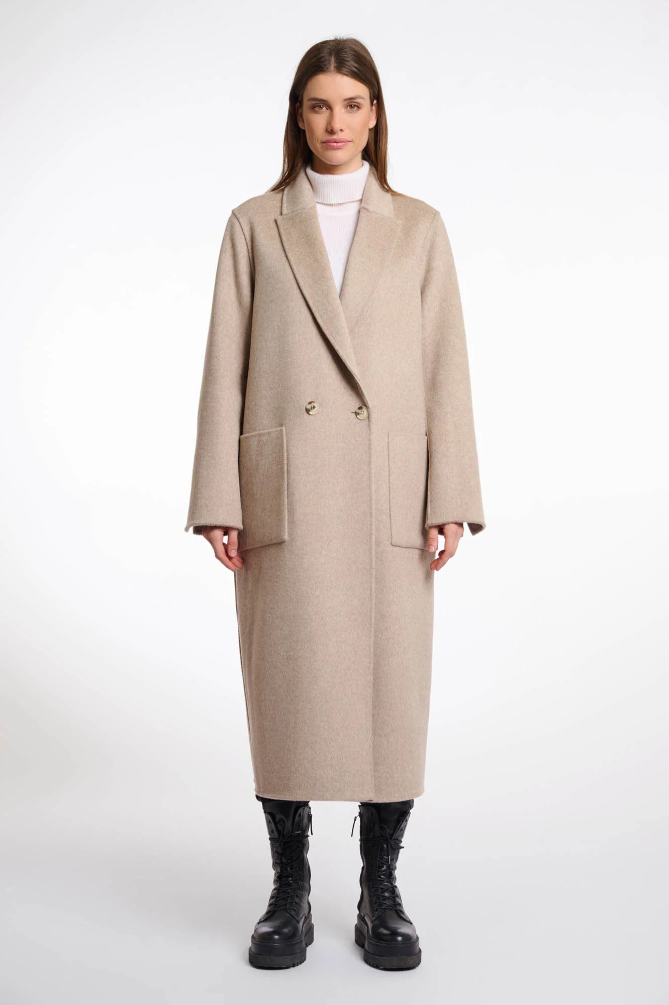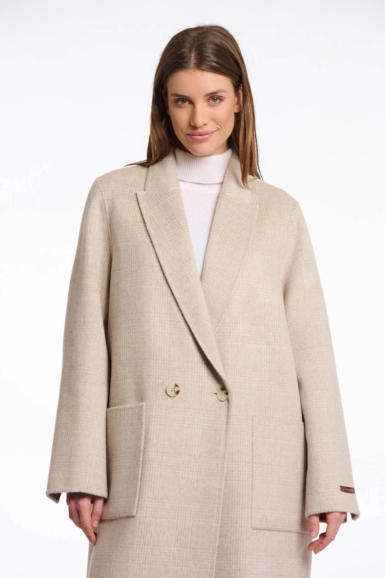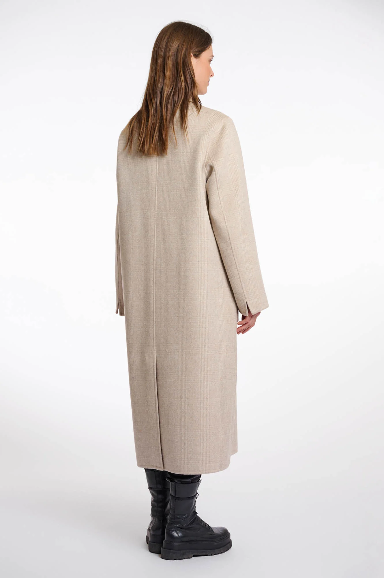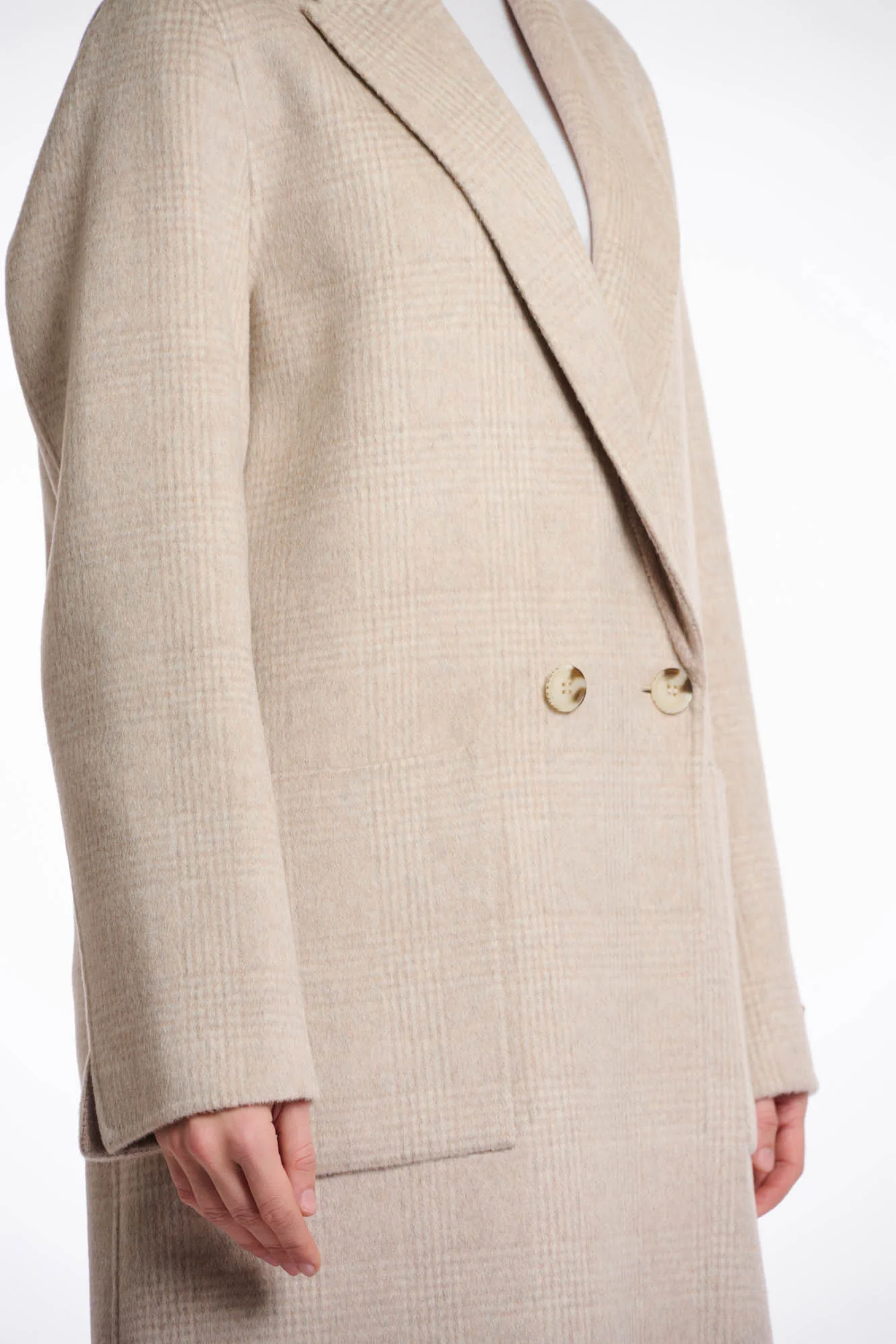 Cappotto lungo doppiopetto in lana riciclata, rifinito a mano, reversibile, disegno check su sfondo nero e grigio, tasche frontali.