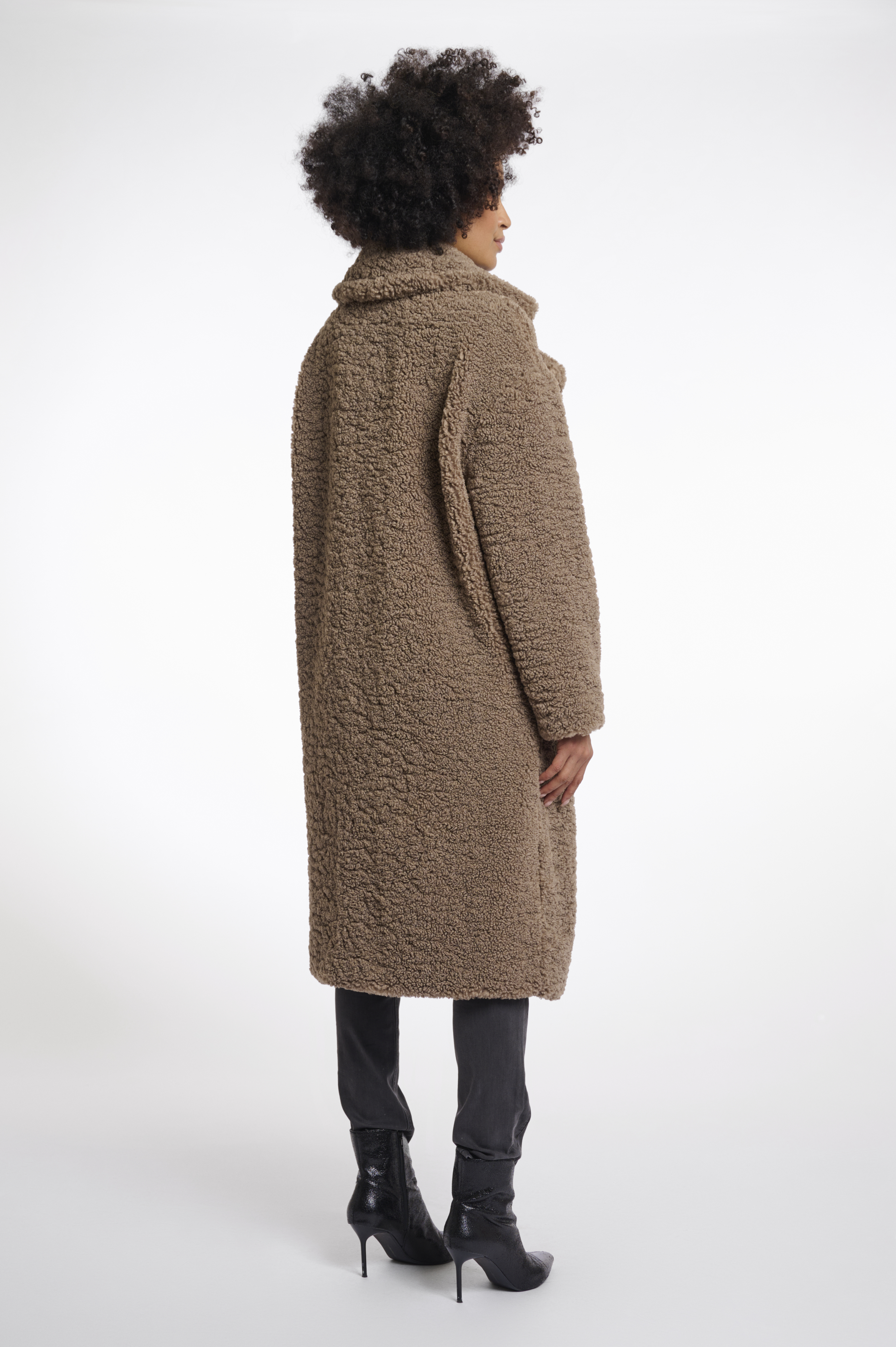 Cappotto teddy doppiopetto, linea dritta, tasche laterali.