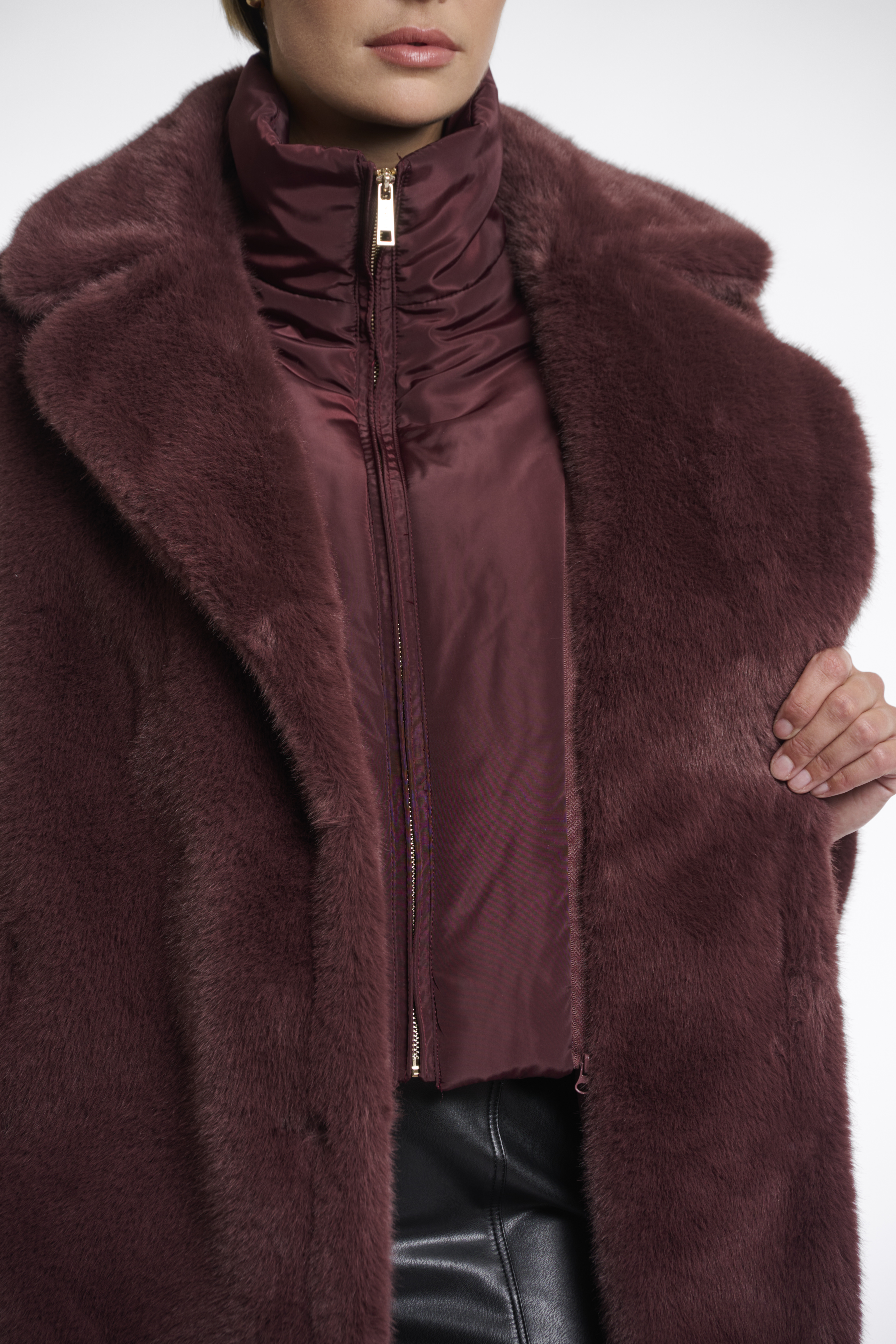 Cappotto monopetto in ecopelliccia con collo trapuntato rimovibile tramite zip.