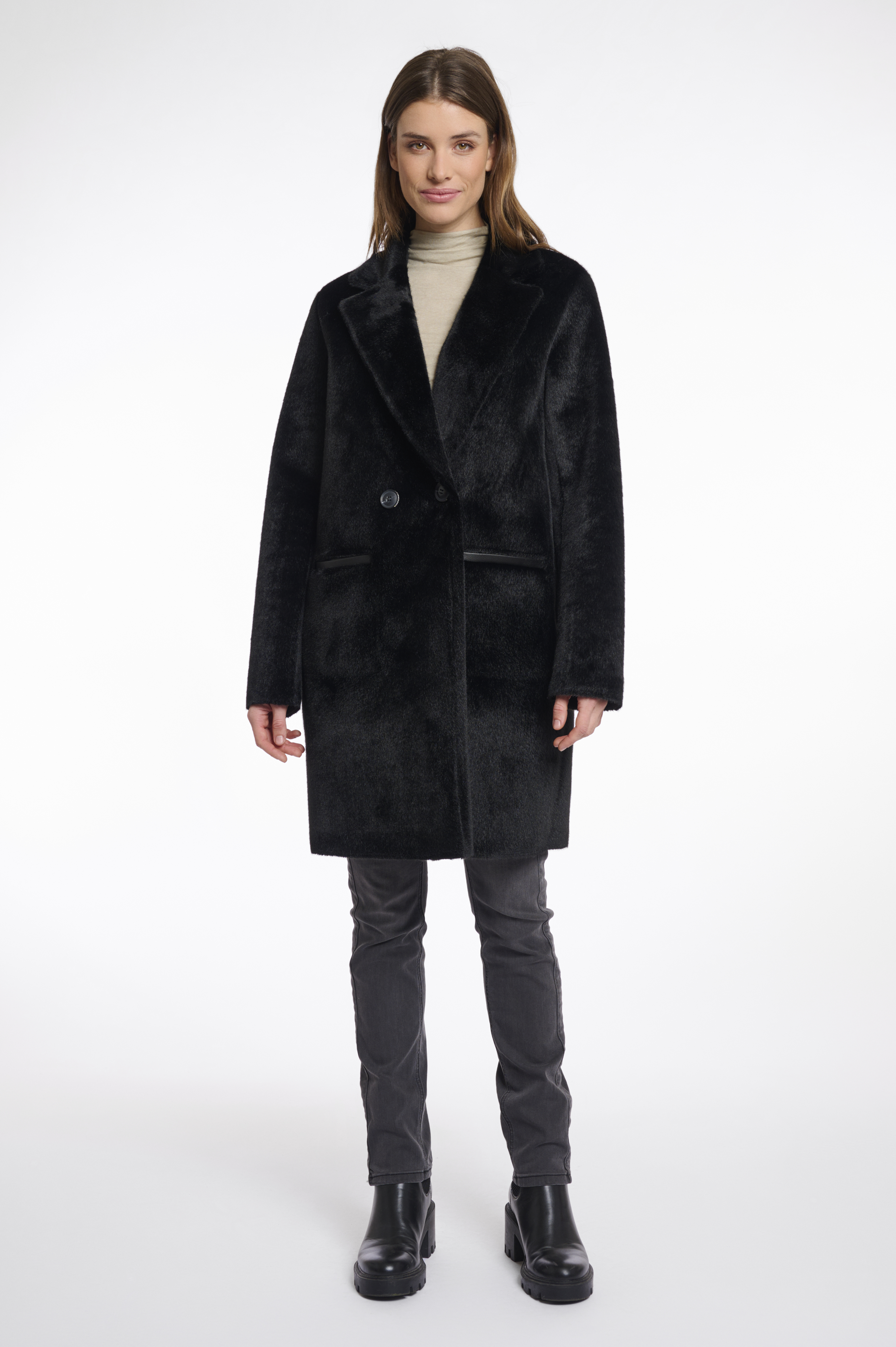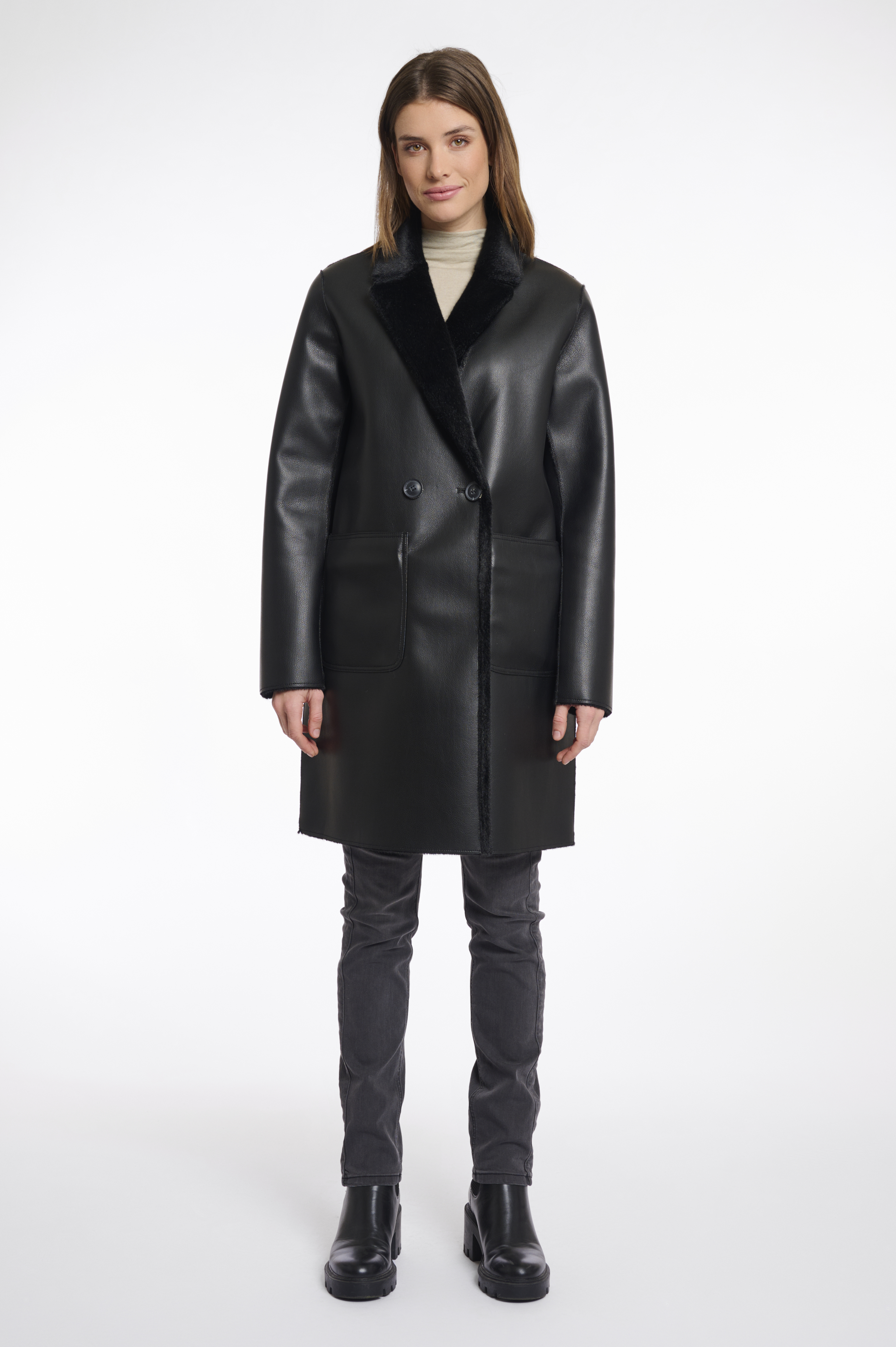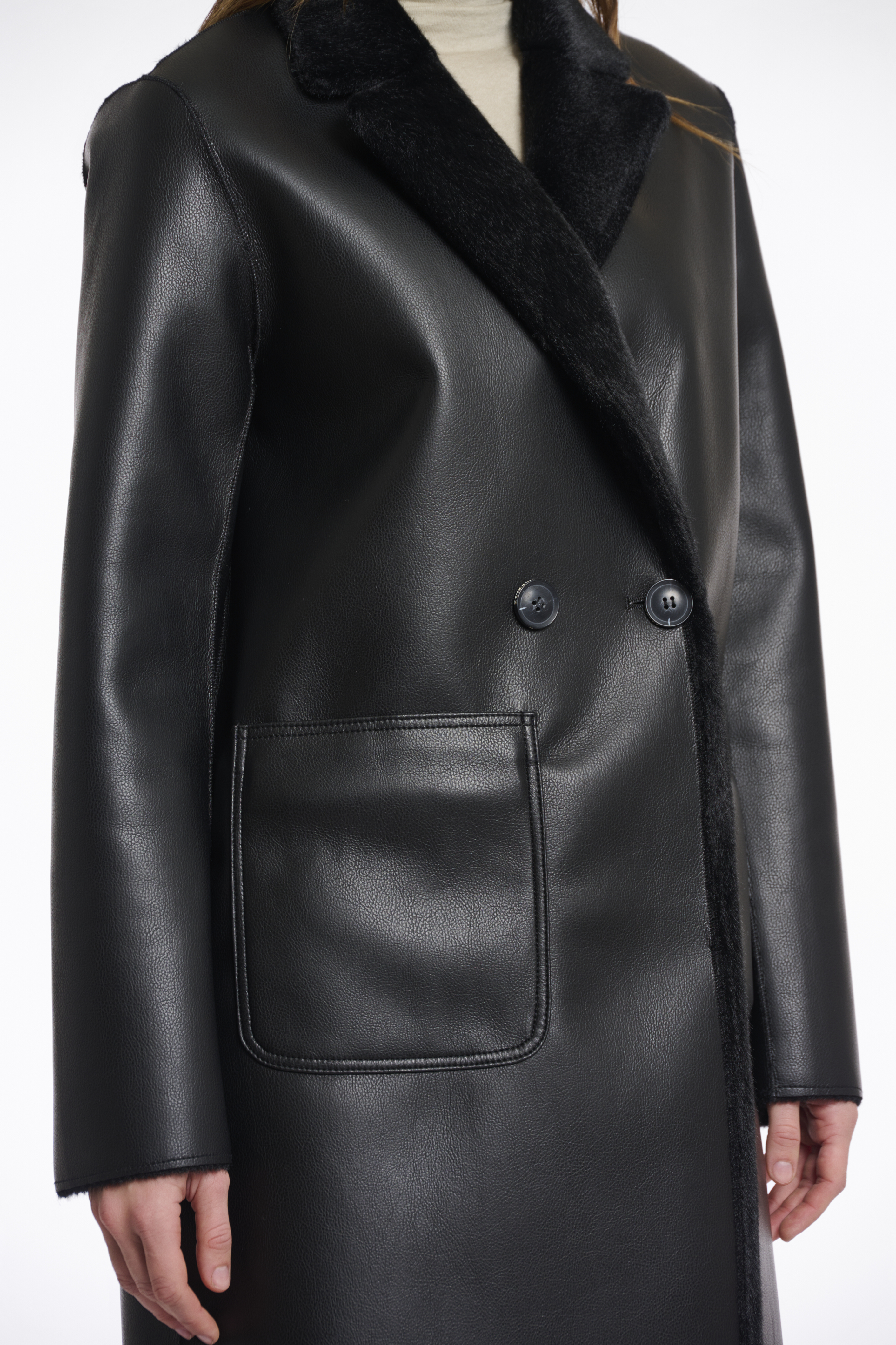 Cappotto doppiopetto reversibile in ecopelle ed ecopelliccia.