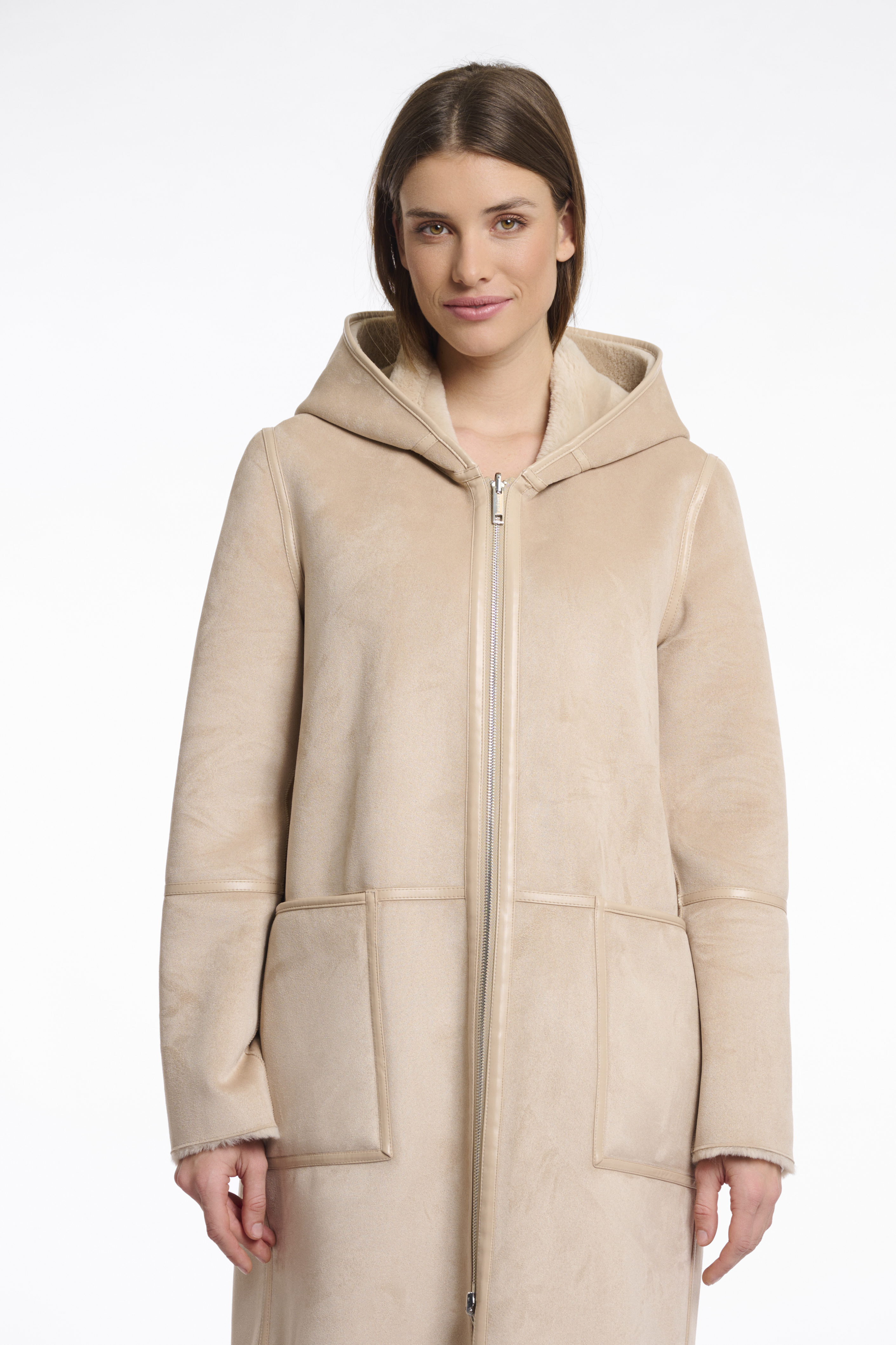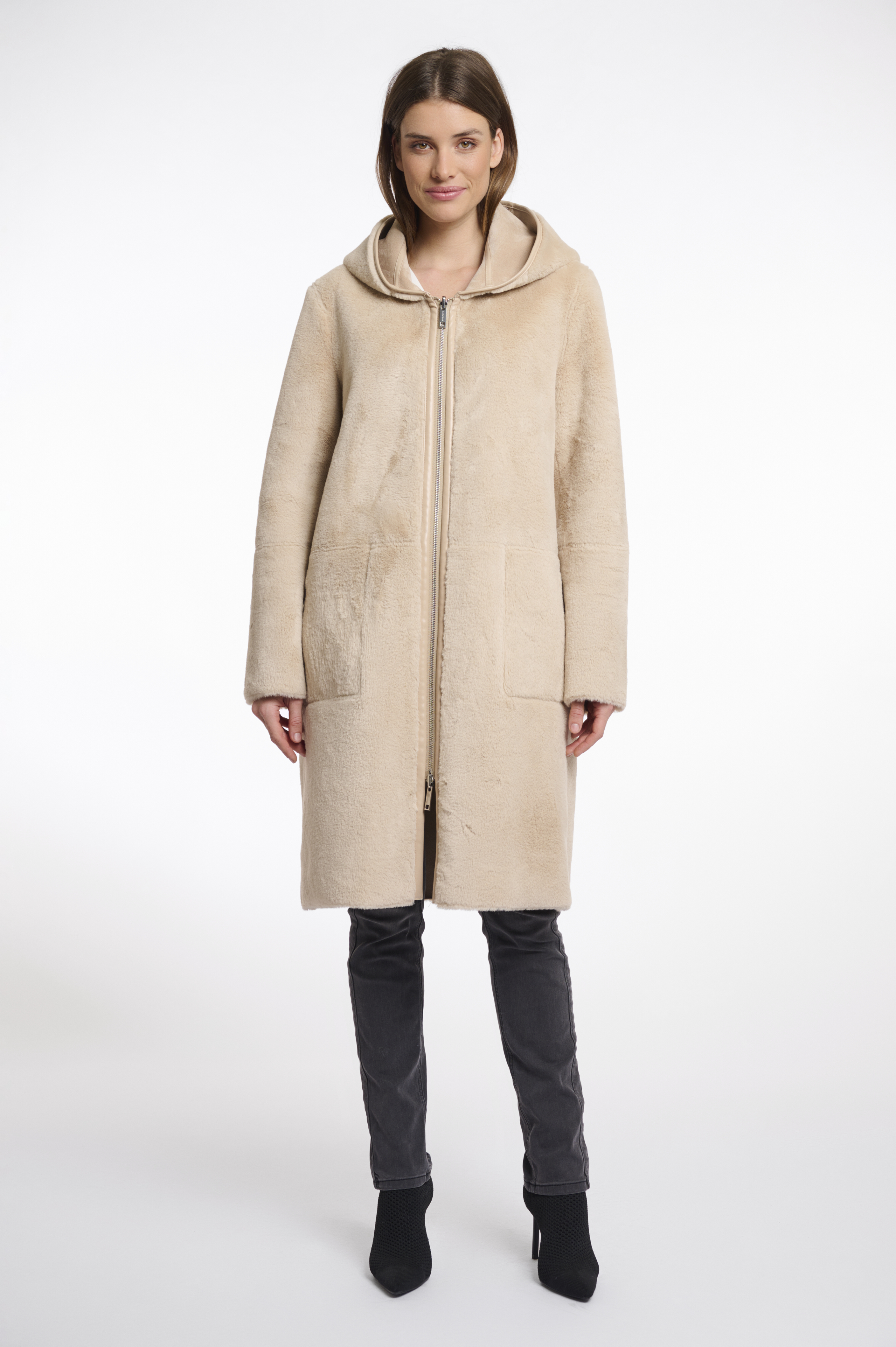 Cappotto reversibile in ecopelliccia ed ecodainetto. Cappuccio, tasconi sul davanti, chiusura con zip.
