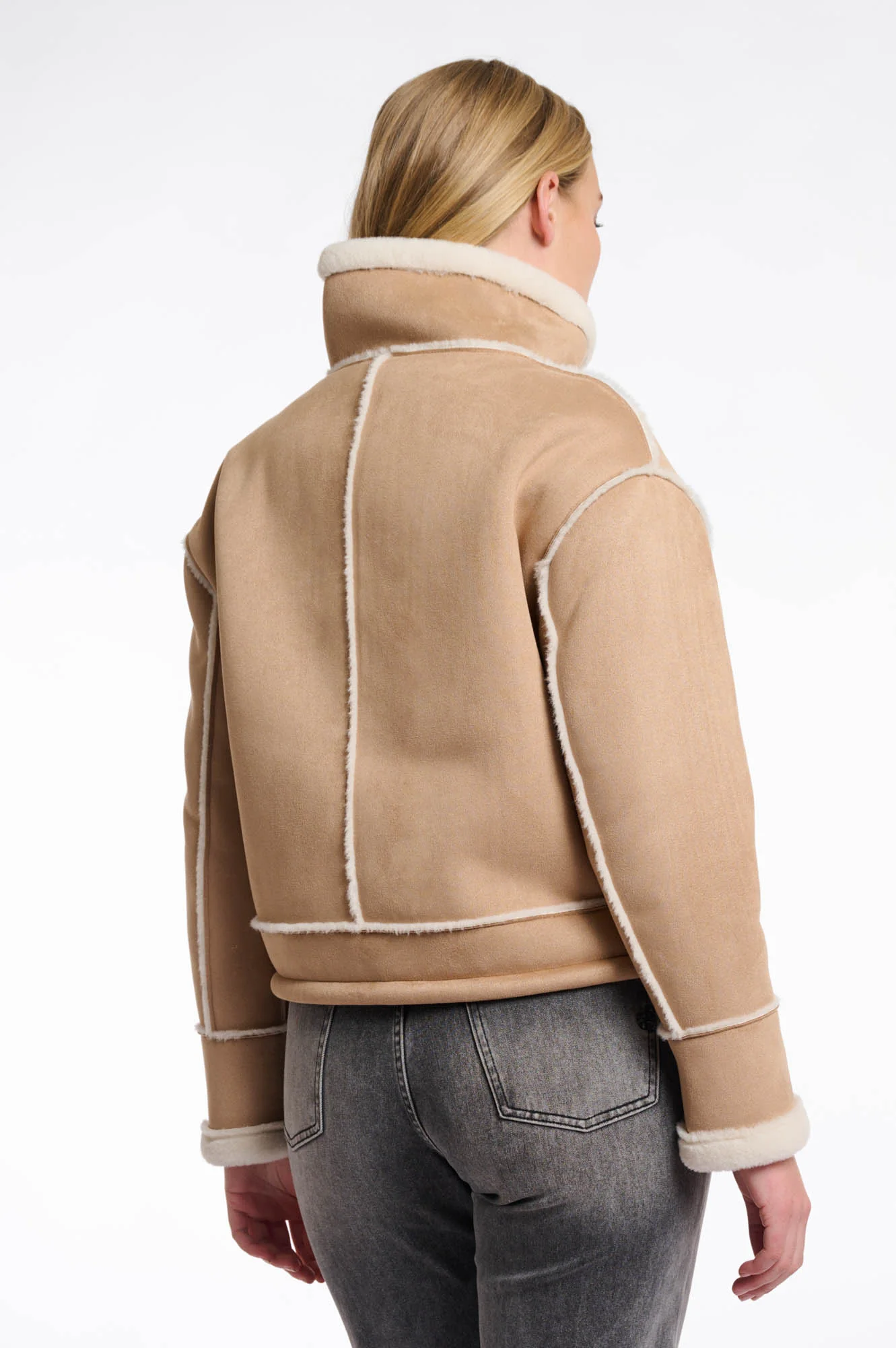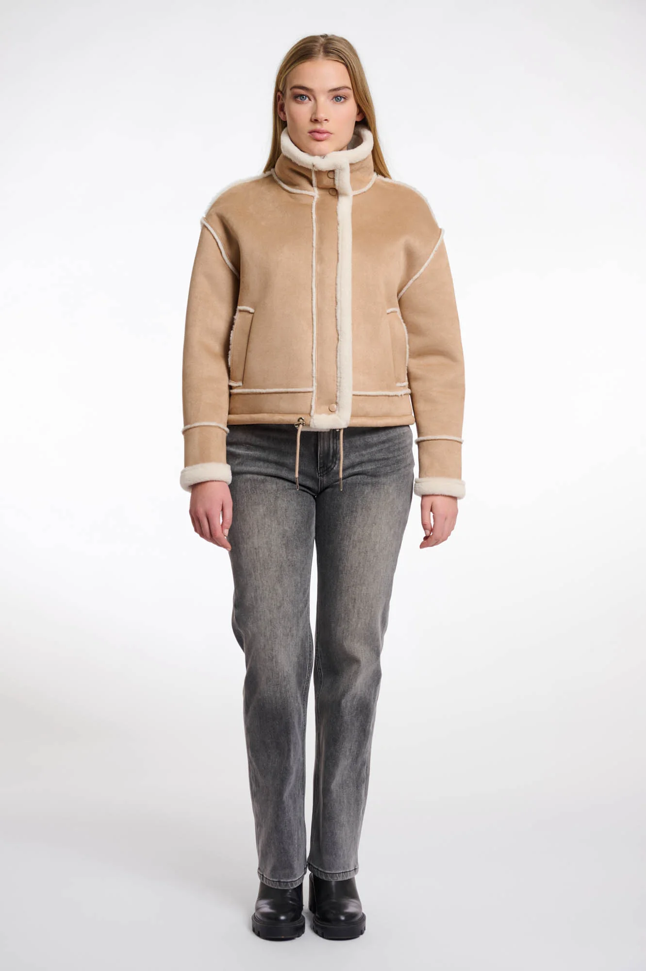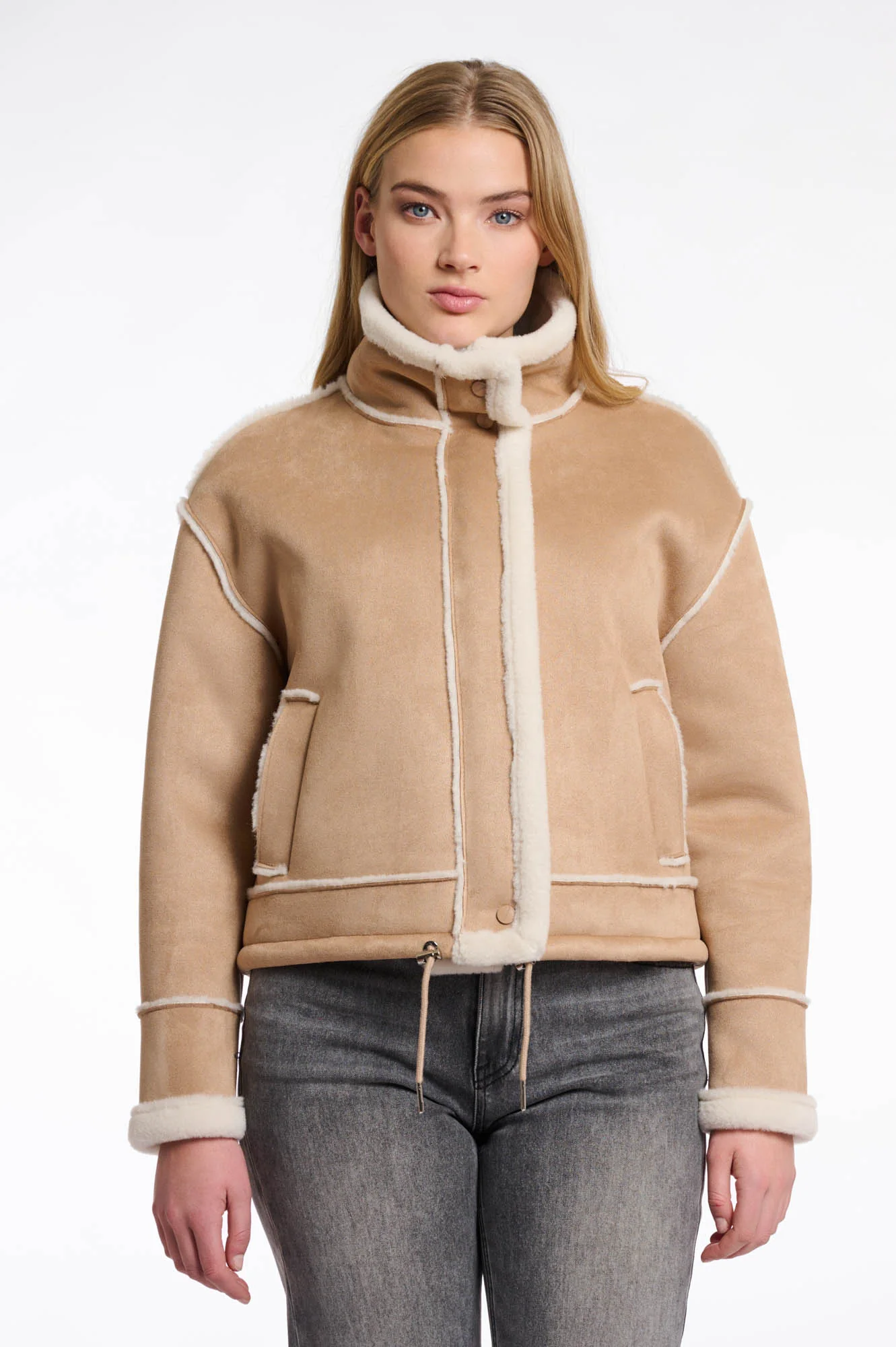 Giacca ecomontone corta, collo alto, rifinirure in ecopelliccia, tasche laterali.