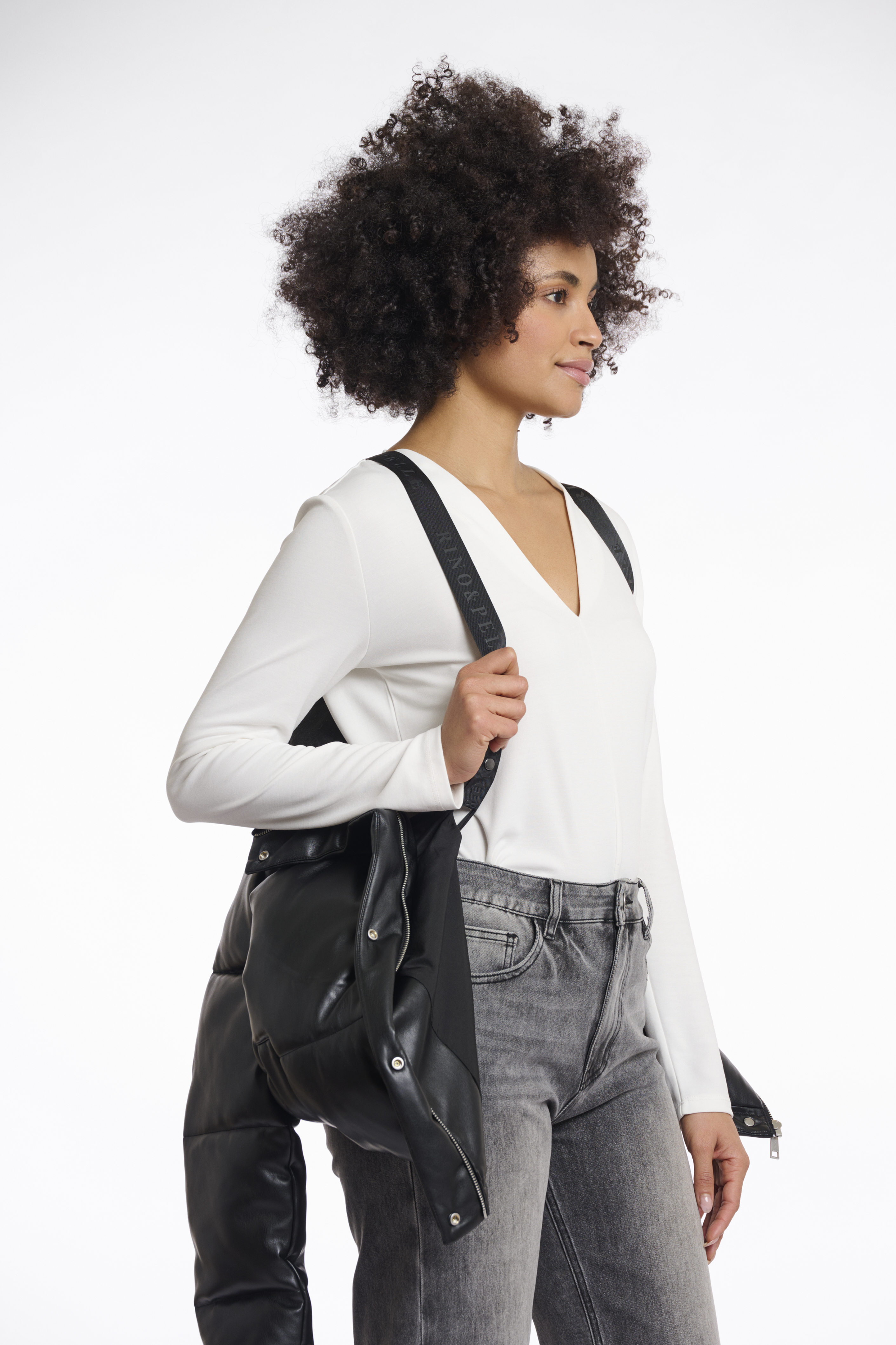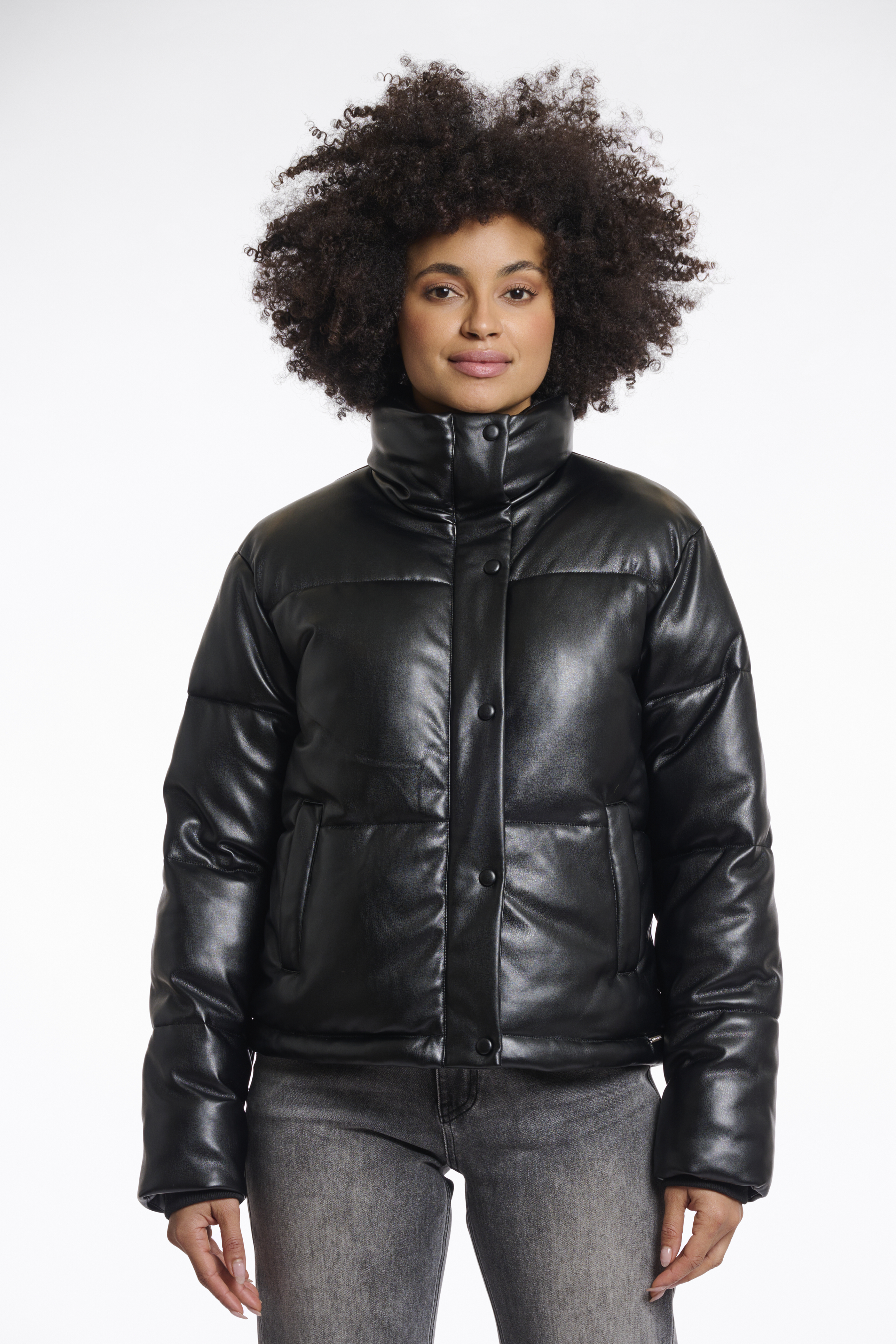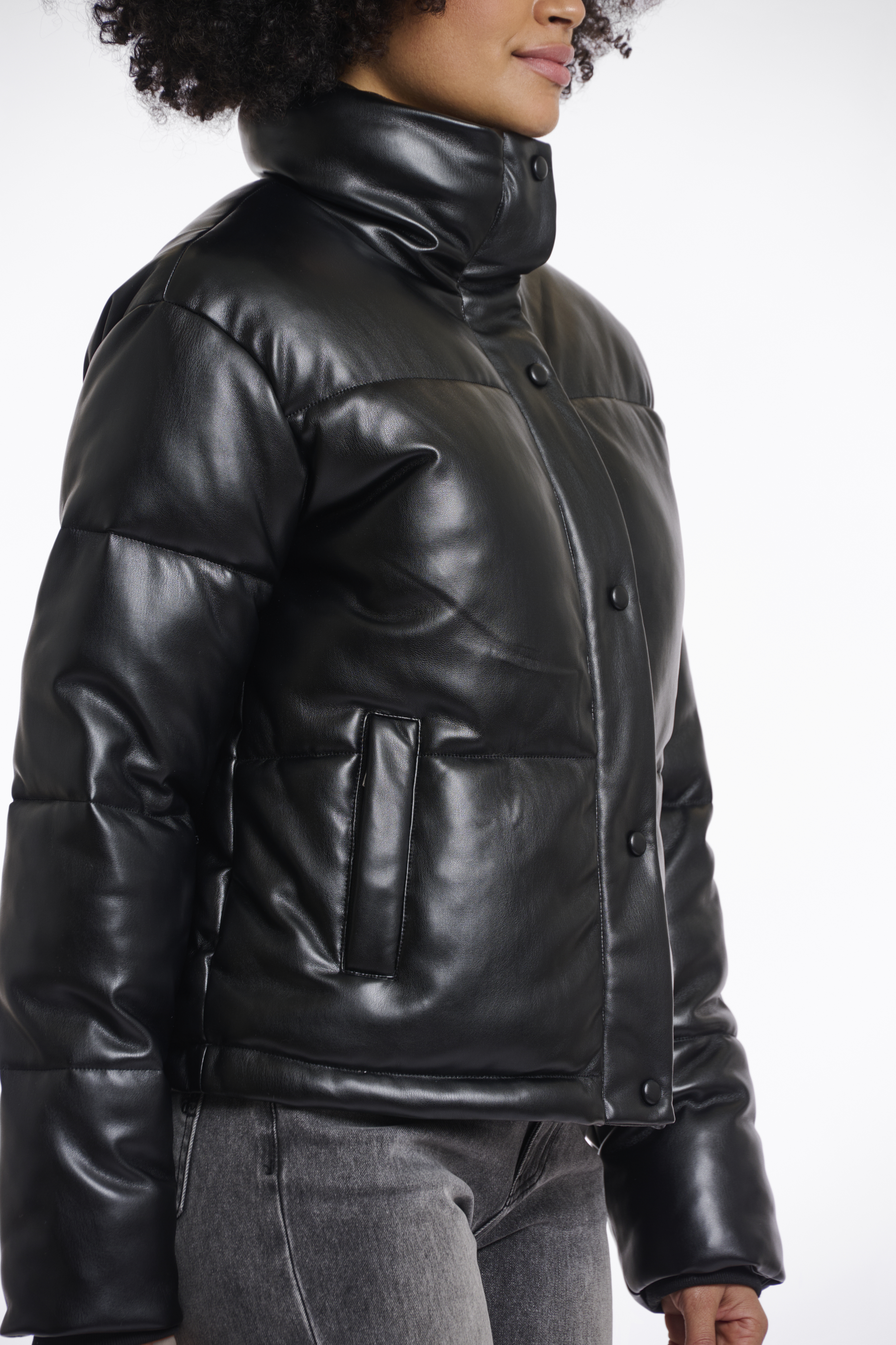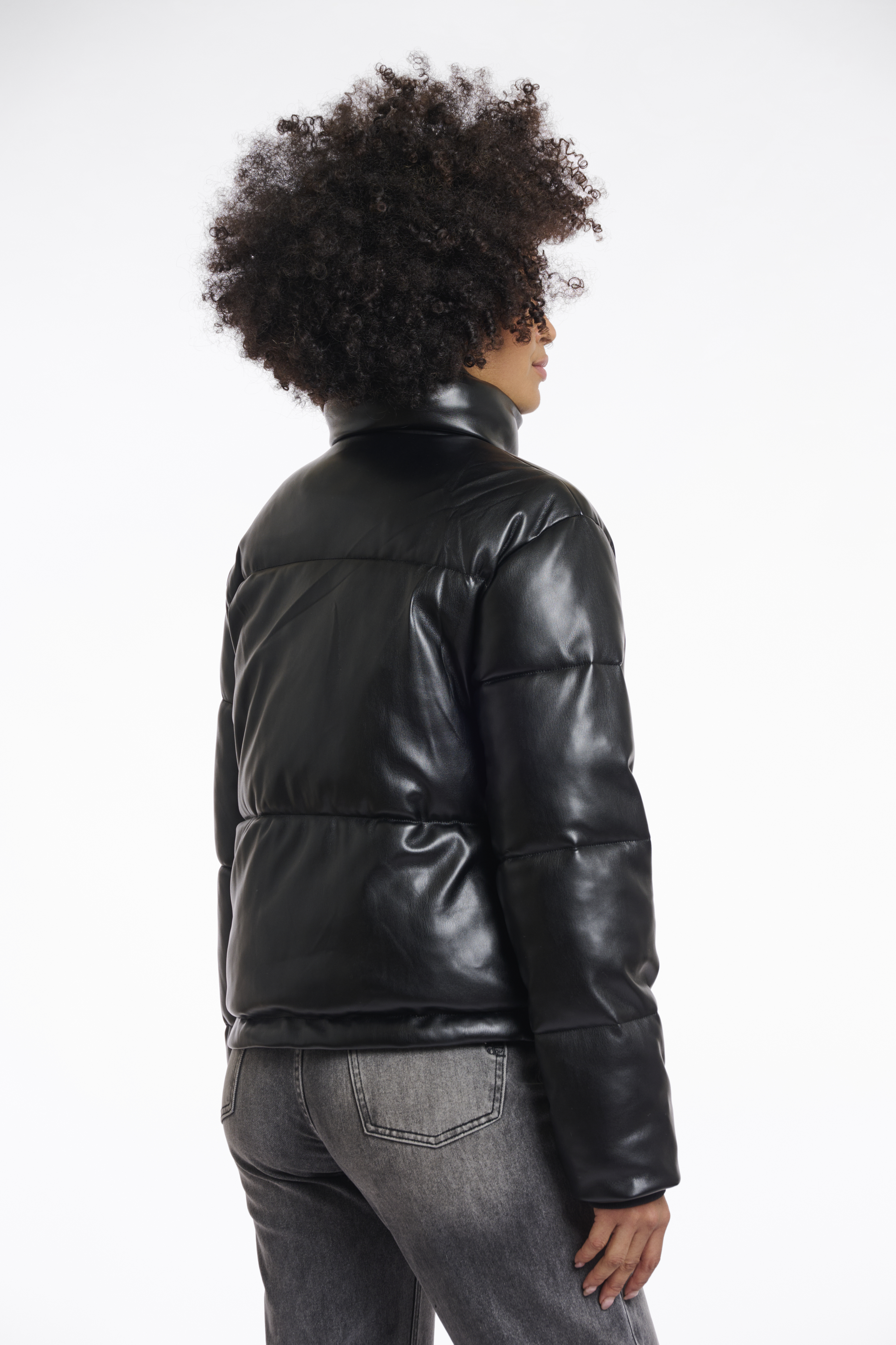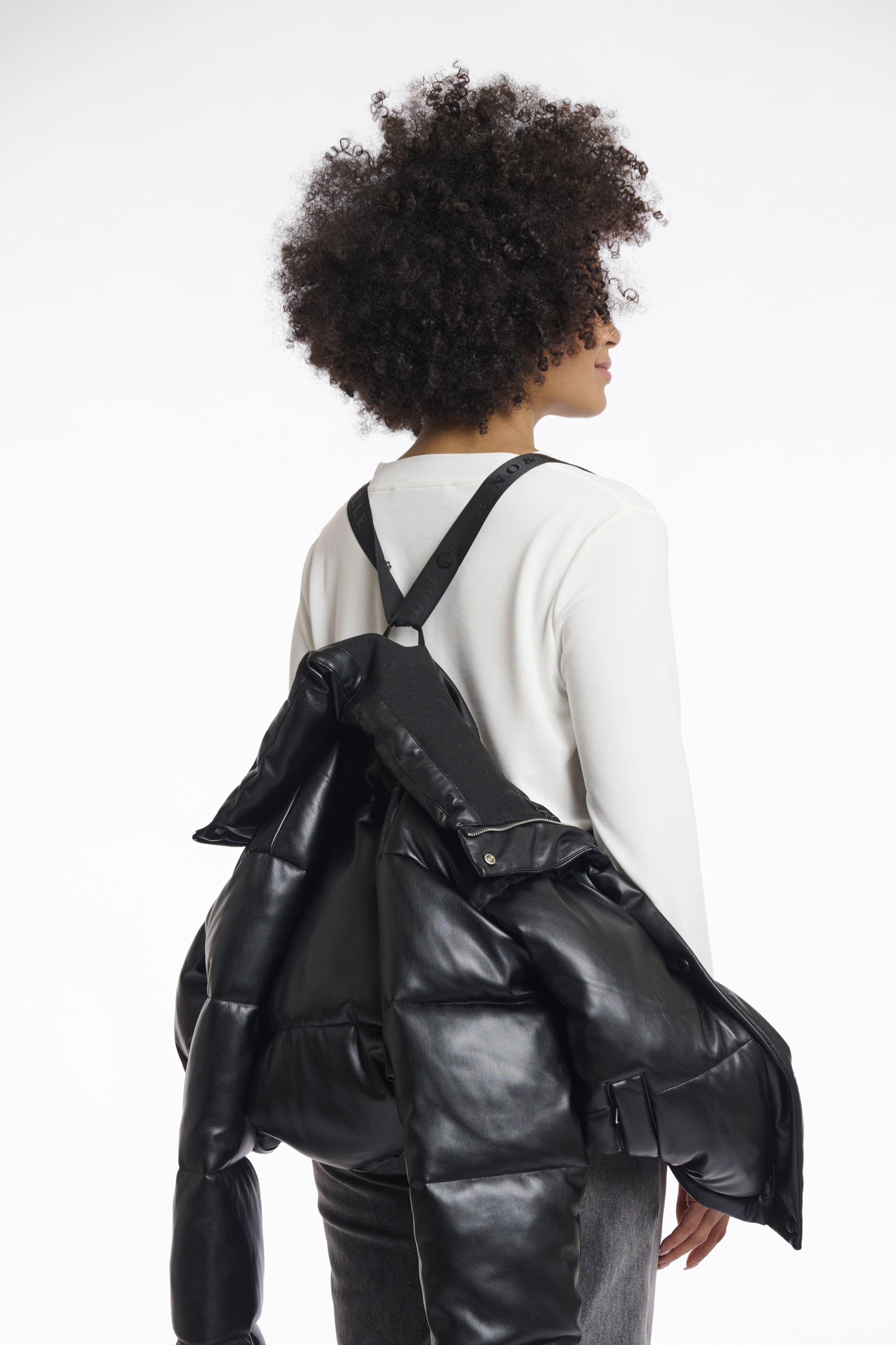 Giacca in ecopelle, interno imbottitio, coulisse interna sul fondo, tasche laterali, chiusura con zip e bottoni a pressione, tasca interna con zip, imbracatura per portarlo comodamente a spalla.