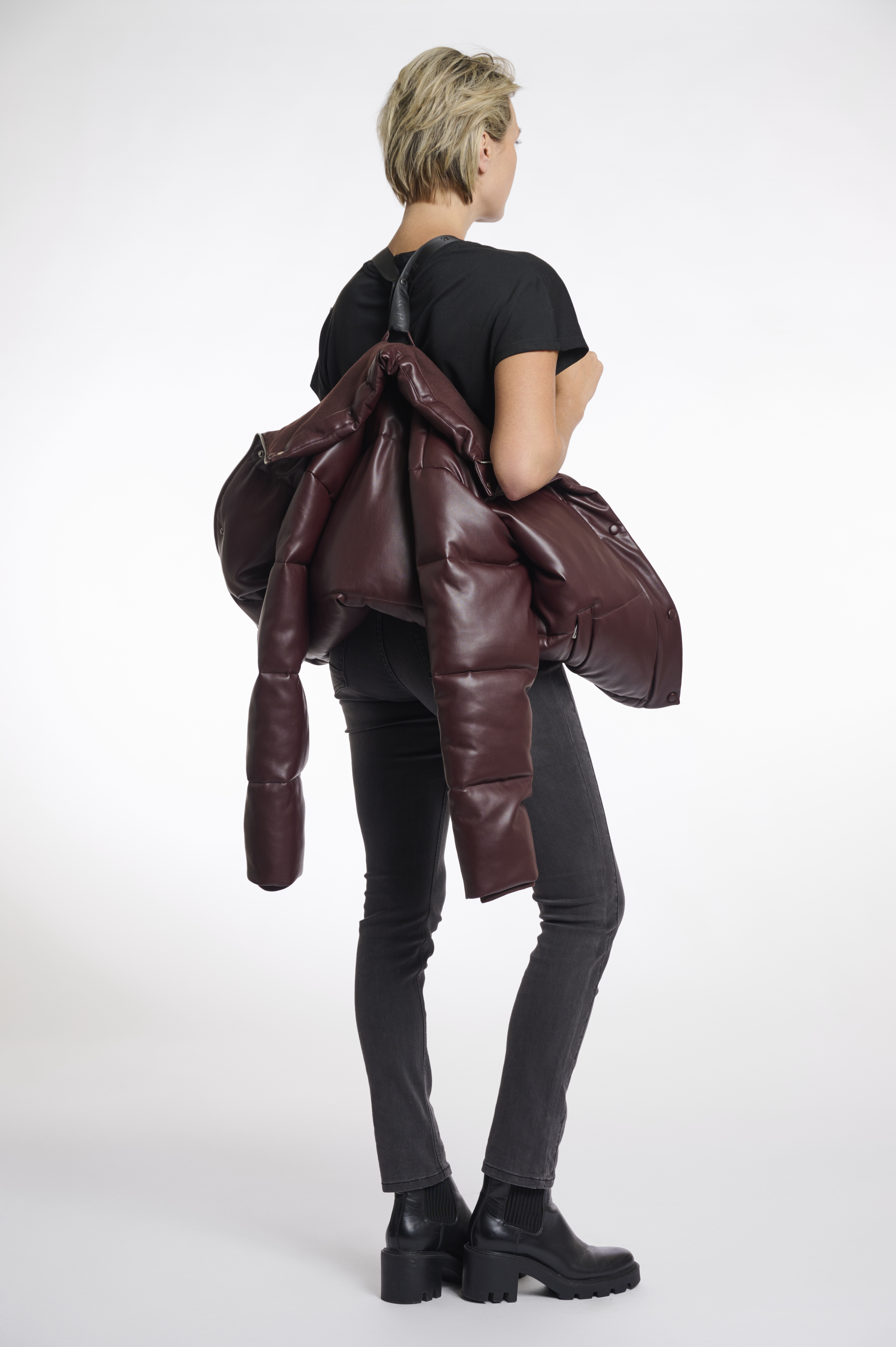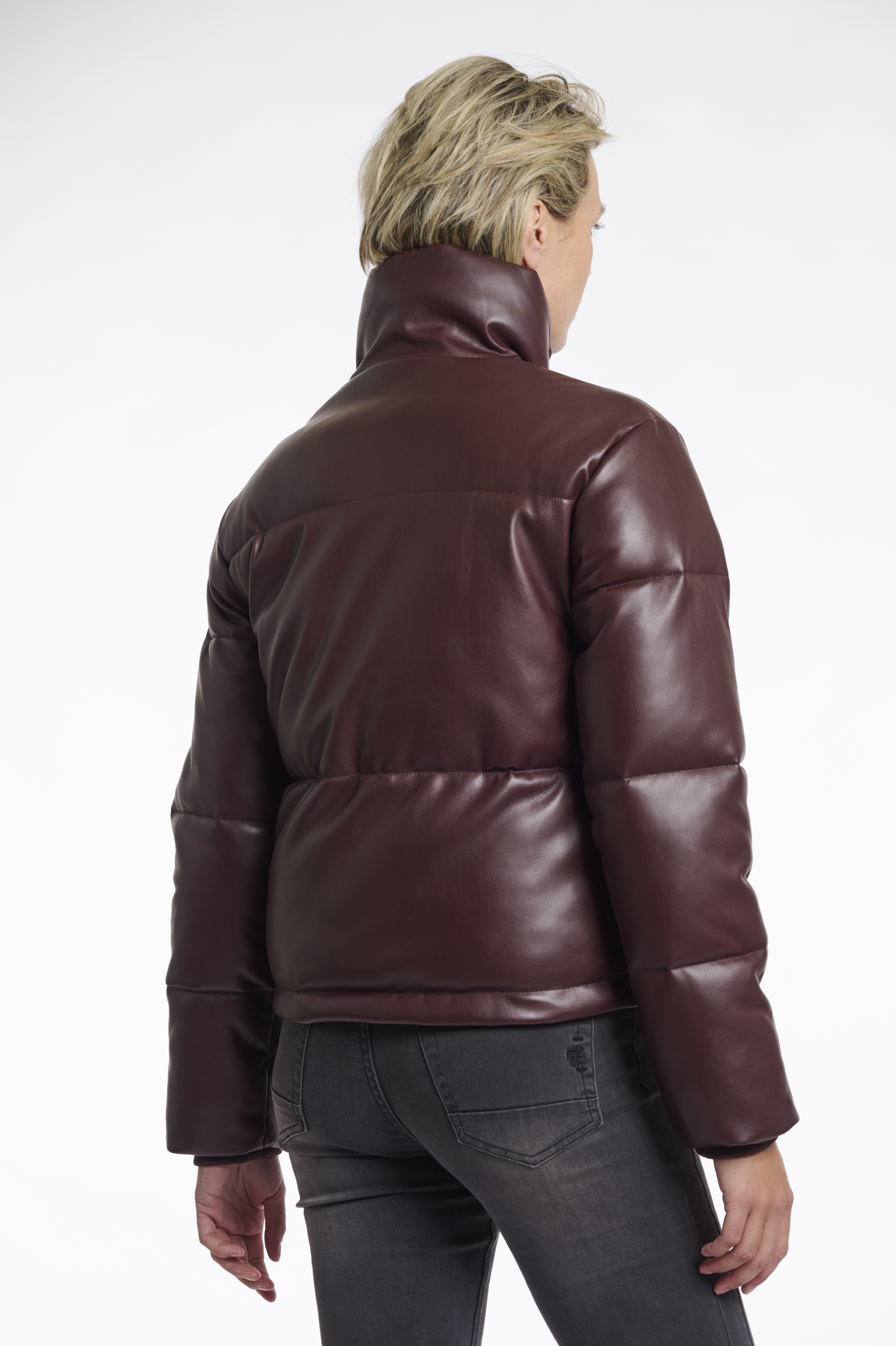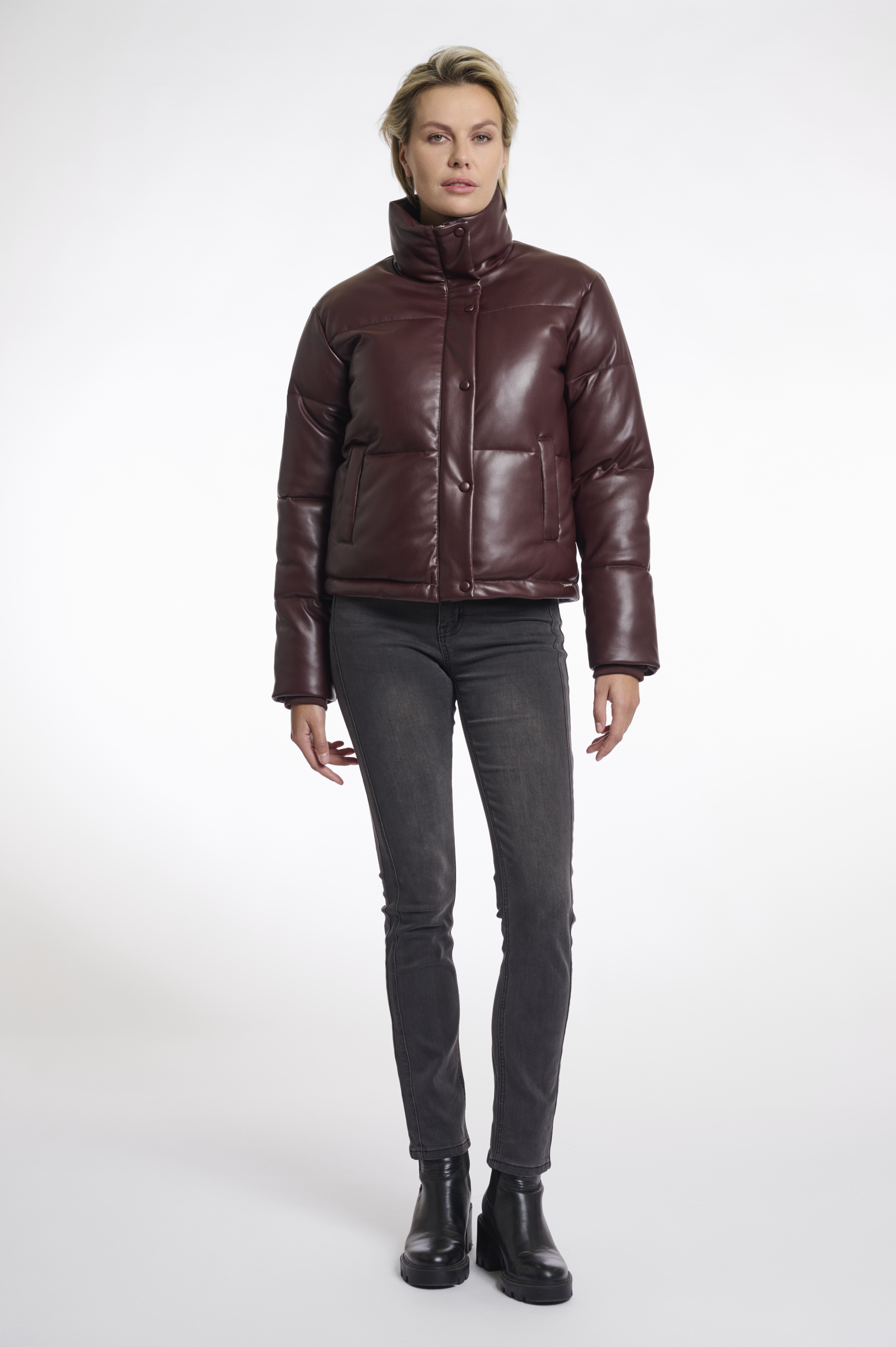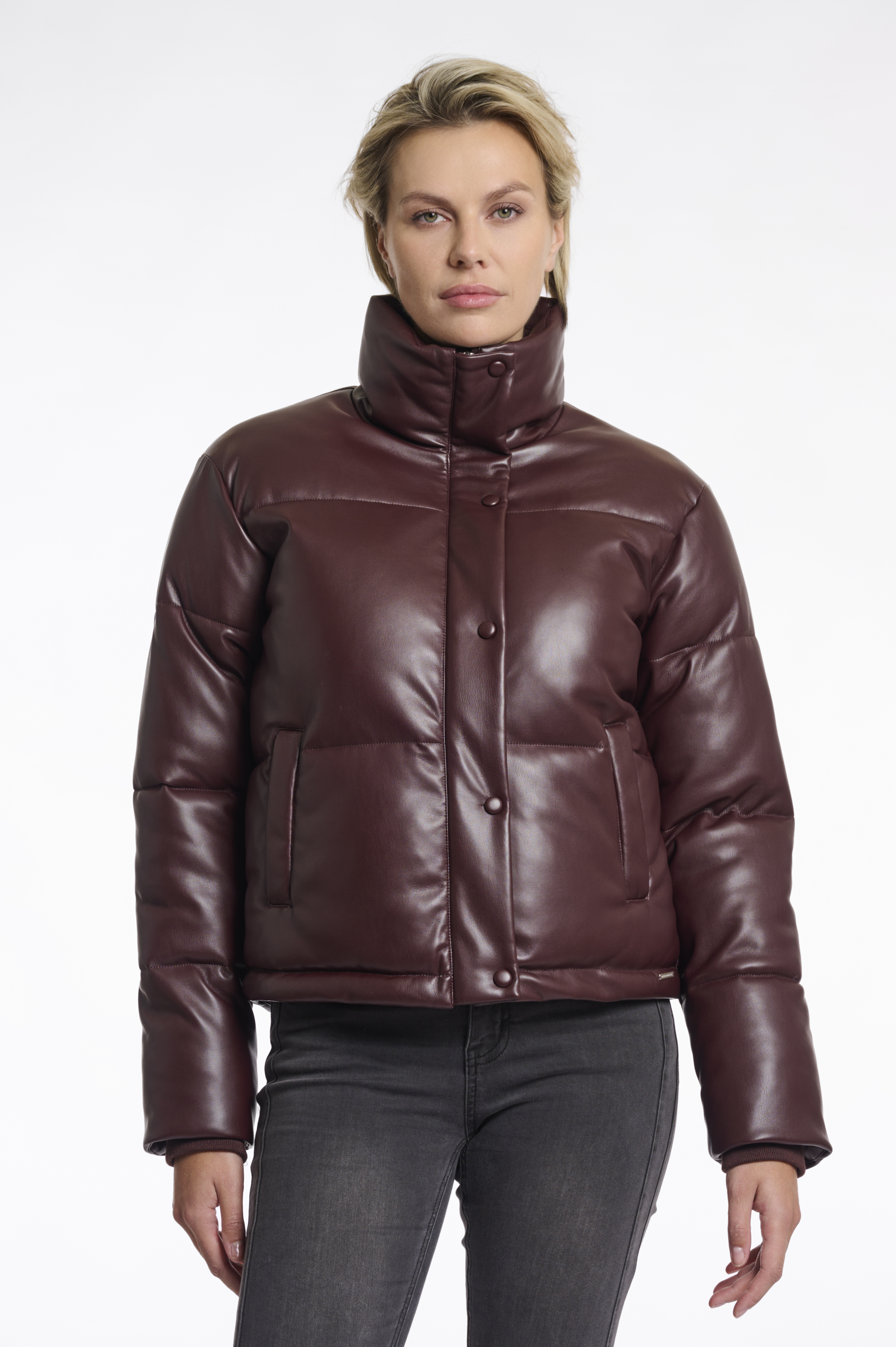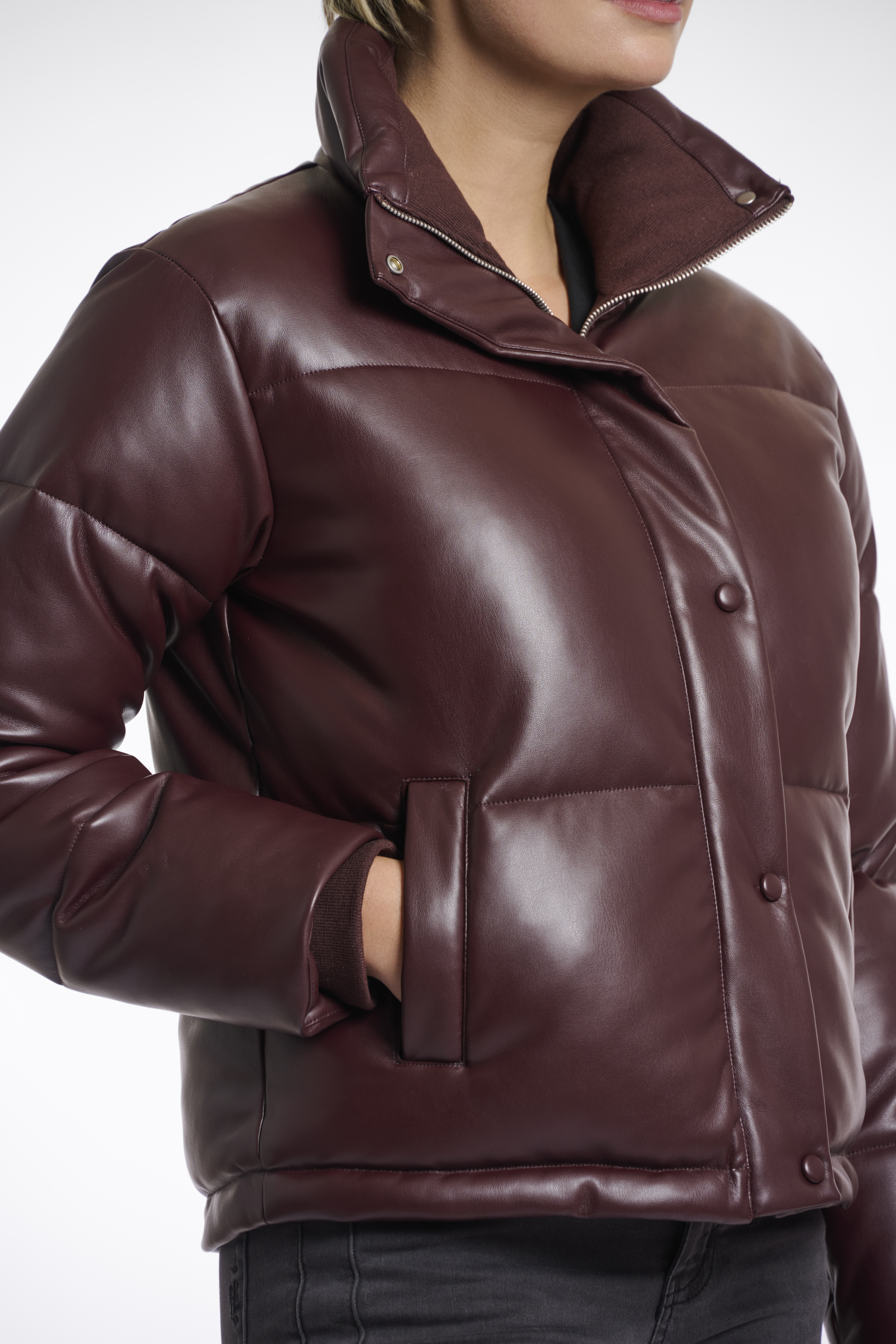 Giacca in ecopelle, interno imbottitio, coulisse interna sul fondo, tasche laterali, chiusura con zip e bottoni a pressione, tasca interna con zip, imbracatura per portarlo comodamente a spalla.