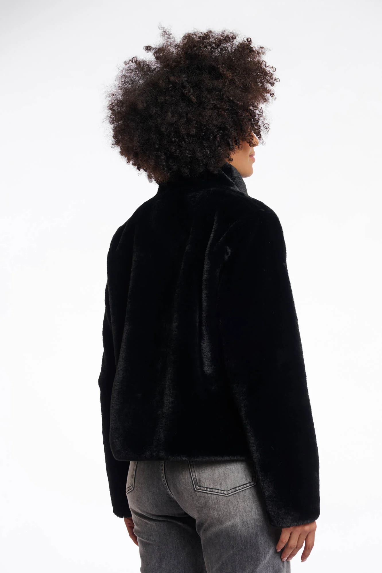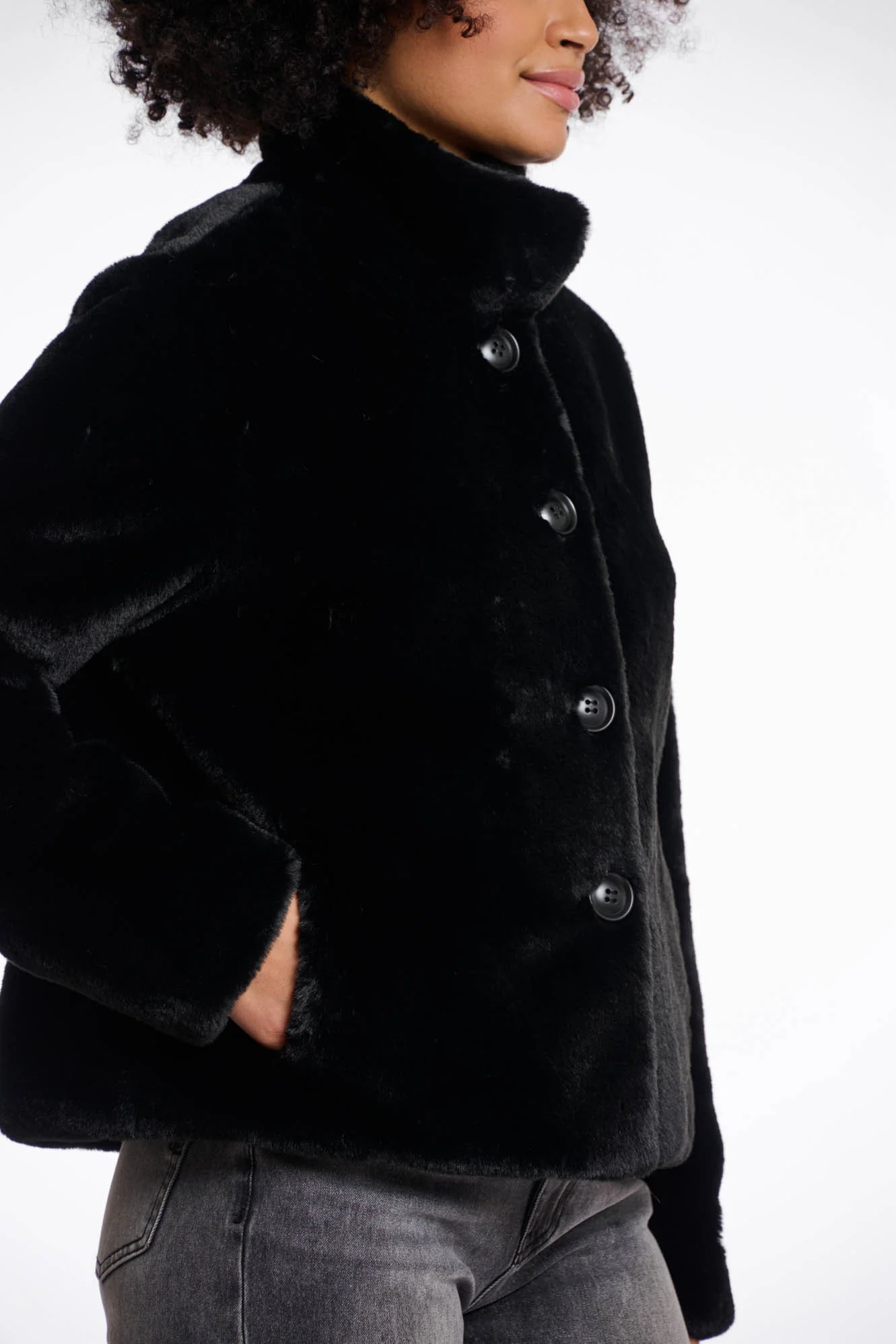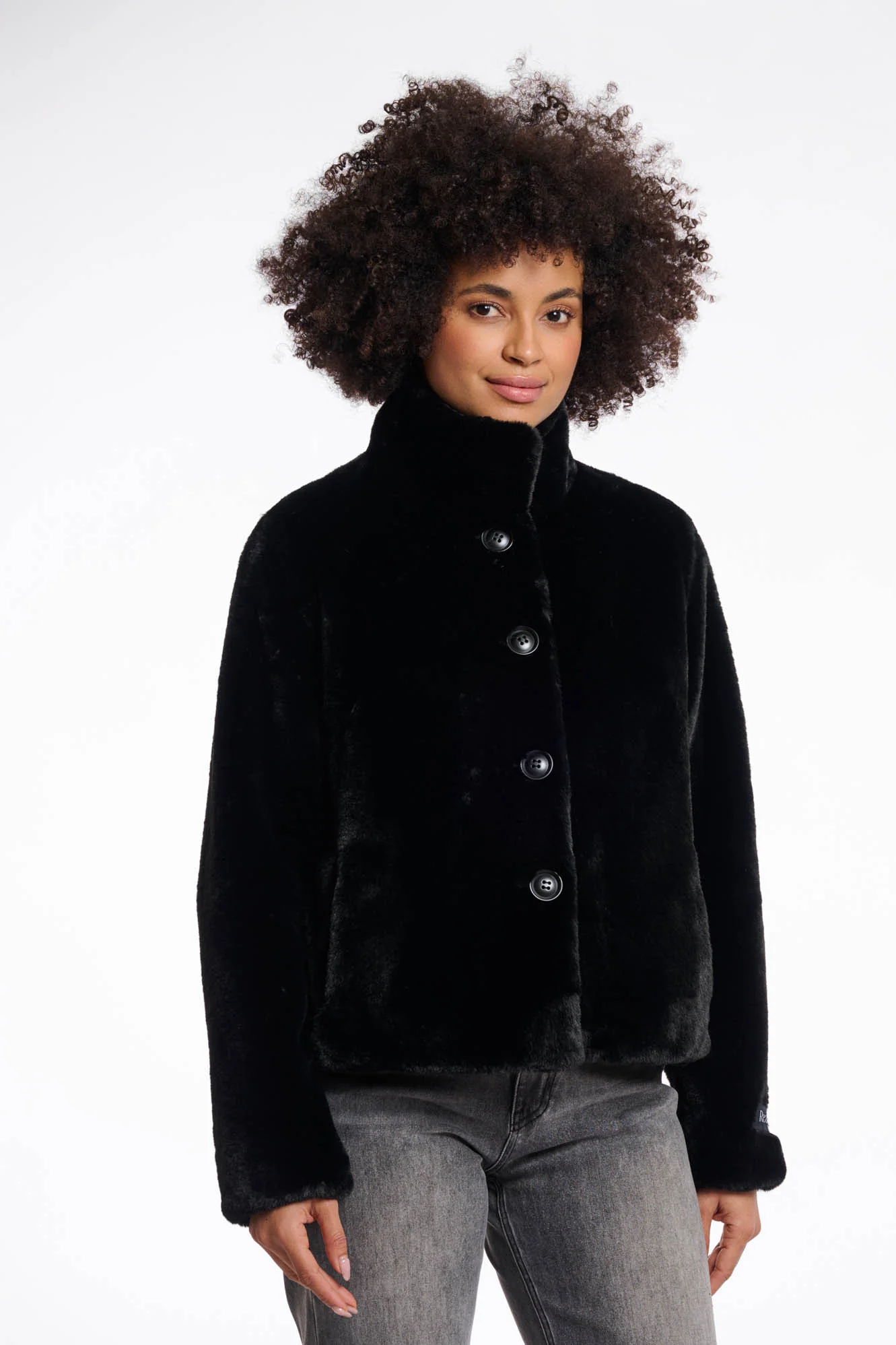 Giacca corta in ecopelliccia, collo alto, tasche laterali, chiusura con bottoni.