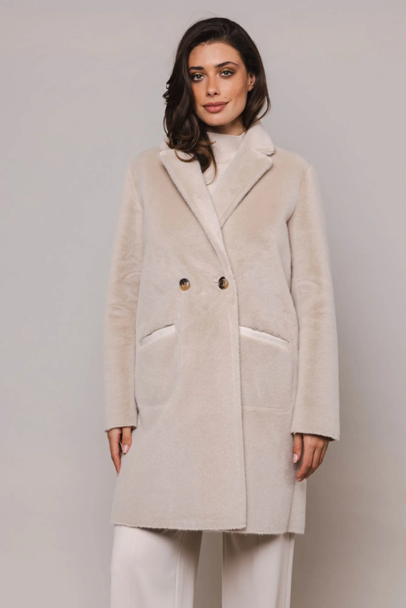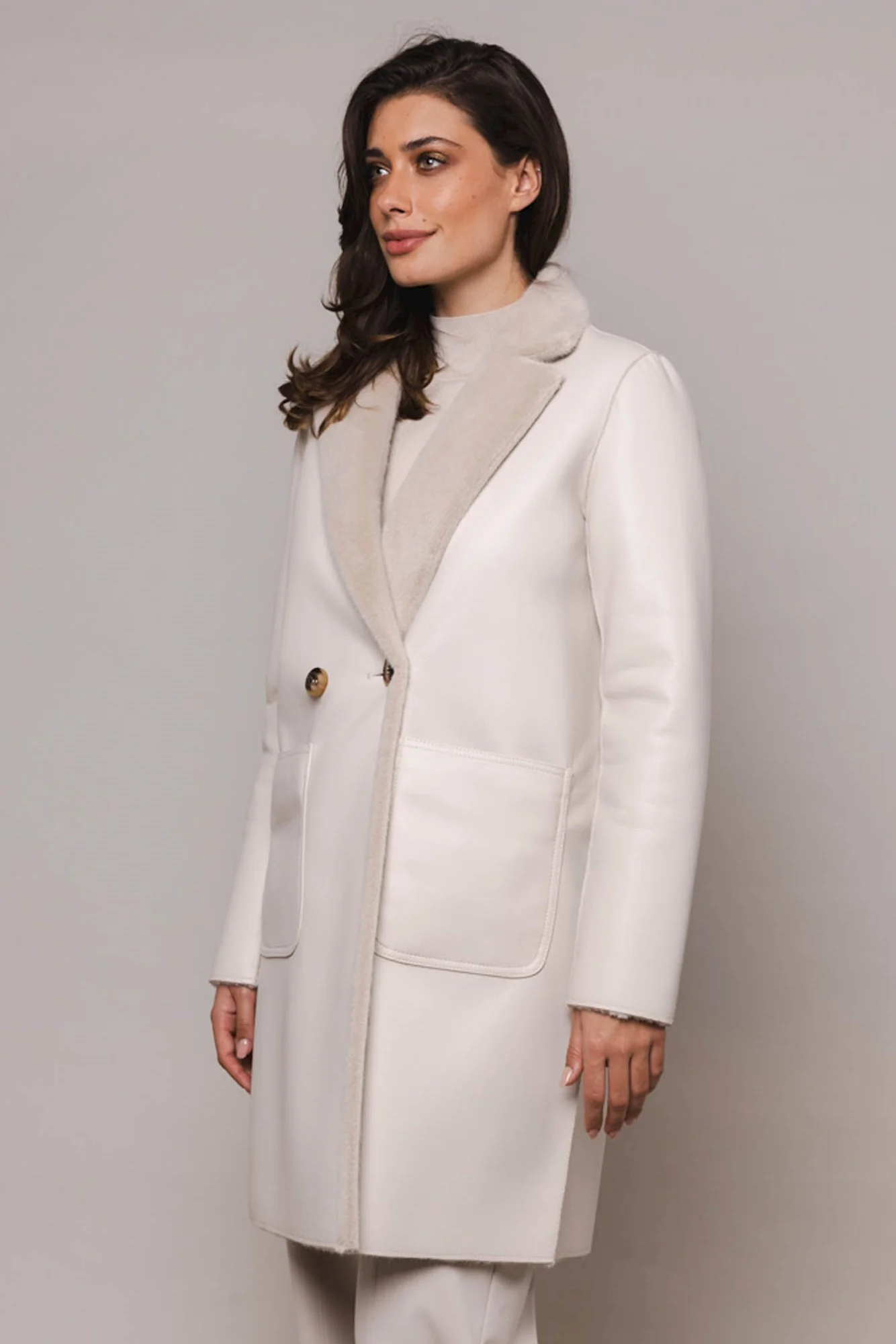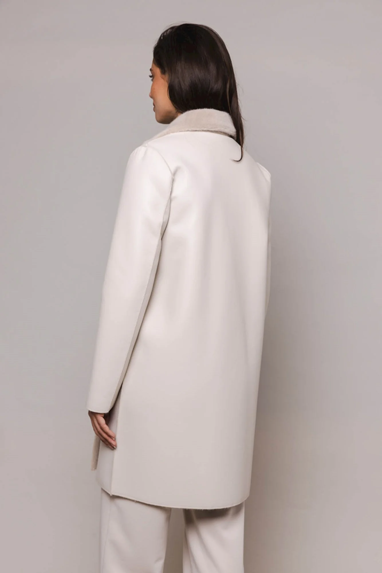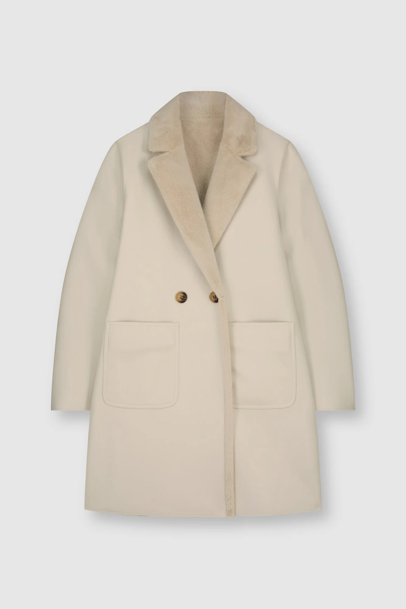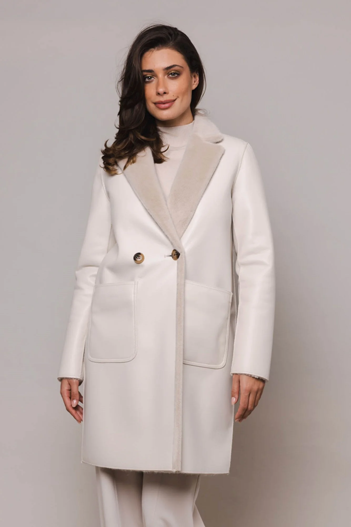 Cappotto reversibile in ecopelle. Media lunghezza.Chiusura doppiopetto e un colletto con revers. Da un lato il cappotto è realizzato in ecopelle e presenta due tasche frontali aperte. L'altro lato è realizzato in lussuosa pelliccia sintetica e presenta due tasche frontali aperte con dettagli in ecopelle.