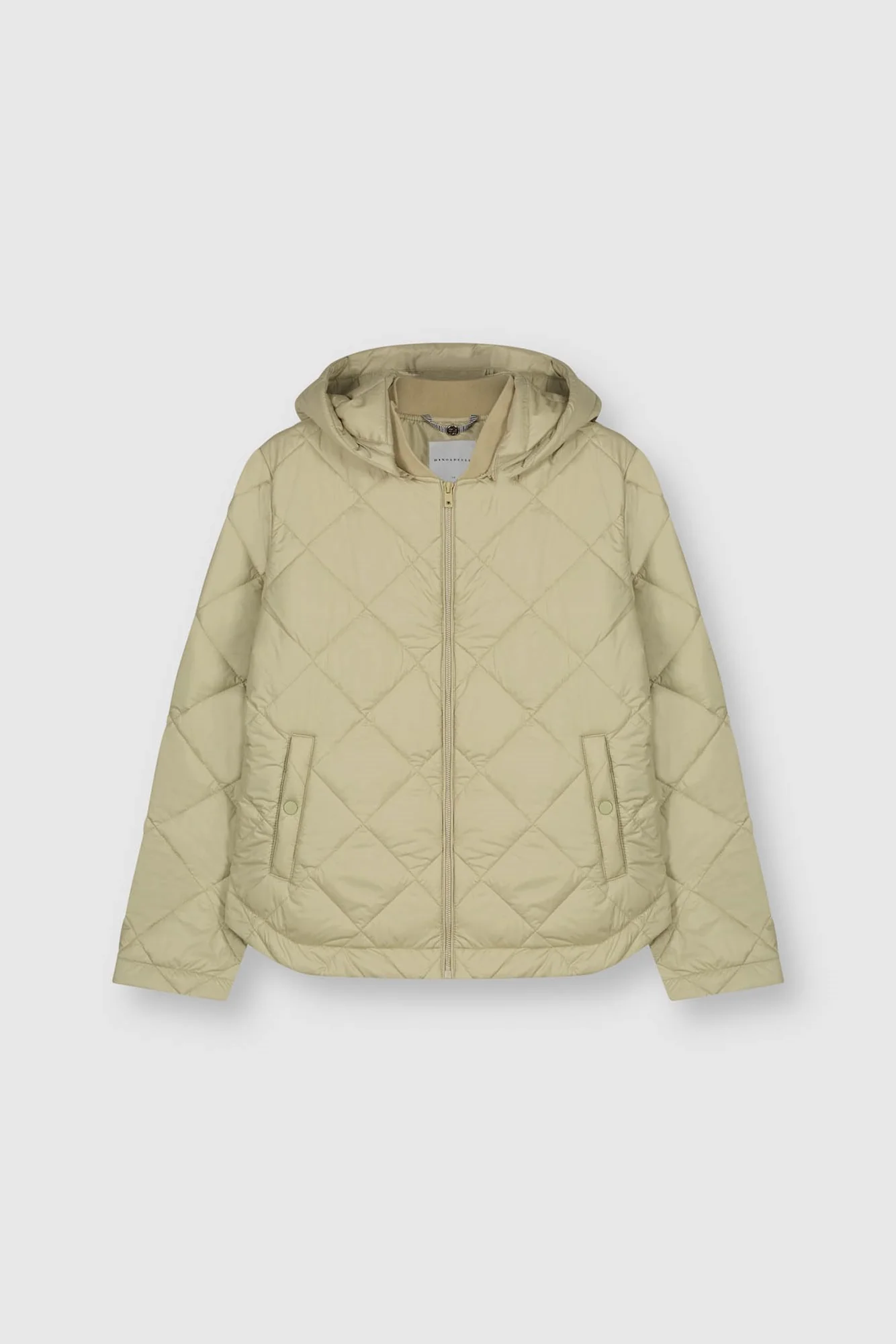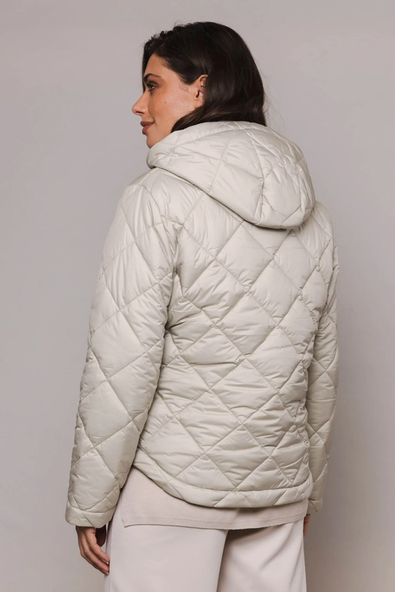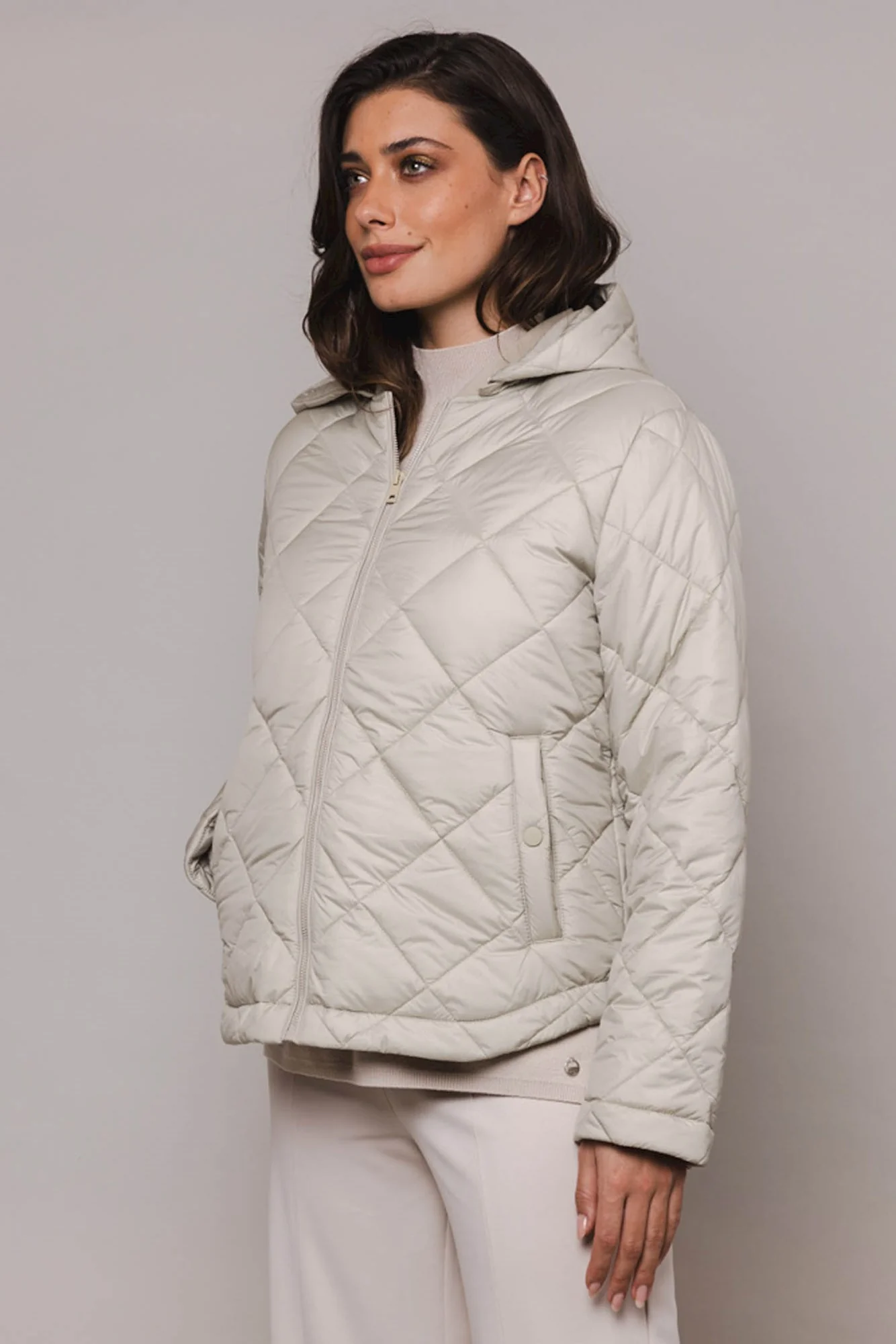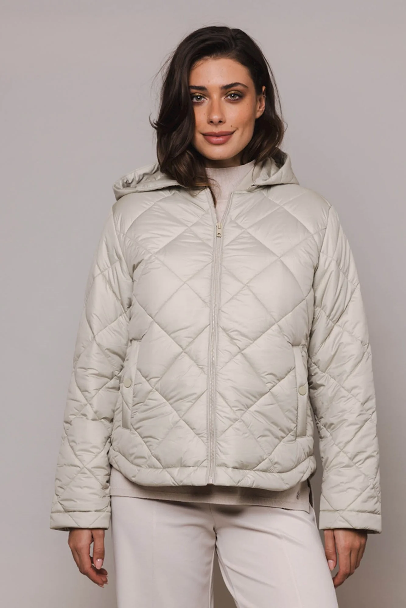Piumino leggero con colletto elasticizzato e cappuccio staccabile. Chiusura con cerniera e tasche all'americana e bottone a pressione.