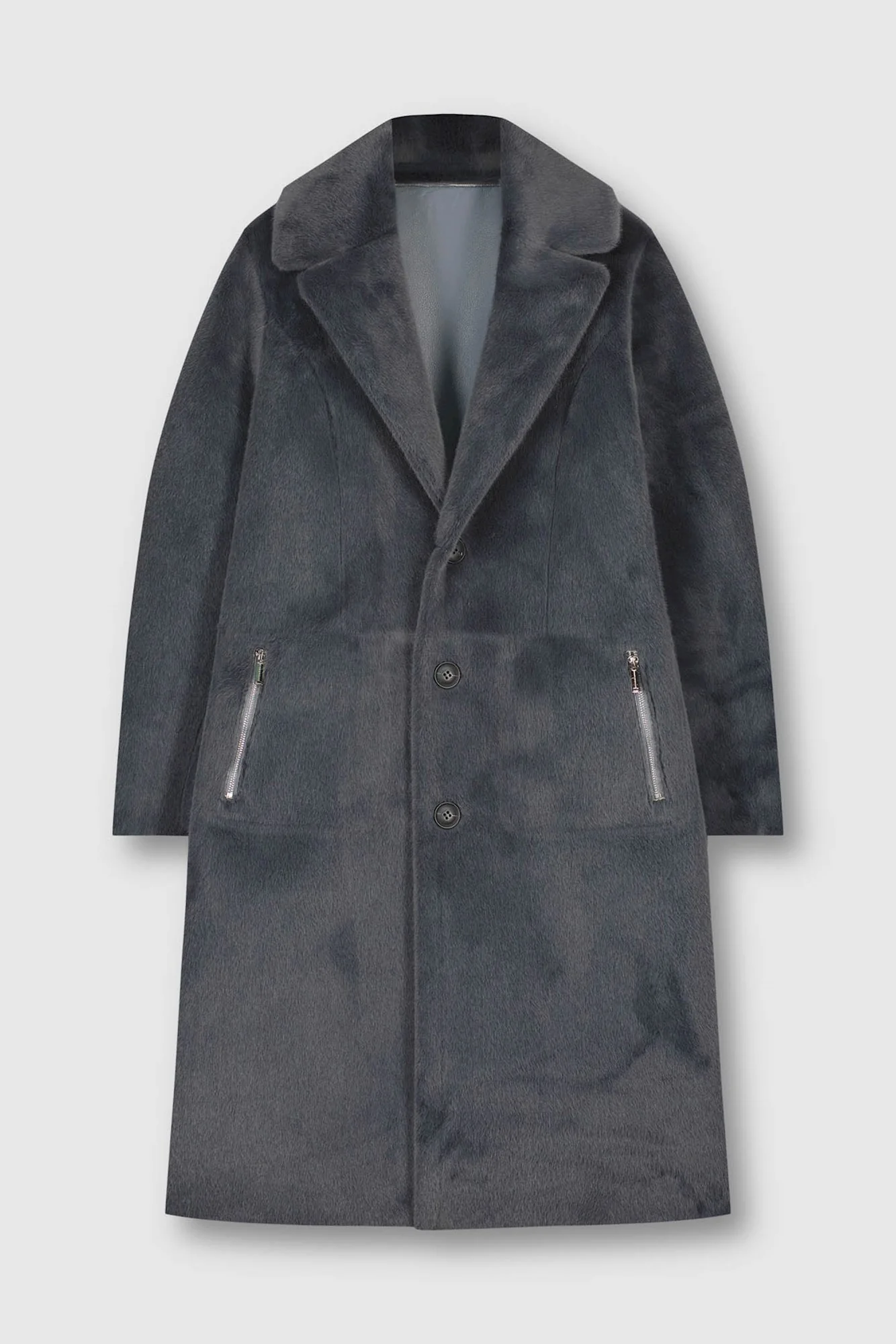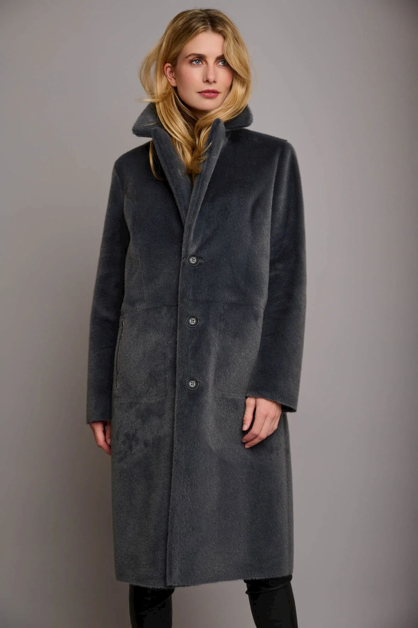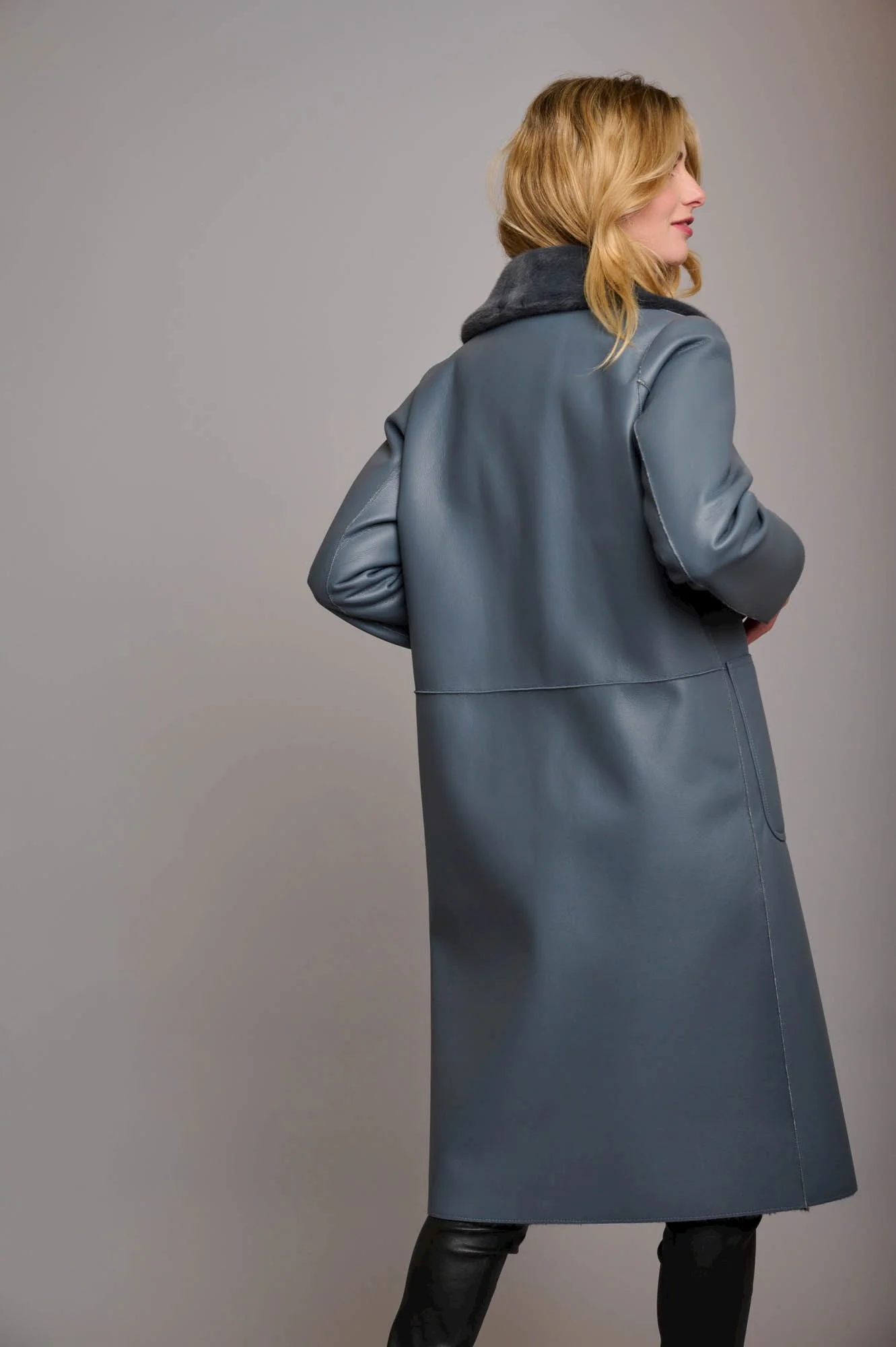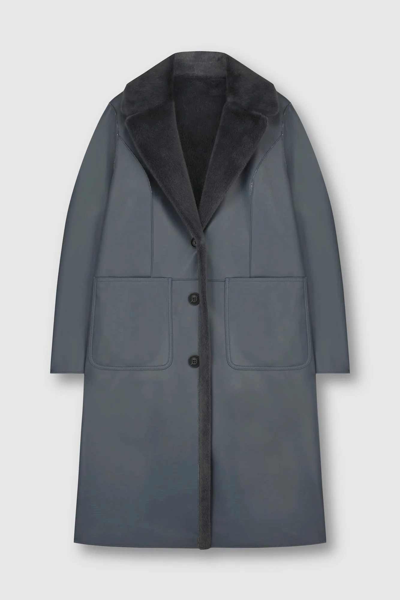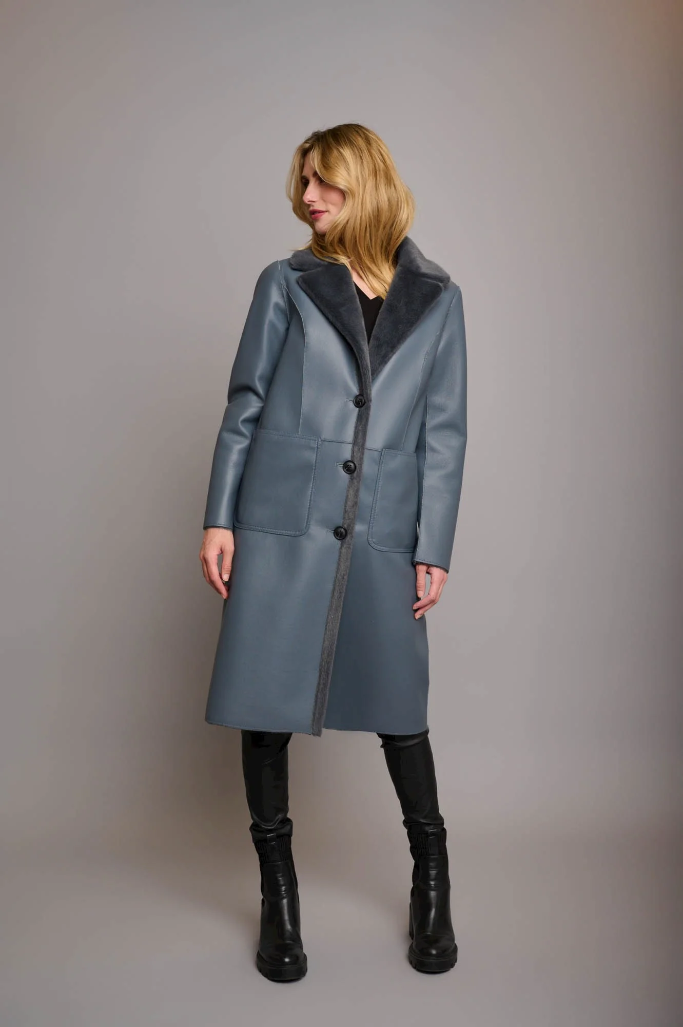 Cappotto lungo reversibile in ecopelle.Chiusura monopetto con bottoni, colletto con revers e pince. Due tasche frontali su un reverse e dall'altro due tasche laterali con chiusura a cerniera.