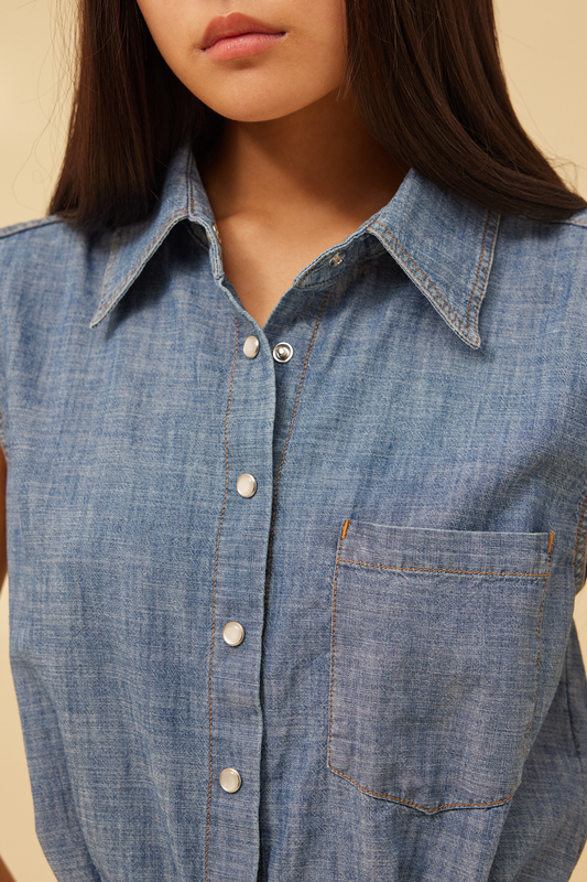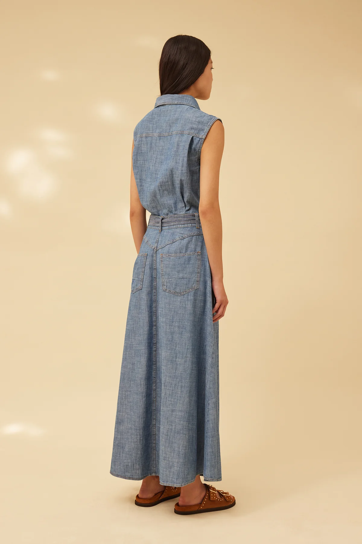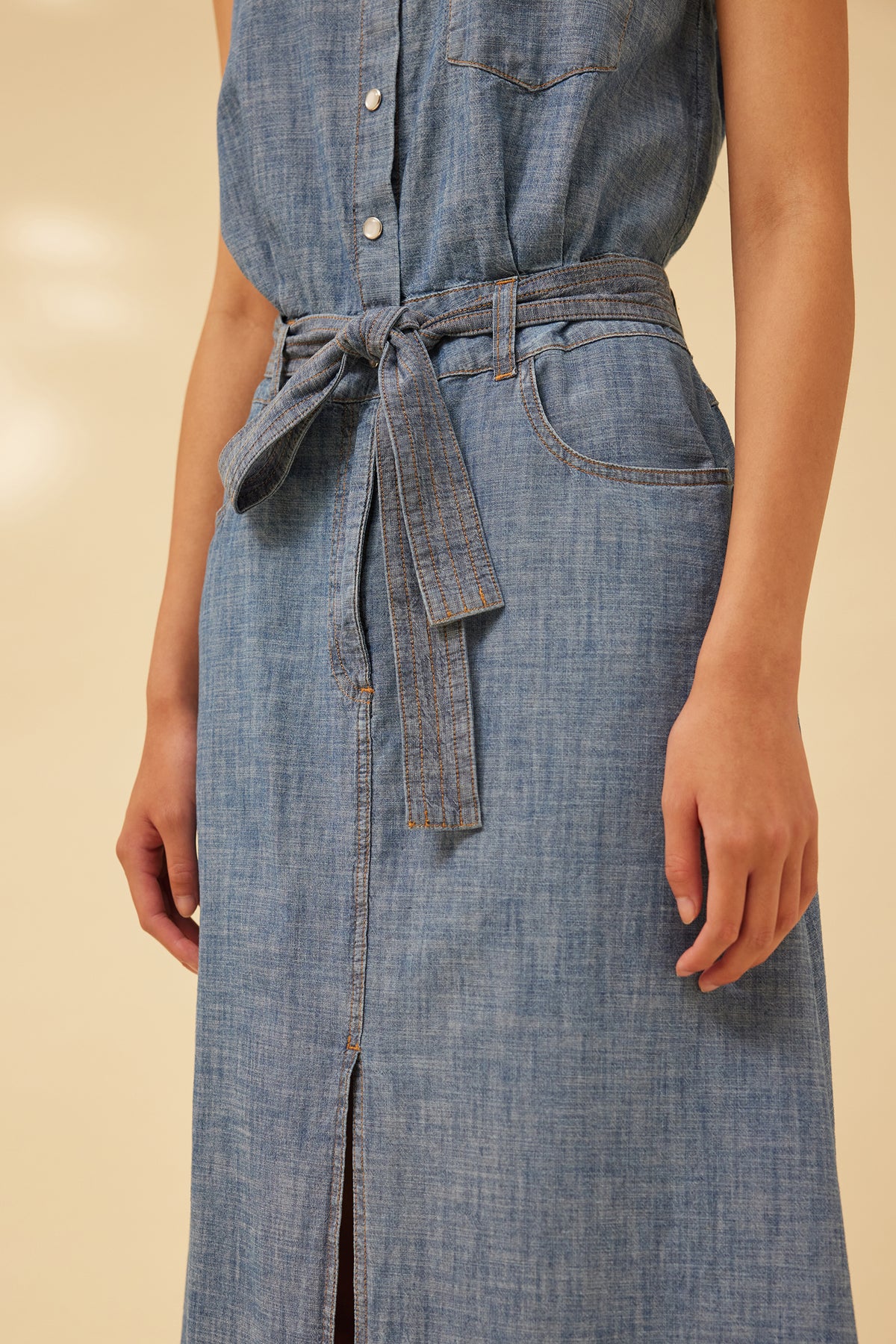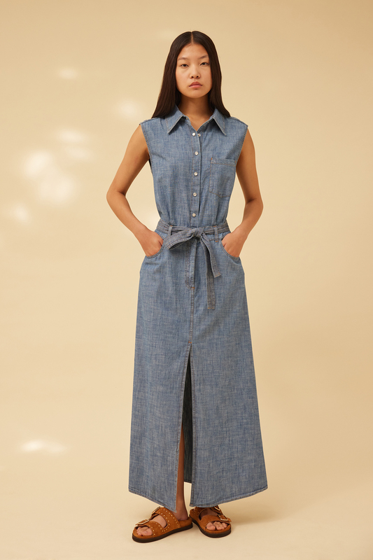 abito lungo smanicato in denim, con cintura in vita, taglio dritto, con spacco frontale