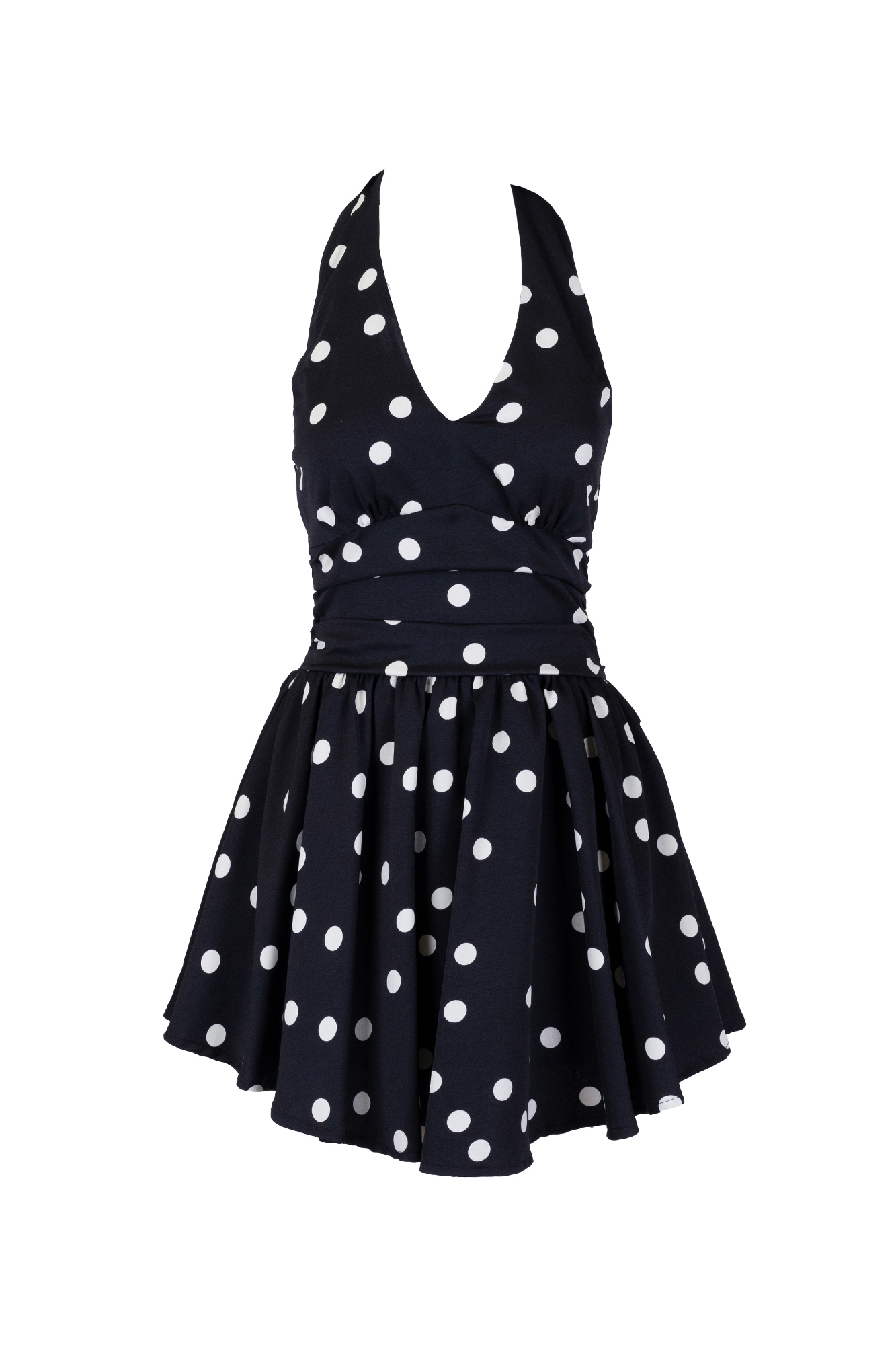 Abito corto a pois , scollo all'americana, fiocco/spilla staccabile sul retro. Composizione: 100% poly.