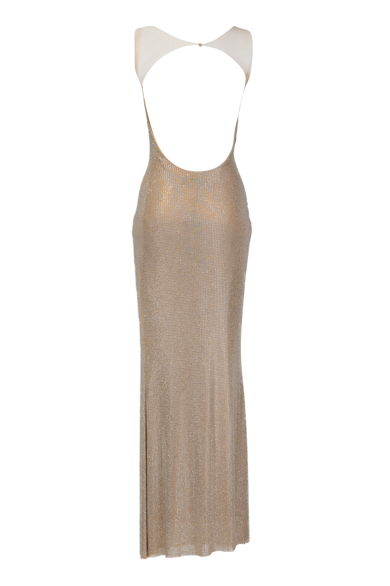 Abito full strass base nude, tessuto elasticizzato, spalline nude con chiusura sulla schiena.