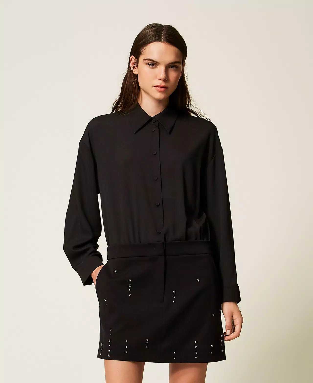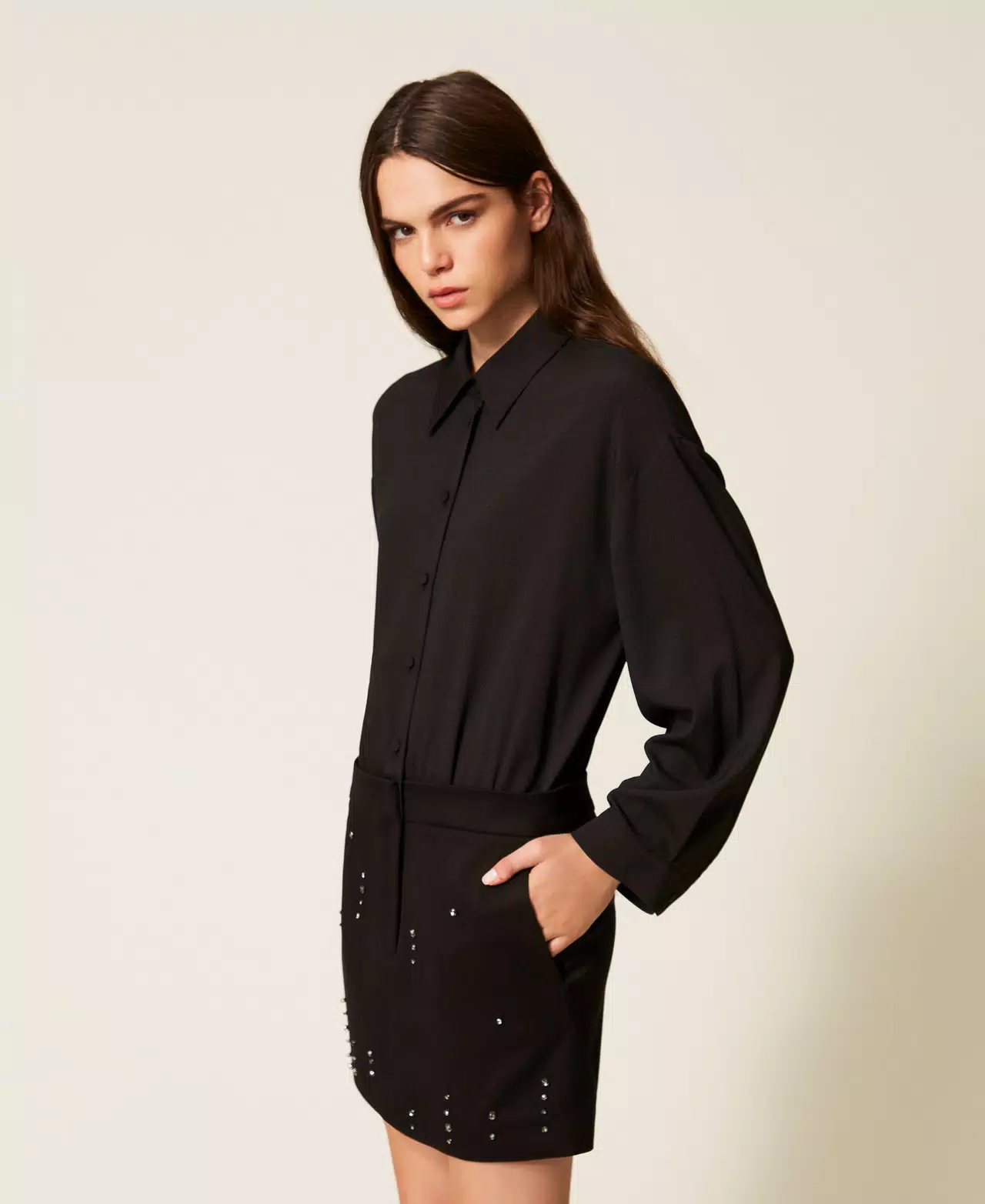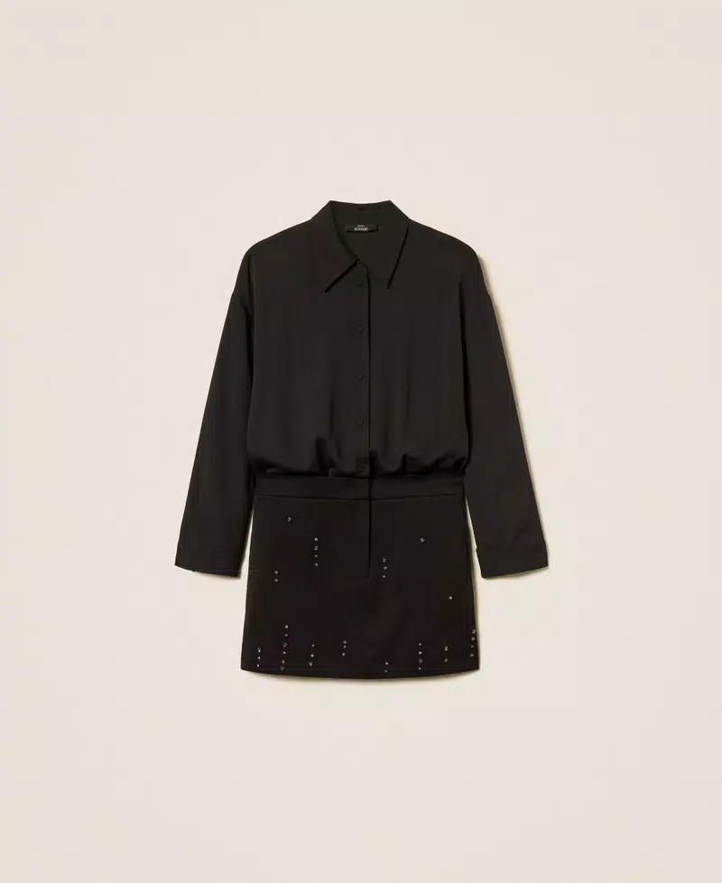 Abito corto collezione Actitude con parte superiore costruita a camicia in crêpe de Chine e gonna in tessuto tecnico. Ha castoni applicati a mano sulla parte davanti della gonna, chiusura con bottoni ricoperti sul corpetto, zip e gancio a uomo, linea morbida.