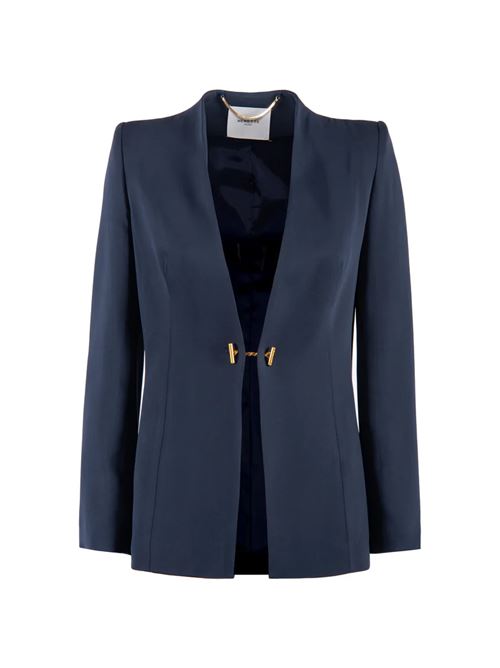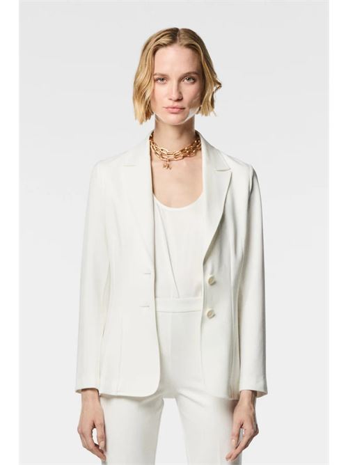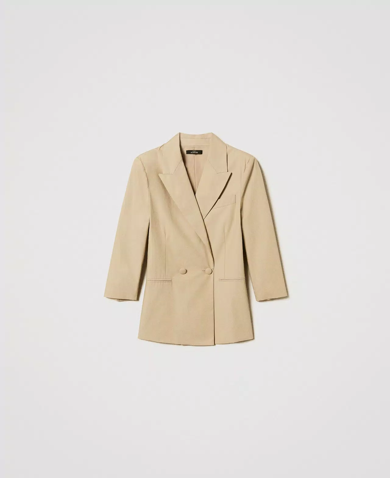 Giacca blazer collezione Actitude Revive in popeline con il 20% di cotone riciclato post consumer. Ha chiusura doppiopetto con bottoni ricoperti, maniche a tre quarti, tasche a doppio filetto, fodera in mussola di cotone e linea dritta. Il modello fa parte del conscious program Revive di Actitude by Twinset.