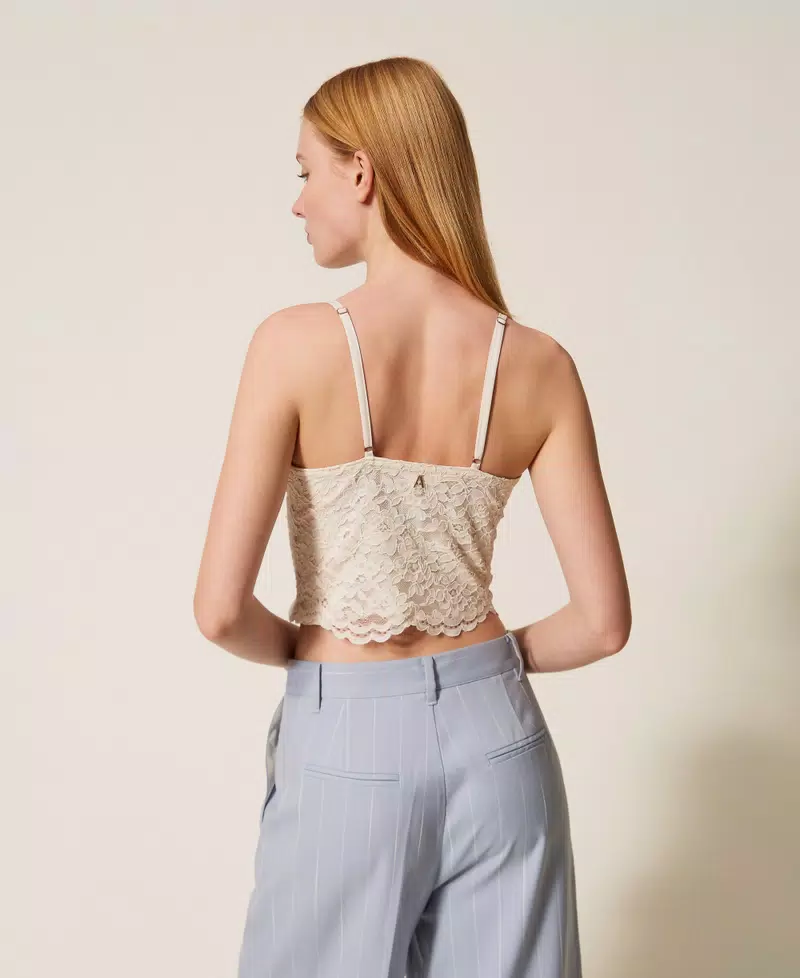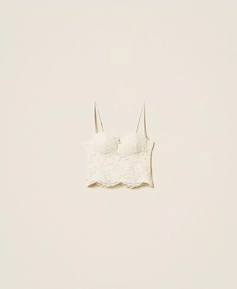 Top bustier in pizzo, spalline regolabili e staccabili, zip invisibile sul fianco.